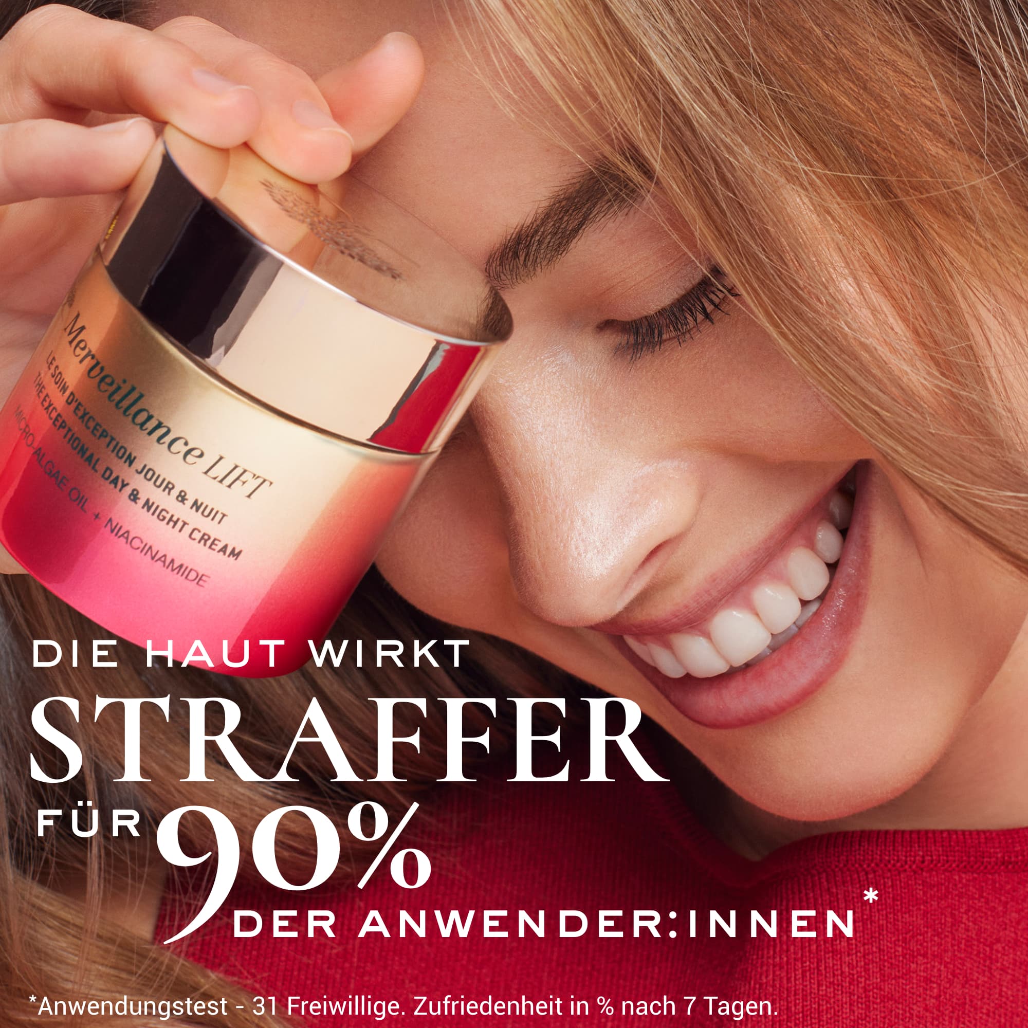 | Anwendungshinweis | Entnehmen Sie eine großzügige Menge, erwärmen Sie sie zwischen den Handflächen und tauchen Sie ein in die Welt der außergewöhnlichen Tages- und Nachtpflege von Merveillance Lift. Mit flachen Händen auf das Gesicht auftragen und dabei stets von der Gesichtsmitte nach außen arbeiten (Augenkontur aussparen). Erweitern Sie die Anwendung gerne auf Hals und Dekolleté. Massieren Sie das Produkt sanft ein, bis es vollständig von der Haut aufgenommen wurde. Für einen strahlenden Glow die Gesichtshaut zum Abschluss leicht abklopfen. Morgens und abends anwenden – idealerweise nach dem NUXE-Serum. |