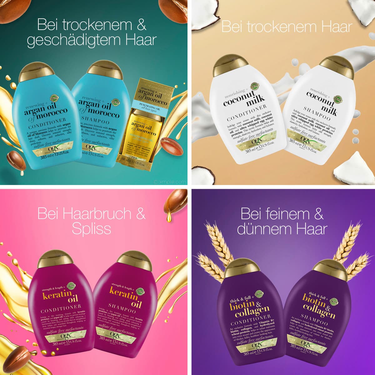 | Anwendungshinweis | Vom Ansatz bis zu den Spitzen in das feuchte Haar sprühen. Durchkämmen, wie gewohnt föhnen und stylen. Für ein optimales Ergebnis zusammen mit anderen Haarpflegeprodukten von OGX verwenden. |