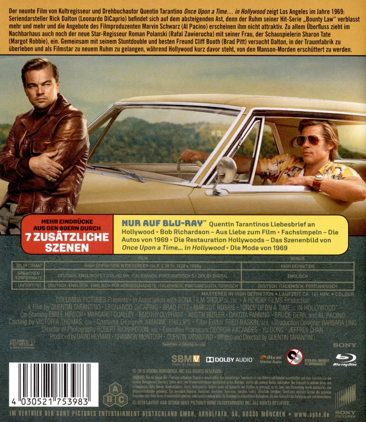 | Zusatzinfos / Bonusmaterial beim Film dabei | Quentin Tarantinos Liebesbrief an Hollywood; Bob Richardson - Aus Liebe zum Film; Fachsimpeln - Die Autos von 1969; Die Restauration Hollywoods - Das Szenenbild von; Once Upon a Time... in Hollywood; Die Mode von 1969; MEHR EINDRÜCKE AUS DEN 60ERN DURCH 7 ZUSÄTZLICHE SZENEN; |