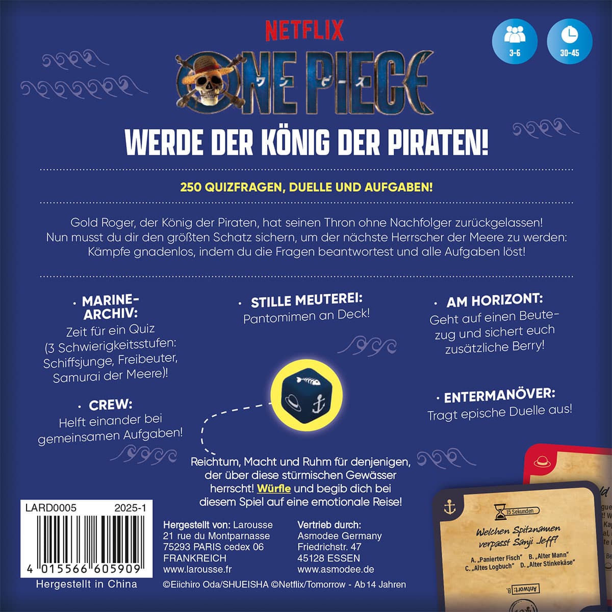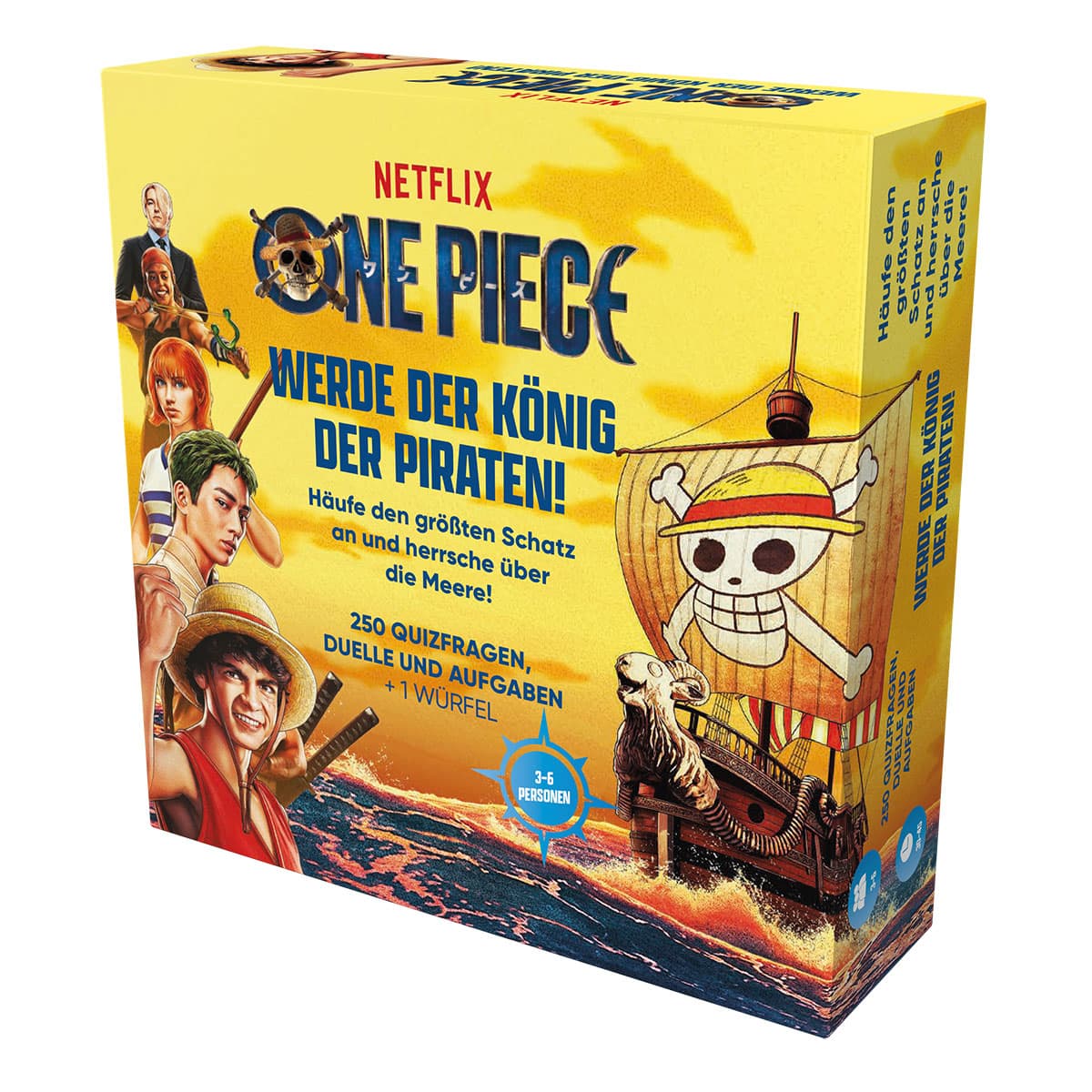 In One Piece: Werde der König der Piraten! Stellt ihr euch großen Herausforderungen, um der nächste Herrscher der Meere zu werden. In 5 verschiedenen Kategorien müsst ihr euer Wissen unter Beweis stellen, epische Duelle austragen oder in der Stillen Meuterei pantomimisch Hinweise geben. Euch erwarten über 250 spannende Quizfragen, Duelle und Aufgaben im Universum von One Piece.