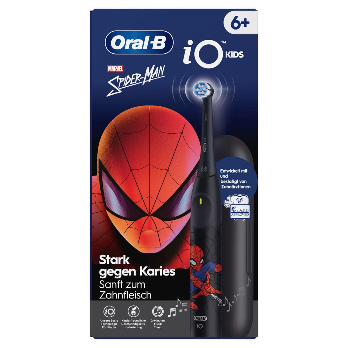 Die Oral-B iO Kids elektrische Zahnbürste sorgt für eine sanfte, effektive Reinigung und wurde mit ZahnärztInnen für Kinder ab 6 Jahren entwickelt und bestätigt. Sie verfügt über 3 Putzmodi, inkl. einem einzigartigen, kinderfreundlichen Super Sensitiv Modus, um stark gegen Karies, aber sanft zum Zahnfleisch zu sein und dabei mehr Plaque zu entfernen als eine herkömmliche Handzahnbürste. Der 2-Minuten-Musik-Timer und der Zugang zur Disney Magic Timer App sorgen für mehr Spaß beim Zähneputzen und helfen Kindern, gesunde Gewohnheiten fürs Leben zu erlernen.