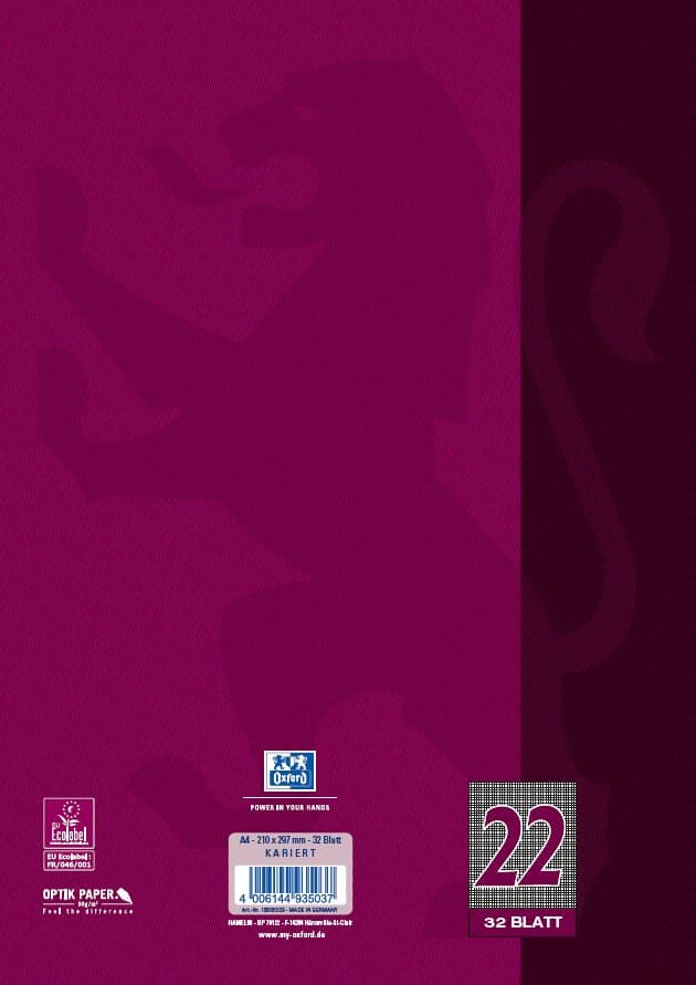OXFORD Schulheft A4, 32 Blatt, Lineatur 22, kariert, 90gm² Optik Paper.