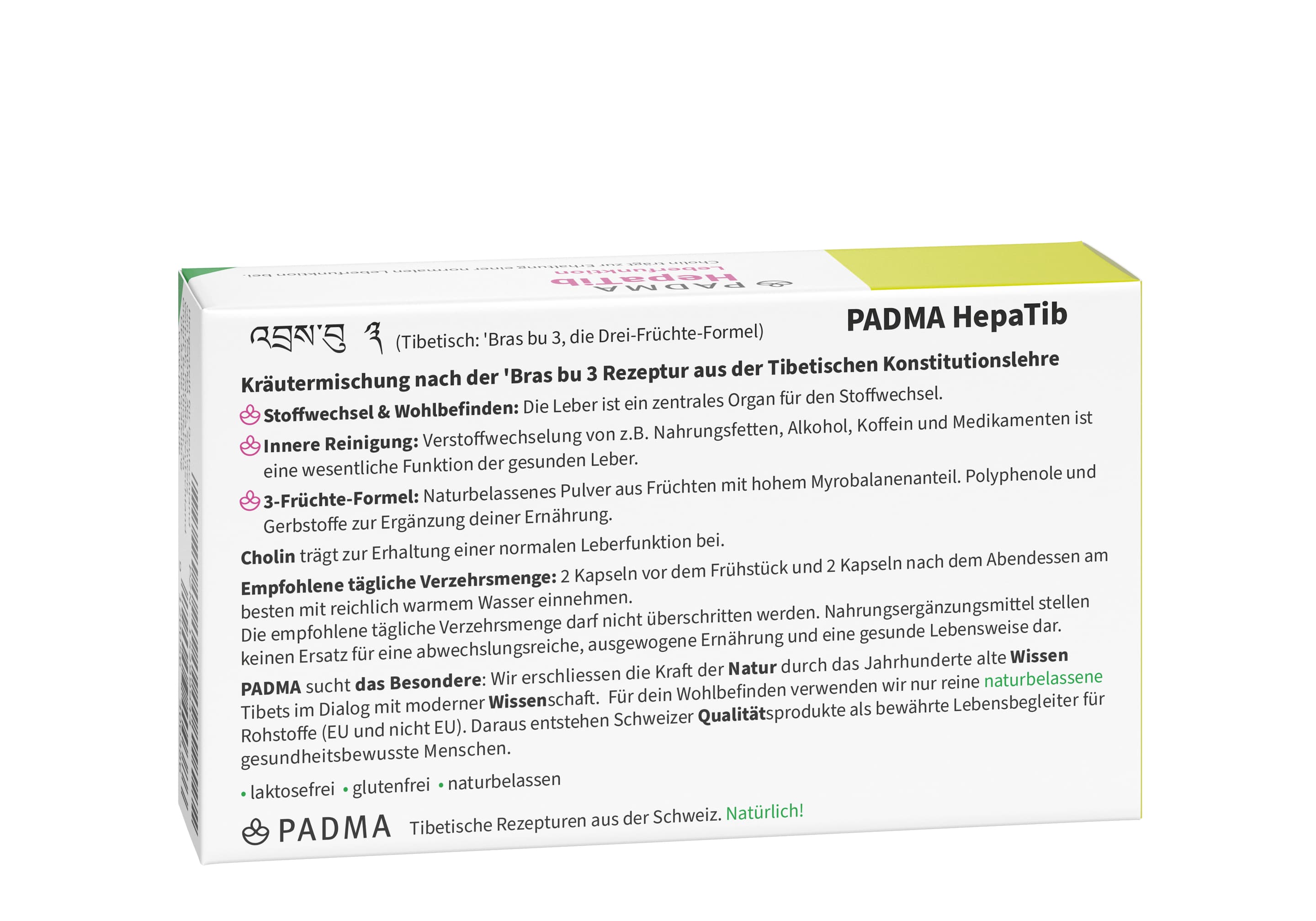 - IM RHYTHMUS VON TAG UND NACHT: Die Leber hat im 24h Verlauf zwei aktive Phasen. PADMA HepaTib mit Cholin unterstützt durch das enthaltene Cholin die Funktion der Leber vor allem während der nächtlichen Aktivphase. Die Tag-Phase, die Phase der Verdauung und Ausscheidung, kannst du mit PADMA GaLeTib mit Zink begleiten.