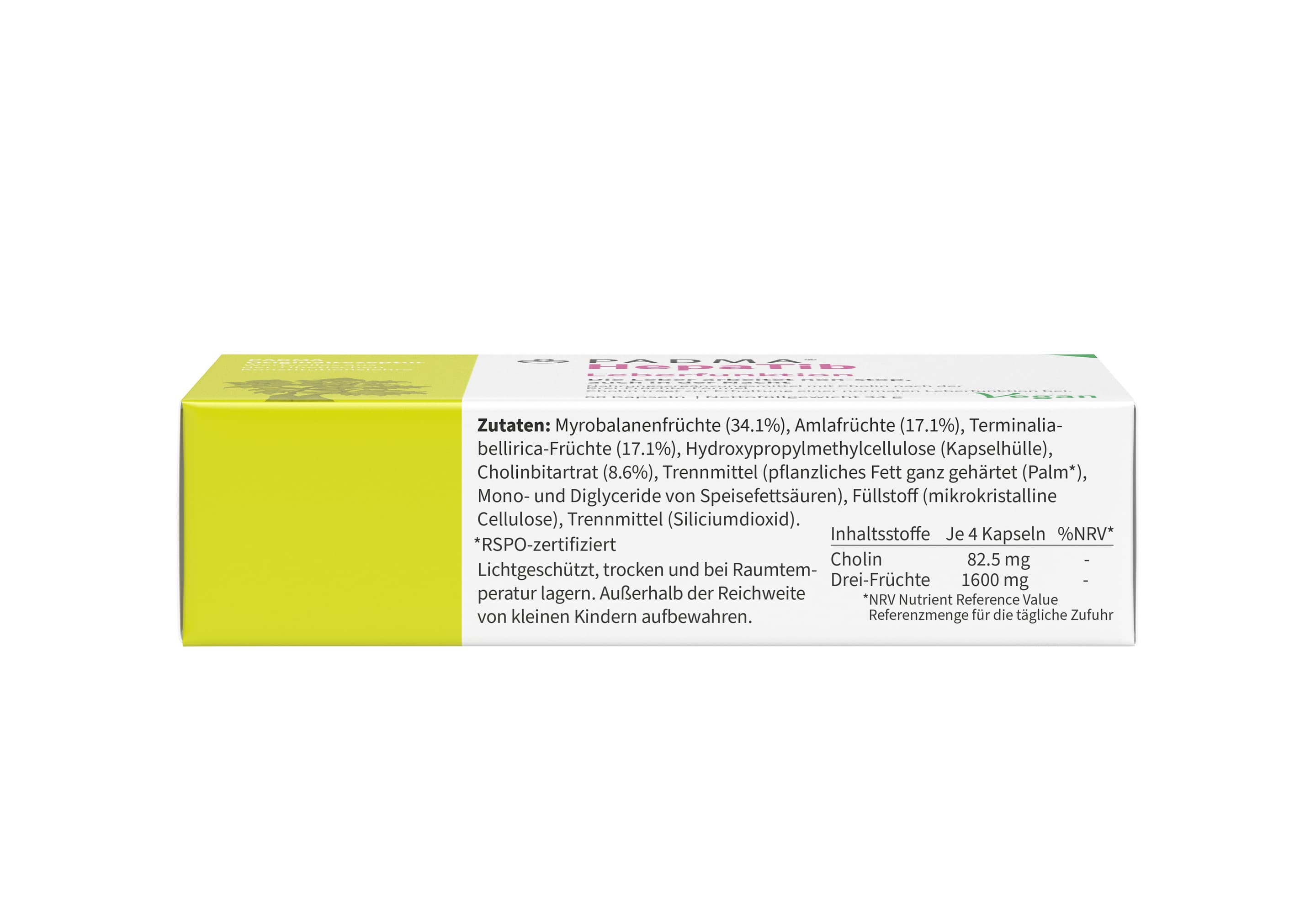 Nahrungsergänzungsmittel: Die Myrobalanen-Mischung aus 3 Früchten mit Cholin. Exakt aufeinander abgestimmte, naturbelassene Kräuter und Gewürze mit dem herbsäuerlichen, bitteren und lebhaften Geschmacksprofil von Myrobalane, Amlafrucht und Terminalia-bellirica-Frucht. Der Geschmack ist die Strategie der Natur, mit dem Menschen in Kontakt zu treten.