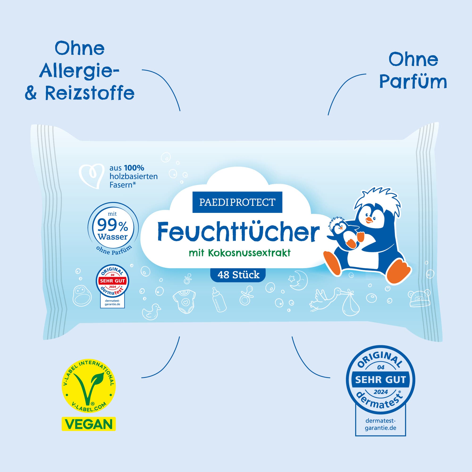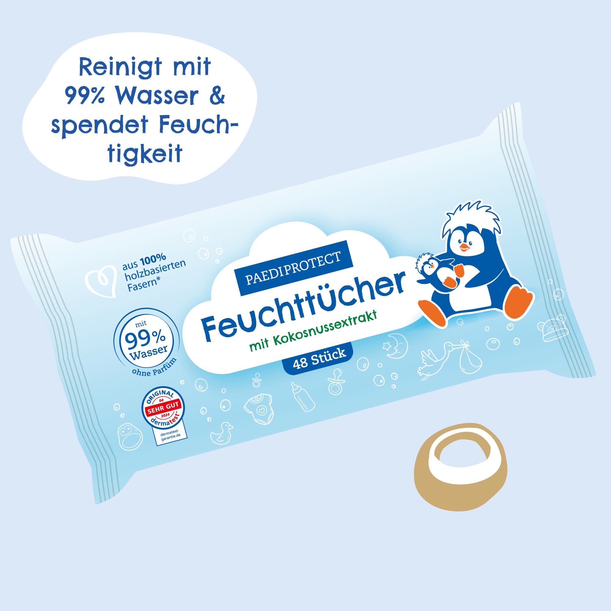 Die PAEDIPROTECT Feuchttücher sind für die besonders milde Reinigung der zarten Babyhaut konzipiert.