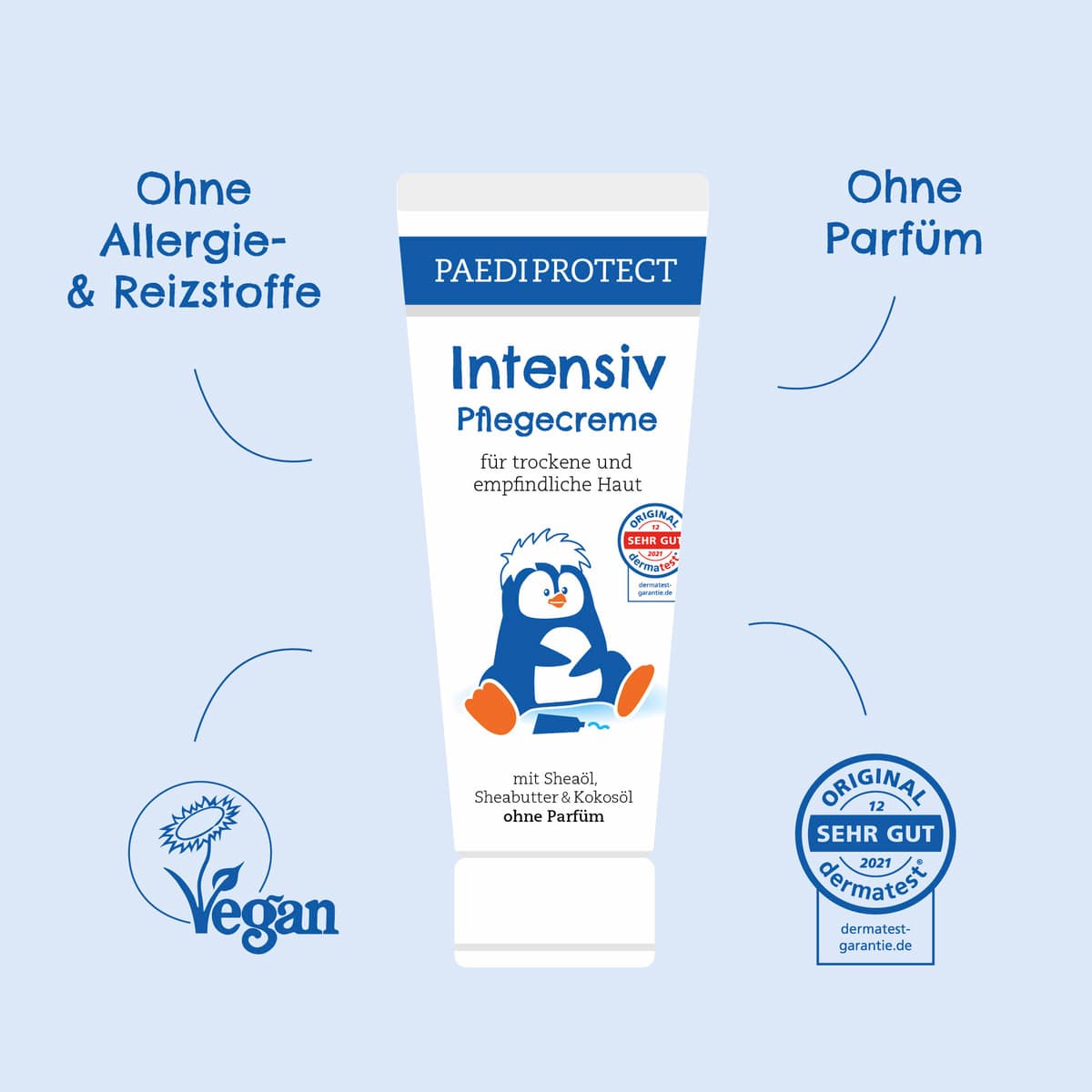 Die PAEDIPROTECT Intensiv-Pflegecreme mit Shea Butter und Kokosöl versorgt besonders trockene und raue Hautstellen mit einer Extra-Portion Feuchtigkeit. Die reichhaltige Rezeptur nährt empfindliche Haut intensiv und hinterlässt dabei trotzdem keinen fettigen Film. Süßholzwurzelextrakt wirkt beruhigend und stärkt die Hautschutzbarriere. Vielseitig einsetzbar. Damit ergänzt sie unser sanftes Pflege-Sortiment perfekt. Natürlich vegan, parfümfrei und ohne Mikroplastik.