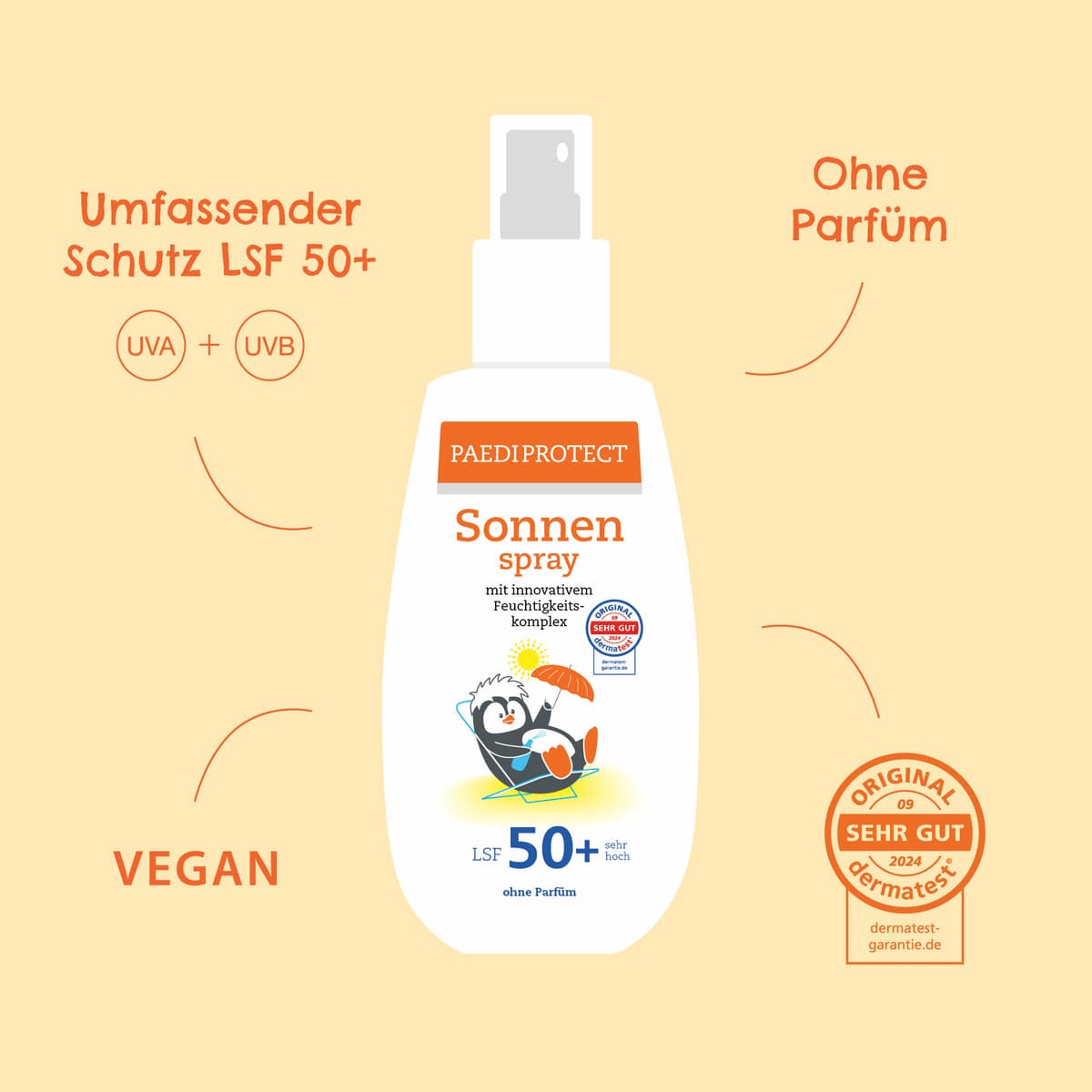 Das Sonnenspray ist ideal für unterwegs und verbindet sehr hohen Schutz mit einfacher Anwendung für den ganzen Körper. Die leichte Formulierung lässt sich einfach verreiben, zieht schnell ein und klebt nicht. Außerdem wird die Haut durch den innovativen Feuchtigkeitskomplex gepflegt und trocknet nicht aus. So sind die Kids in Windeseile eingecremt und dank moderner, hautverträglicher UV-Filter mit LSF 50+ zuverlässig vor der Sonne geschützt. Auch bei mehrmaligem Auftrag hinterlässt das Sonnenspray keinen Film und ist somit super geeignet, um im Laufe des Tages den Sonnenschutz aufrecht zu erhalten.