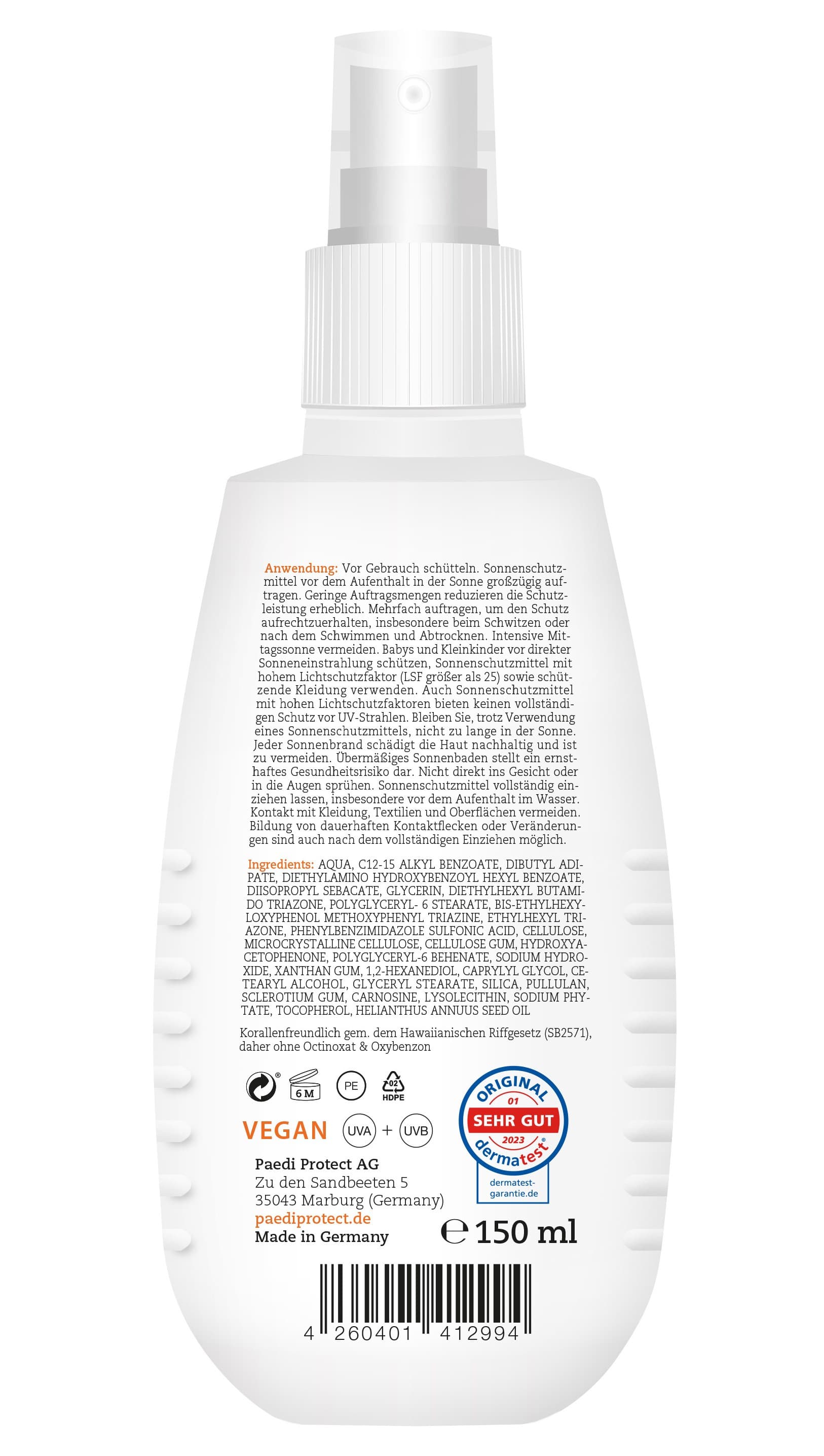 AnwendungshinweisTrage vor dem Gang ins Freie das Sonnenspray großzügig auf den ganzen Körper auf. Kinder benötigen etwa einen Esslöffel Produkt pro Körperregion, Erwachsene zwei. Geringe Auftragsmengen verringern den Schutz erheblich. Spätestens alle 2 Stunden und unmittelbar nach dem Schwitzen, Schwimmen oder Abtrocknen solltet ihr nachcremen, um den Schutz aufrecht zu erhalten. Babys und Kleinkinder sollten nicht der direkten Sonne ausgesetzt werden und zudem schützende Kleidung tragen. Die intensive Mittagssonne solltet ihr als Familie grundsätzlich meiden. Um dauerhafte Flecken vorzubeugen, solltet ihr den Kontakt mit Textilien und Oberflächen meiden. Am besten erst eincremen, kurz einziehen lassen und erst dann anziehen. Auch Sonnenschutzmittel mit hohen Lichtschutzfaktoren bieten keinen vollständigen Schutz vor UV-Strahlen. Übermäßiges Sonnenbaden erhöht langfristig das Krebsrisiko und kann zu frühzeitiger Hautalterung führen. Nicht auf offene Hautstellen auftragen und Kontakt mit den Augen vermeiden.