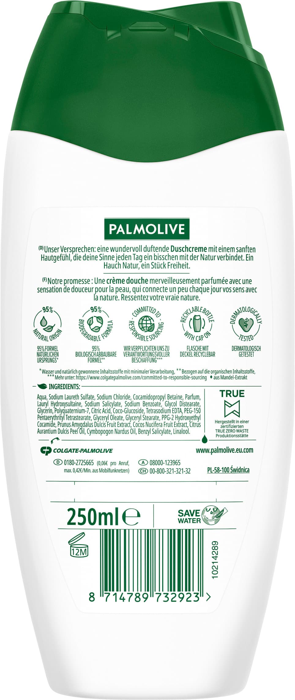 Mach jede Dusche zu einem pflegenden und duftenden Erlebnis, wenn du dich mit Palmolive Naturals Kokosnuss&Milch Duschcreme duschst. Diese Körperreinigung mit Mandelmilch ist von der Natur inspiriert und verwöhnt deine Sinne mit einem herrlichen Kokosnuss-Duft, gemischt mit der frischen Fruchtigkeit der grünen Mango. Die Duschcreme ist mit Vitamin E angereichert und hinterlässt ein weiches und gepflegtes Hautgefühl nach jeder Dusche. Außerdem hat sie eine neue und verbesserte Formel♥! Unsere vegane Duschcreme für empfindliche Haut enthält nicht nur pflanzliche Milch, sondern auch Inhaltsstoffe, die zu 95 % natürlichen Ursprungs sind♦ und zu 98 % biologisch abbaubar♥. Diese Duschcreme wird in einer Flasche geliefert, die du recyceln kannst. Palmolive engagiert sich für eine verantwortungsvolle Beschaffung. Dieses Produkt wird in einer zertifizierten TRUE ZERO WASTE Produktionsstätte hergestellt♣. Pflege deine Haut mit Palmolive und sorge für ein fabelhaftes Hautgefühl. ♦Wasser und natürlich gewonnene Inhaltsstoffe mit minimaler Verarbeitung ♥Erhöhte biologische Abbaubarkeit bis zu 98%; bezogen auf die organischen Inhaltsstoffe ♣Mehr Info auf: www.palmolive.de/who-we-are/naturalworld