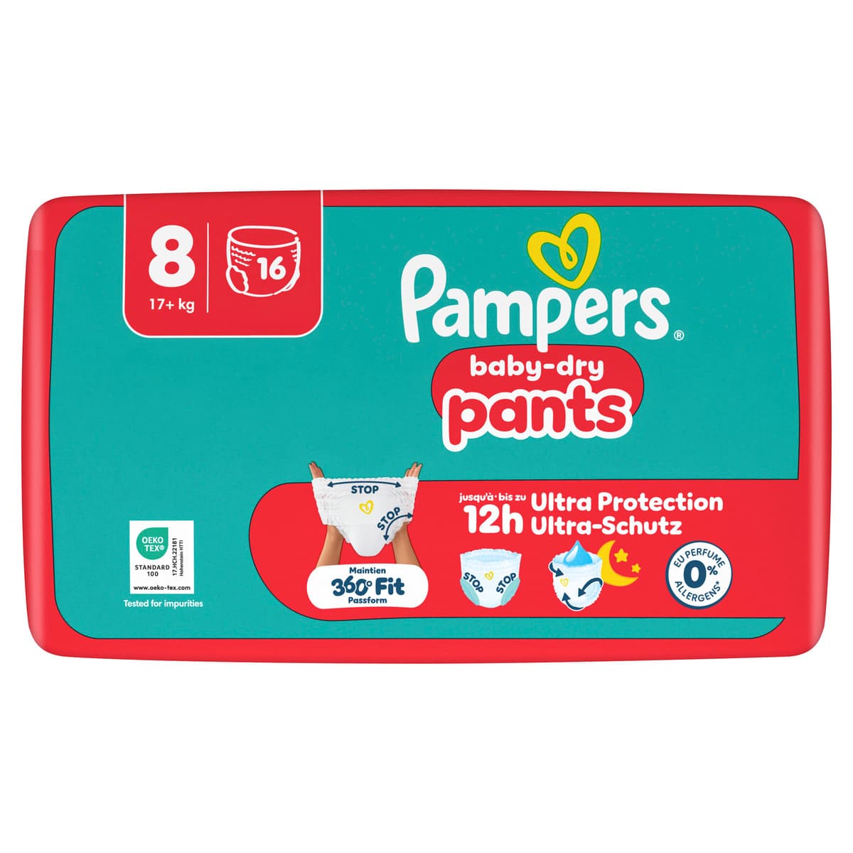 Wenn dein Baby aktiver wird, braucht es eine Pants, die bequem sitzt, zuverlässigen Schutz bietet und jede Bewegung mitmacht. Mit ihrem revolutionären Stop & Schutz System bieten Pampers Baby-Dry Pants überlegenen Rundum-Auslaufschutz, egal in welcher Position sich dein Baby befindet - Tag und Nacht! Das Stop & Schutz System der Pampers Baby-Dry Pants umfasst: Anti-Auslaufbündchen an den Beinchen, 360° Passform am Bauch, die sich den Bewegungen deines aktiven Babys anpasst, und einen super saugfähigen Kern für bis zu 12 Stunden Schutz. Wie all unsere Pants lassen sich auch Baby-Dry Pants leicht wechseln, selbst wenn dein Baby sich bewegt: zum Anziehen Pants einfach hochziehen, zum Ausziehen die Seitenbündchen aufreißen, einrollen und dank Klebestreifen einfach entsorgen. Genau wie für dich steht die Sicherheit deines Babys auch für Pampers an erster Stelle: Pampers Baby-Dry Pants sind dermatologisch getestet, enthalten 0% EU-Parfümallergene (keine absichtlich hinzugefügten EU-Parfümallergene gemäß der EU-Kosmetikverordnung (EG) Nr. 1223/2009) und sind OEKO-TEX STANDARD 100 getestet und zertifiziert. Möchtest du mehr über die Bestandteile unserer Produkte erfahren? Besuche uns auf pampers.de, pampers.at und pampers.ch.