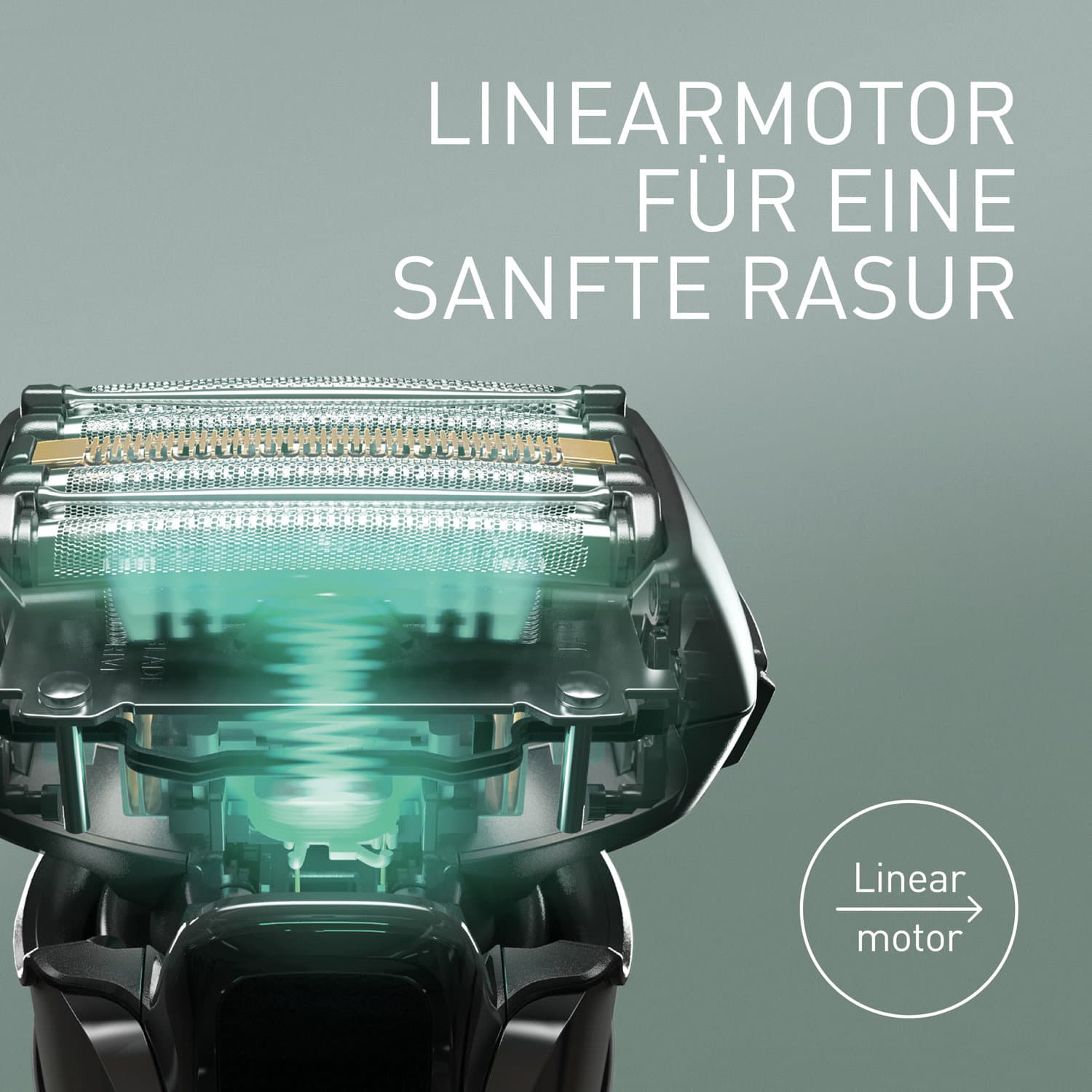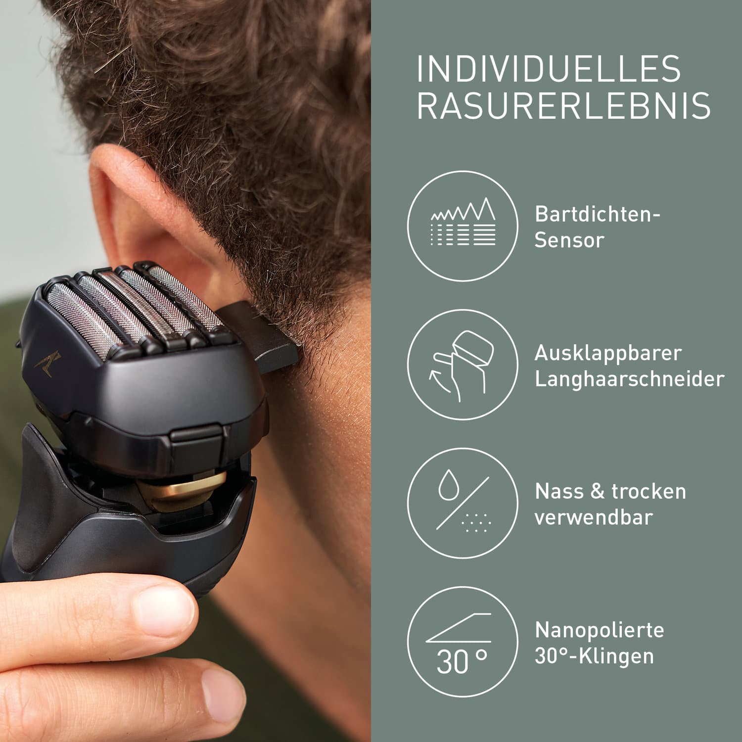 Der Panasonic Series 800 ES‑LV97 Premium Nass-/Trockenrasierer bietet dank fünf präziser japanischer Klingen eine besonders gründliche und zugleich sanfte Rasur. Sein flexibler 16‑D‑Scherkopf passt sich optimal den Gesichtskonturen an und erfasst Haare effektiv in einem Zug. Mit 70.000 Schneidebewegungen pro Minute, nanopolierten 30°‑Klingen und dem kraftvollen Linearmotor liefert der ES‑LV97 dauerhaft starke Leistung. Der intelligente Bartdichtesensor passt die Motorleistung in Echtzeit an und reduziert dadurch Hautirritationen. Für eine hygienische Reinigung kann der Rasierer entweder in der automatischen Reinigungs- und Ladestation oder unter fließendem Wasser gereinigt werden. Optisch überzeugt das Gerät zudem mit seinem hochwertigen Premiumdesign.