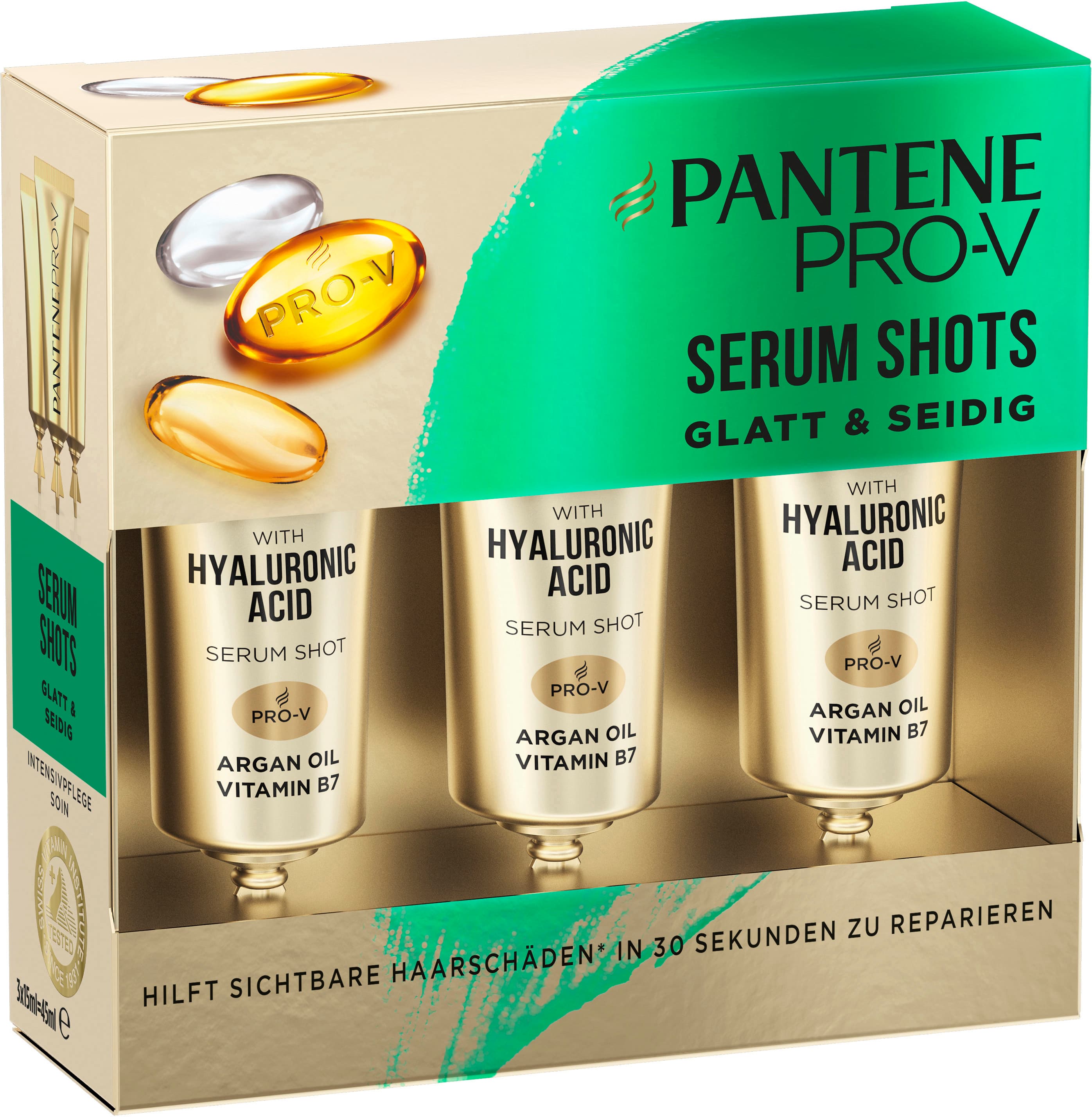 Entdecke die Pantene Pro-V Glatt&Seidig Keratin Haarserum Shots mit Pro-V Formel und ACTIVE NUTRI-PLEX-Technologie. Mit Hyaloronsäure, Arganöl und Vitamin B7 regenerieren diese Ampullen dein Haar von innen heraus und helfen, sichtbare Schäden* in nur 30 Sekunden zu reparieren. Erlebe die sofortige Wirksamkeit von Pantene Pro-Vs kleinster und dennoch tiefenwirksamster Formel für den Schutz deiner Haare und gib deinem Haar die Pflege, die es verdient. *Von oberflächlichen Haarschäden zu Geschmeidigkeit