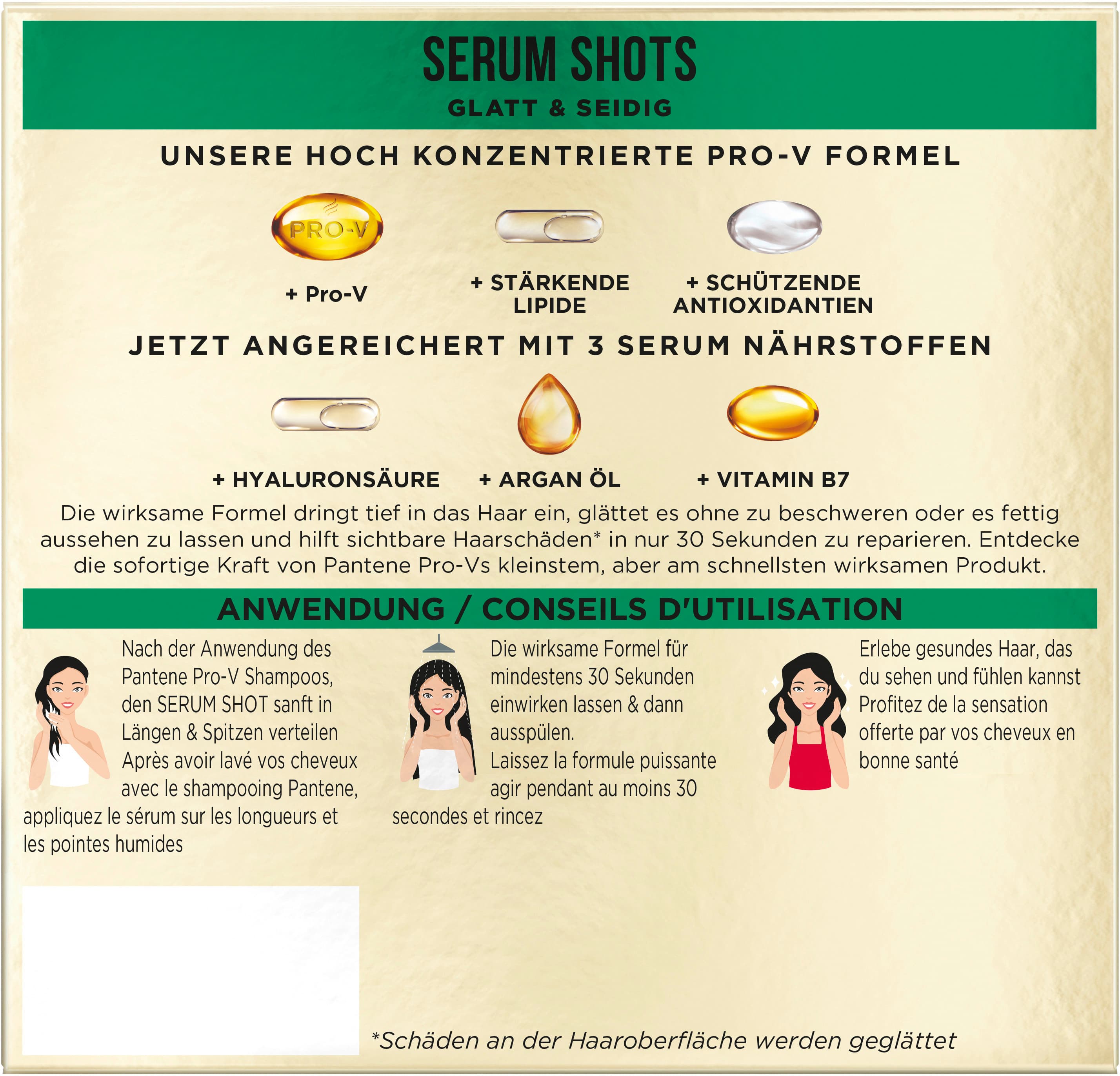 | Anwendungshinweis | Nach der Anwendung des Pantene Pro-V Shampoos, den SERUM SHOT sanft in Längen & Spitzen verteilen. Die wirksame Formel für mindestens 30 Sekunden einwirken lassen & dann ausspülen. Erlebe gesundes Haar, das du sehen und fühlen kannst. |