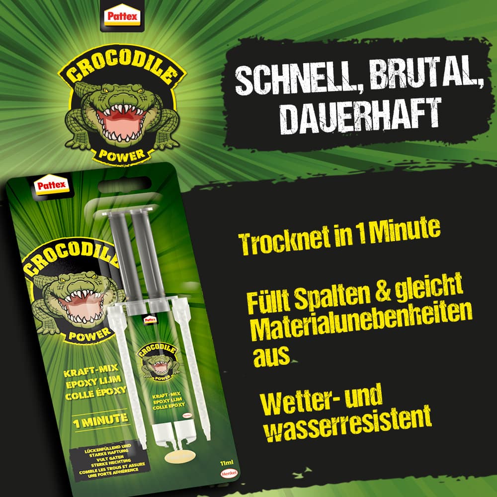 Schnell, brutal und dauerhaft: Mit dem Pattex Epoxy Kleber können unebene Flächen schnell verklebt werden!Der Pattex Crocodile Power Kraft-Mix ist die richtige Wahl, wenn unebene Oberflächen schnell verbunden werden sollen. Der 2-Komponenten-Kleber überzeugt mit seiner Aushärtungszeit von nur 1 Minute, selbst bei anspruchsvollen Aufgaben. Außerdem füllt der Klebstoff Spalten und Materialunebenheiten aus. Als starker Kleber erzielt der Kraft-Mix feste Verbindungen auf einer Vielzahl von flexiblen und starren Materialien* wie Holz, Metall, Beton, Kunststoff und vielen Weiteren. Dank seiner wetter- und wasserresistenten Eigenschaften kann der Epoxidharz Kleber sowohl für Innen- als auch Außenbereiche verwendet werden – für langanhaltende, starke Ergebnisse.Alle Vorteile:- Starker 2K-Kleber für innen und außen- Schnelle Aushärtungszeit- Wetter-&wasserresistent- Mit Instant-Mix Spritze- Für viele Materialien*- Spaltfüllend- Inhalt: 1x11ml, TransparentWie man das Crocodile scharf macht: 1. Die Beute präparieren. Klebeflächen müssen sauber, trocken, staub- und fettfrei sein. Aufgeraute Oberflächen für eine bessere Haftung. 2. Das Biest anlocken. Dichtung auf der Spritze aufbrechen. Düse über der Spritzenöffnung anbringen und um 90° drehen, bis es einrastet. 3. Das Crocodile füttern. Kolben drücken, um das Epoxy Resin zu dosieren. Nur auf eine Klebefläche auftragen und fest zusammendrücken. 4. Ihm'ne Pause gönnen. Klebeflächen innerhalb von 30 Sekunden zusammenfügen, spätestens nach 1 Minute beginnt die Aushärtung! Endfestigkeit nach 24 Stunden.*Nicht geeignet für PP, PE, PTFE; für Verklebungen von Autospiegeln auf die Windschutzscheibe und für Verklebungen auf großen Glasflächen.