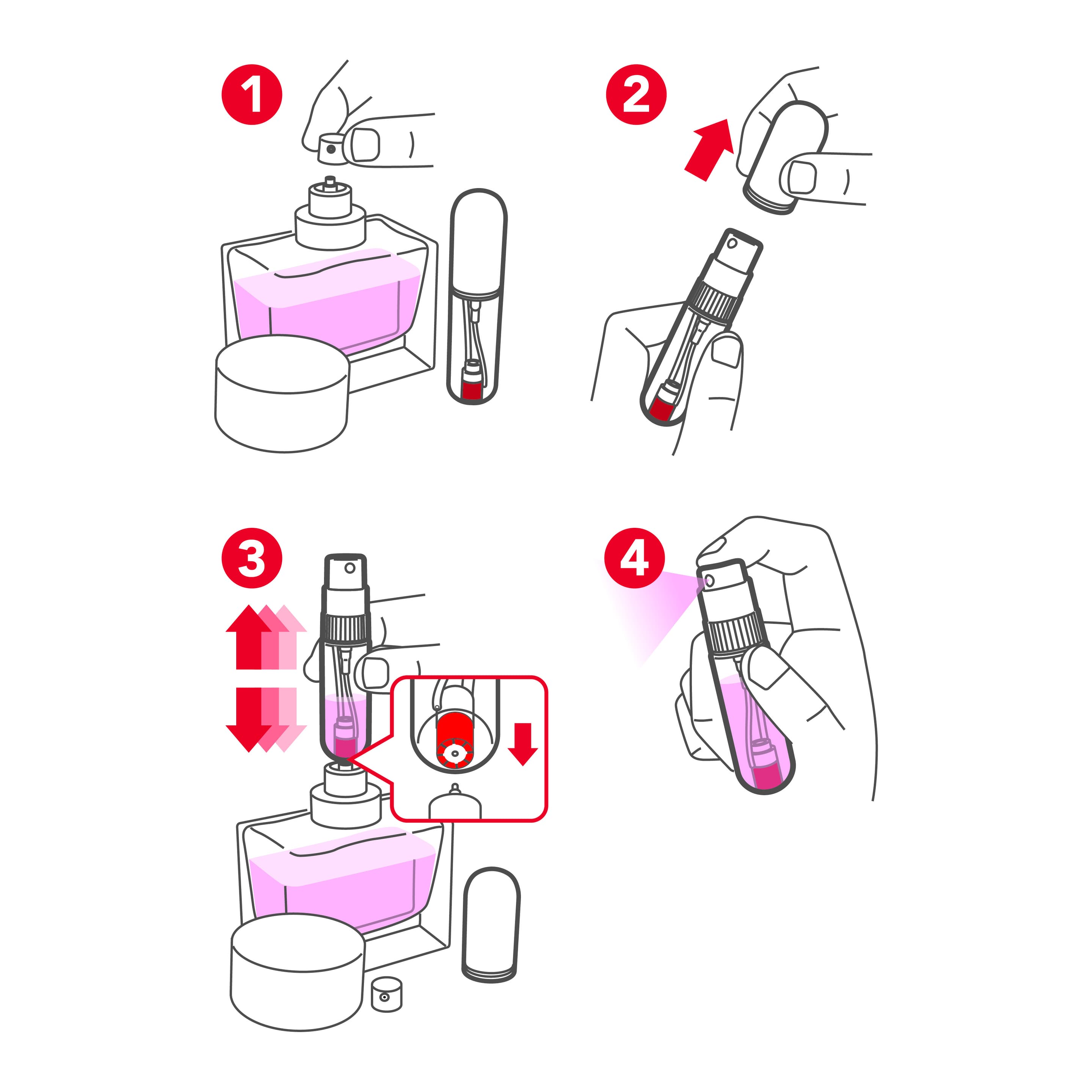 AnwendungshinweisNehmen Sie den Zerstäuberkopf vom Flakon Ihres Parfums ab. Setzen Sie den Perfume Pod gerade auf die Zerstäuberdüse auf. Pumpen Sie Parfüm hoch, indem Sie ihn mehrmals auf- und ab bewegen. Anhand der Füllstandsanzeige können Sie ablesen, wie viel bereits im Zerstäuber ist. Binnen weniger Sekunden ist Ihr Perfume Pod gefüllt.
