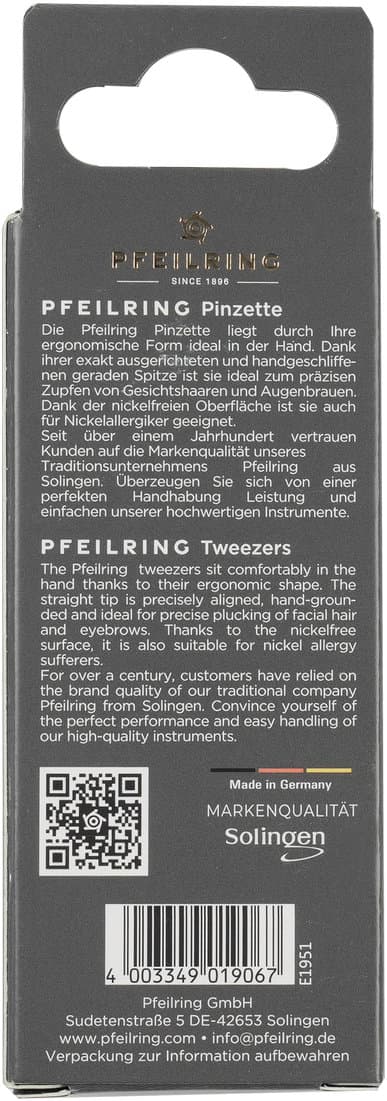 Die PFEILRING Kosmetikpinzette aus nickelfreiem Stahl liegt durch Ihre ergonomische Form ideal in der Hand. Dank ihrer exakt ausgerichteten und handgeschliffenen geraden Spitze ist sie ideal zum präzisen Zupfen von Gesichtshaaren und Augenbrauen.
