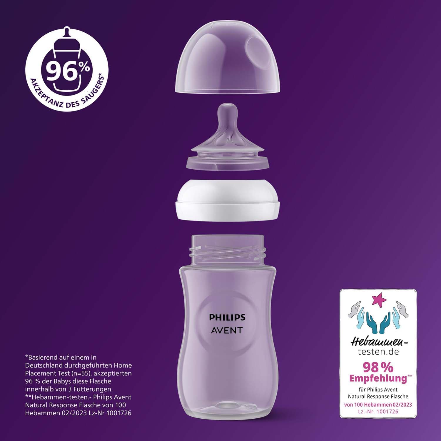 Die Philips Avent Natural Response Babyflasche SCY903/66 unterstützt den natürlichen Trinkrhythmus deines Babys beim Saugen, Schlucken und Atmen. Der Sauger mit mittlerer Durchflussrate gibt Milch nur ab, wenn das Baby aktiv trinkt, wodurch Verschlucken verhindert wird und der Wechsel zwischen Stillen und Flasche erleichtert wird. Das breite, weiche Silikondesign imitiert die Brustform und ermöglicht ein naturnahes Trinken. Ergonomische Form und kleine Griffe sorgen dafür, dass die Flasche bequem gehalten werden kann. Das Anti-Kolik-Ventil leitet Luft vom Bauch weg und reduziert Koliken sowie Unwohlsein. Tropfsicheres Design verhindert Verschütten, während die Flasche leicht zu reinigen und schnell zusammenzusetzen ist. BPA-freie Materialien gewährleisten Sicherheit, und verschiedene Saugerstufen passen sich dem individuellen Trinkverhalten an. Gib dem Baby Zeit, sich an den Sauger zu gewöhnen, für ein entspanntes und stressfreies Füttern.