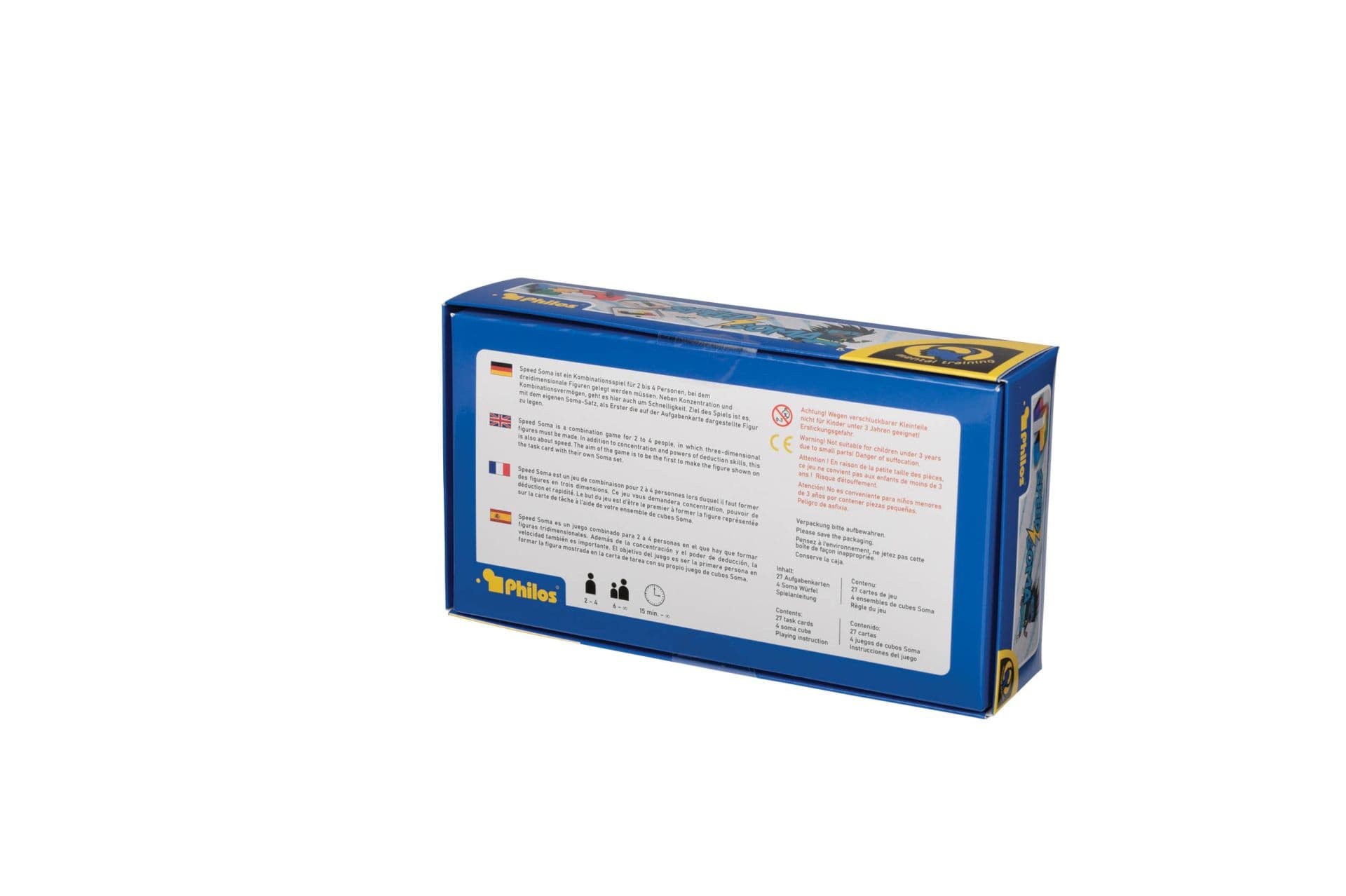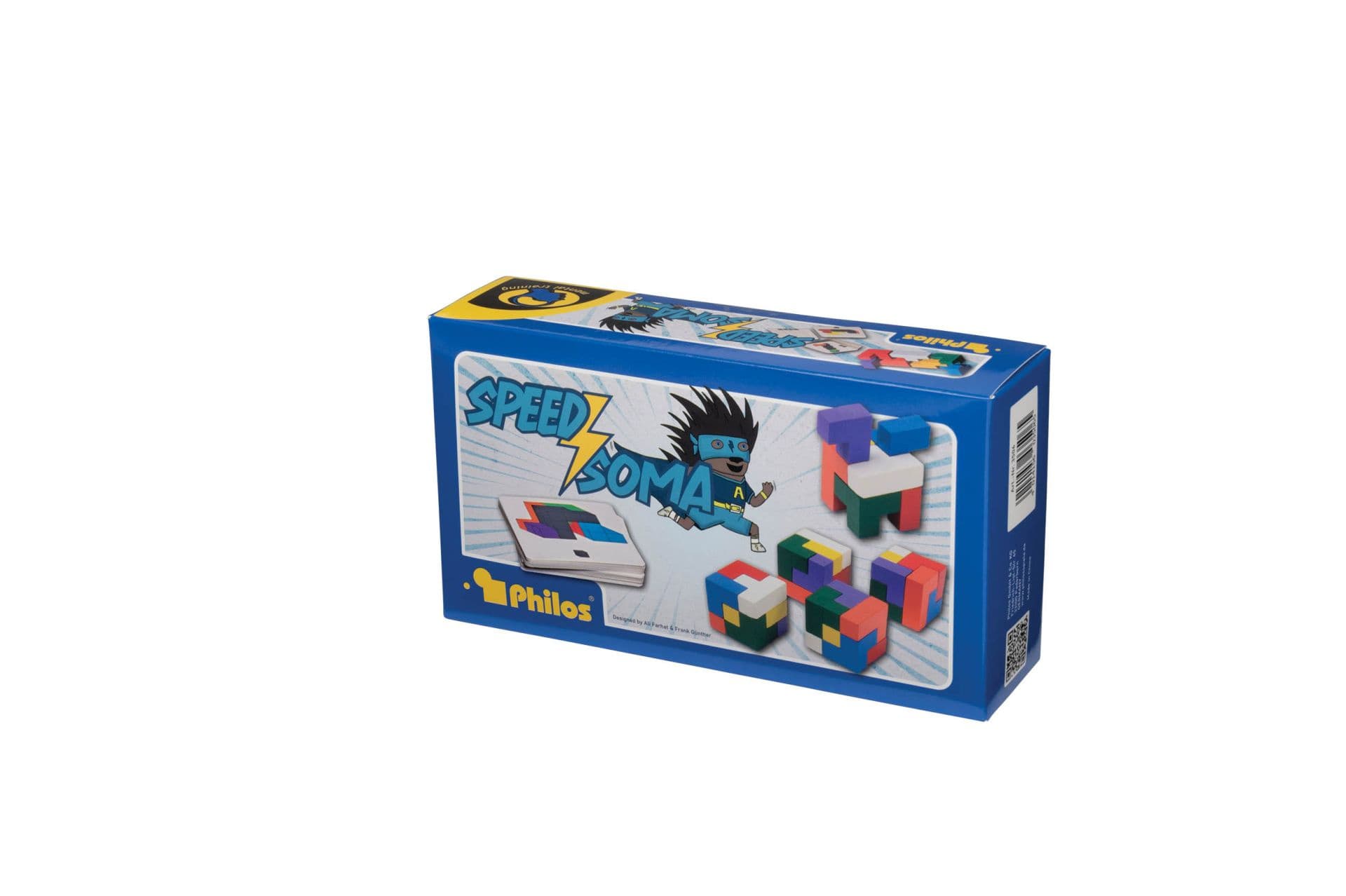 Speed Soma ist ein Kombinationsspiel für 2 bis 4 Personen, bei dem dreidimensionale Figuren gelegt werden müssen. Neben Konzentration und Kombinationsvermögen geht es hier auch um Schnelligkeit. Ziel des Spiels ist es, mit dem eigenen Soma-Satz, als Erster die auf der Aufgabenkarte dargestellte Figur zu legen.