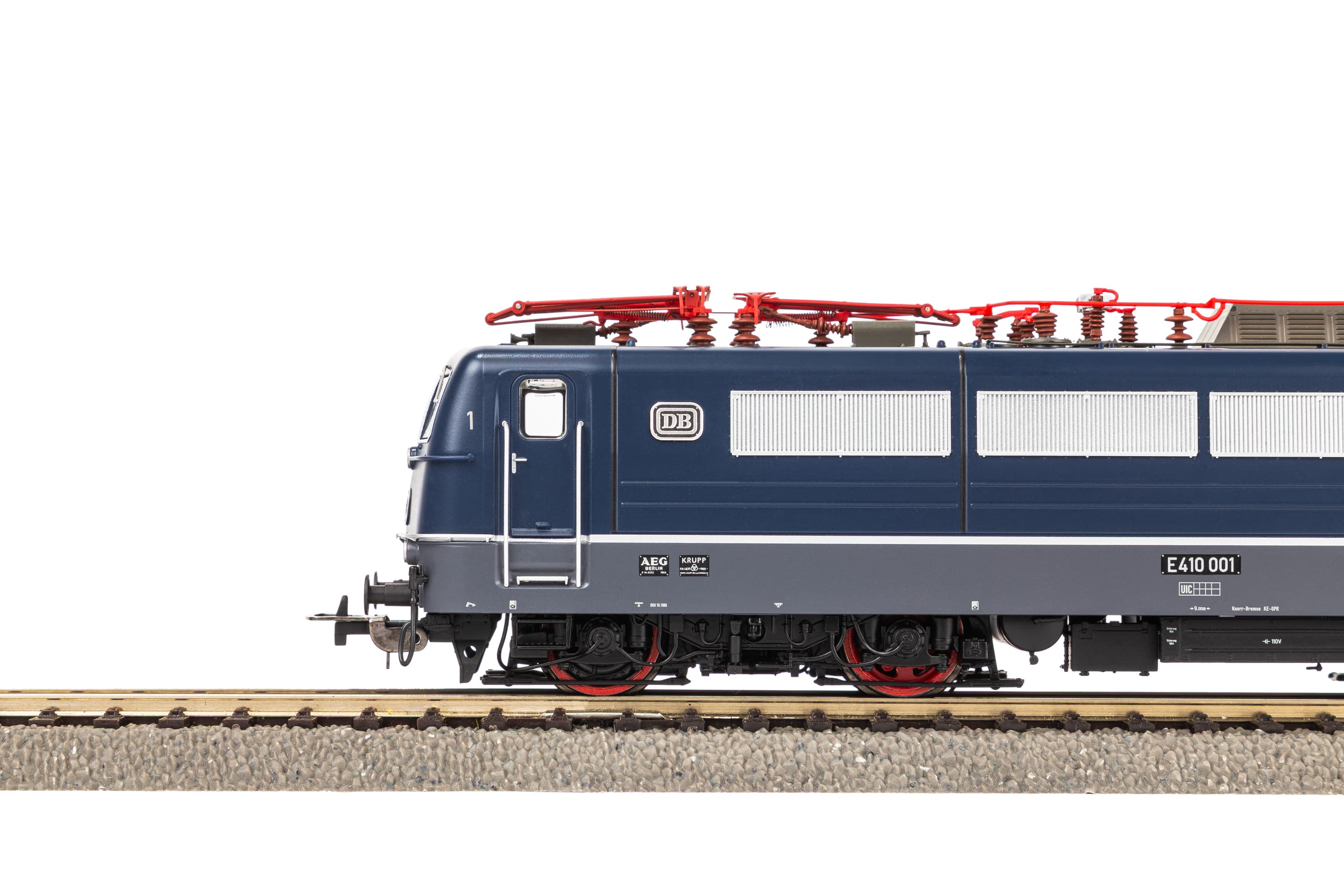 Neuheit 2025: Mit der BR E 410 bringt PIKO die als Europa-Lok bekannt gewordenen Maschinen auf die H0 Gleise. Ausgestattet für verschiedene Stromsysteme in Deutschland, Frankreich, Belgien und Luxemburg erleichterten die Maschinen den grenzüberschreitenden Verkehr merklich. Die PIKO Neukonstruktion setzt der später als BR 184 bezeichneten Lokomotive ein würdiges Denkmal. Beim Blick auf den detaillierten Dachgarten fallen direkt die vier feingliedrigen Stromabnehmer aus Metall ins Auge, welche ohne sichtbare Verschraubungen auf dem Lokdach montiert wurden. Die Seitenflächen werden durch feine Gitter und Gravuren geprägt. Durch die Tür im Führerstand fällt der Blick in den detailliert nachgebildeten Maschinenraum, welcher durch eine stimmige Beleuchtung ideal in Szene gesetzt wird. Auch die Führerstandbeleuchtung ist digital schaltbar. Beim Blick unter den Lokkasten präsentieren sich die Drehgestelle mit zahlreichen, separat angesetzten Bauteilen. Abgerundet wird der Gesamteindruck durch die saubere Lackierung und die konturenscharfe Bedruckung. Das PIKO Expert-Modell ist werkseitig mit einem PIKO PSD XP Sound-Decoder ausgestattet und verfügt über zahlreiche, fahrzeugtypische Sounds.