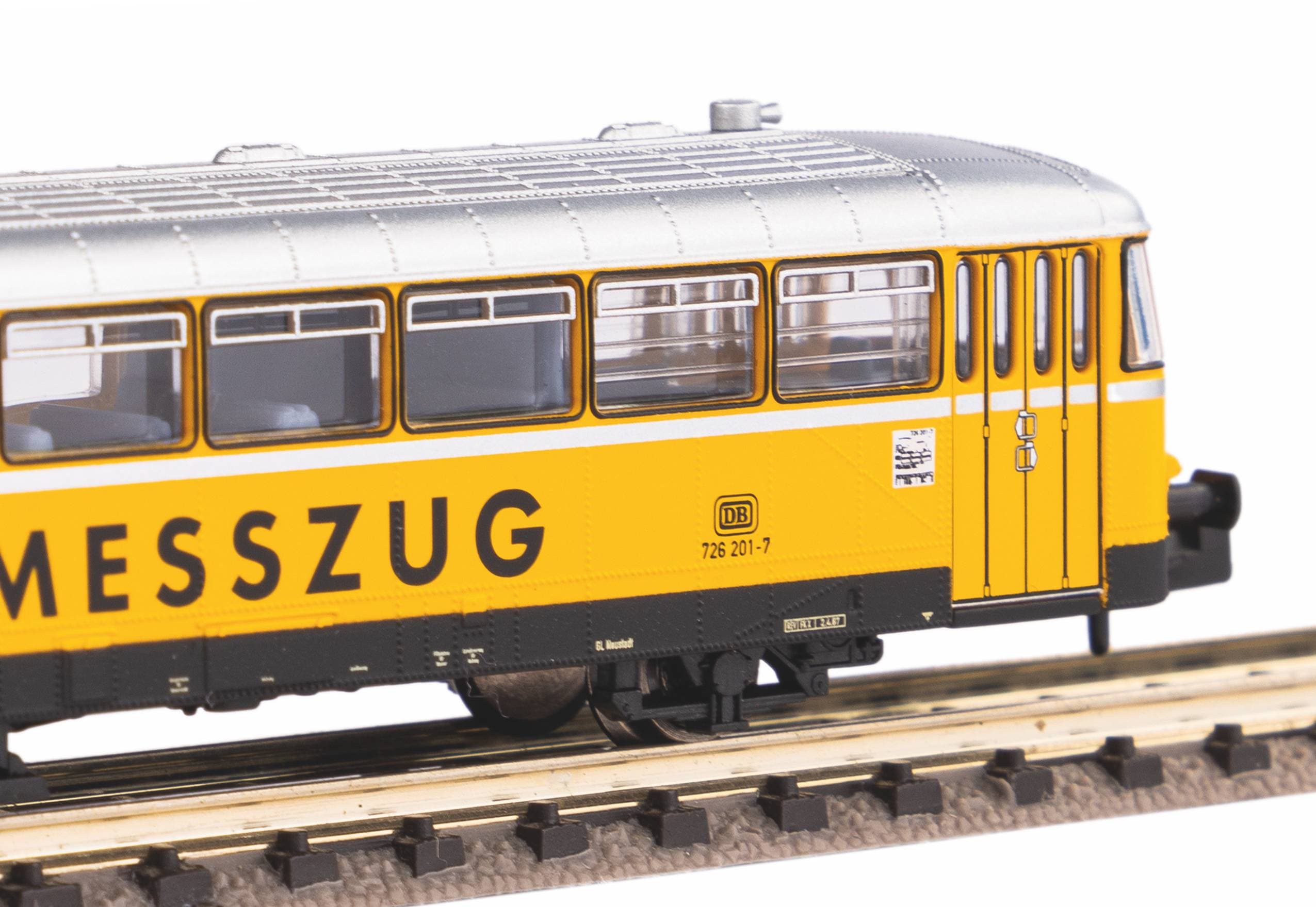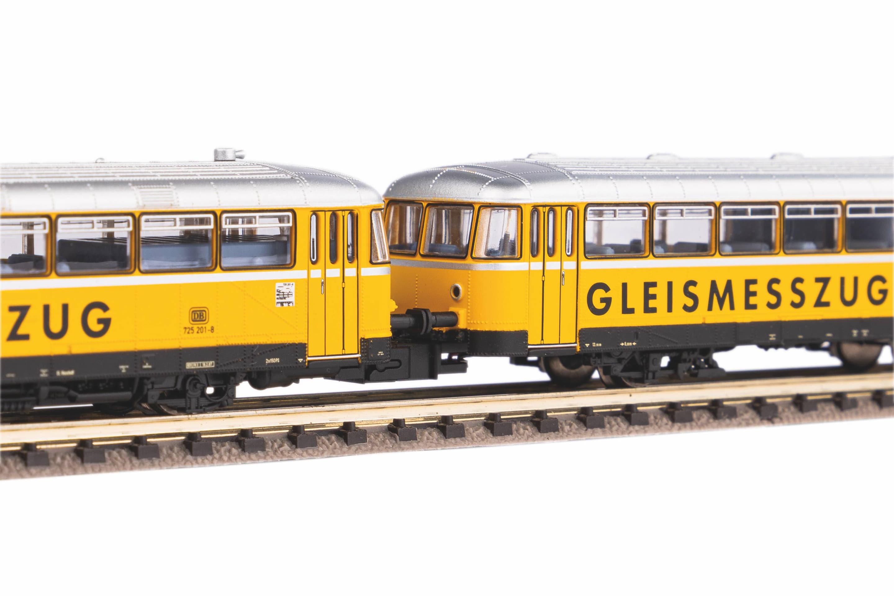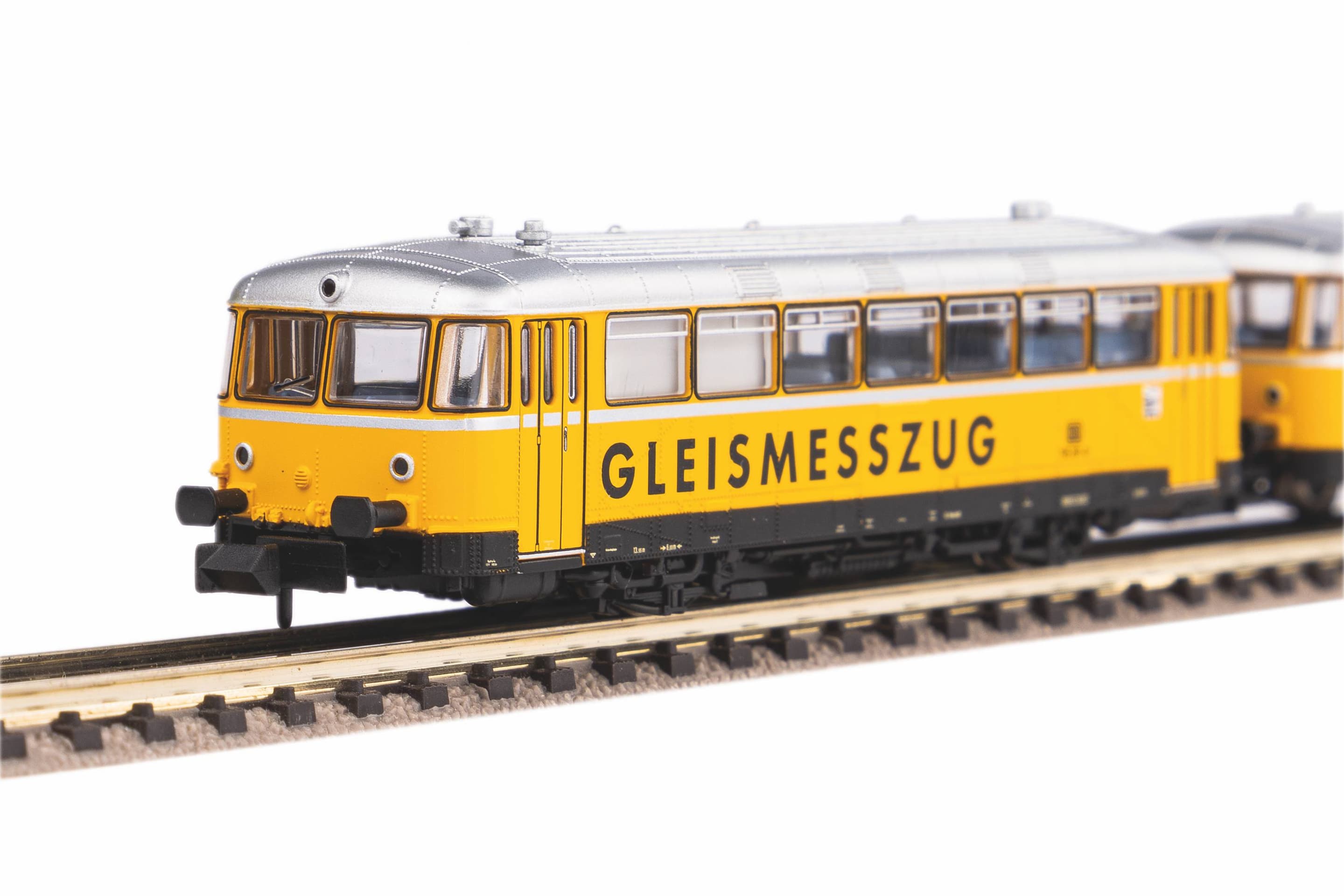 Neuheit 2022: Variante des Dieseltriebwagens in der Lackierung eines Gleismesszugs der DB AG in Epoche V. Die PIKO Modelle des Trieb- und des Steuerwagens verkörpern, wie ihre DB Vorbilder, funktionssichere Konstruktionen. Das Triebwagenmodell wird von einem Kleinstmotor angetrieben, der zugunsten einwandfreier Laufeigenschaften mit zwei präzise dimensionierten Schwungmassen ausgestattet ist. Der Antrieb wirkt auf beide Achsen des Triebwagens. Da Trieb- und Steuerwagen über eine stromleitende Kurzkupplungskinematik miteinander kuppelbar sind, können bei Einsätzen mit Steuerwagen zwei weitere (und damit vier) Achsen zur sicheren Stromabnahme herangezogen werden. Der Triebwagen besitzt eine Digitalschnittstelle PluX16 nach NEM 658. Die Beleuchtungsfunktionen beider Fahrzeuge sind gesondert schaltbar. Ein freier Durchblick ist bei Trieb- und Steuerwagen durch die Fahrgasträume möglich. Der Triebwagen lässt sich vorbildgerecht auch als Triebfahrzeug für die Mitnahme einzelner Güterwagen verwenden.Eigenschaften:Artikelnummer: 40254Bahnverwaltung: DB AGEpoche: VMaßbezeichnung: LüP / Länge über PufferMaß [mm]: 182Mindestradius [mm]: 192Digitale Schnittstelle: NEM 658 PluX16(Innen-)Beleuchtung: Schaltbare Innenbeleuchtung werkseitig ausgerüstetAnzahl Haftreifen: 2Kupplung: NEM Schacht + KurzkupplungskulisseSound: PIKO Sound-Decoder nachrüstbar #46526Lichtwechsel: Fahrtrichtungsabhängiger Lichtwechsel weiß / rot