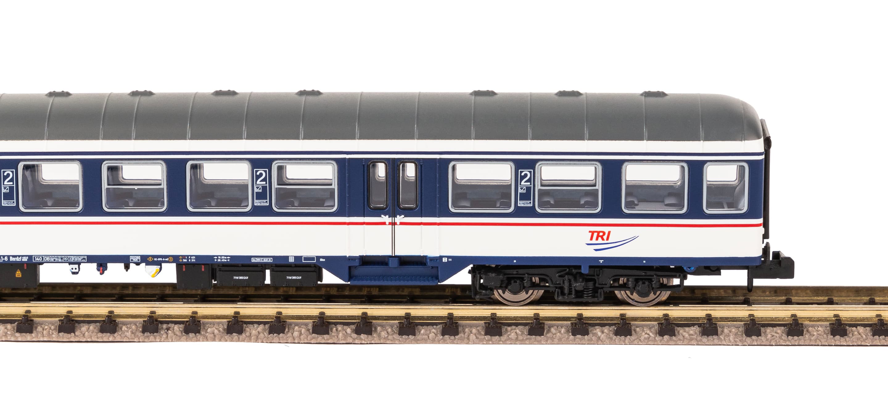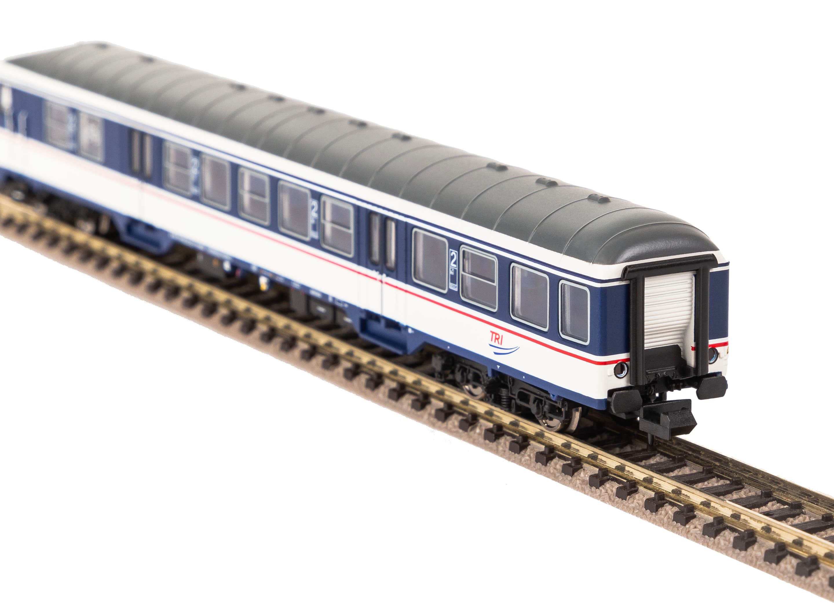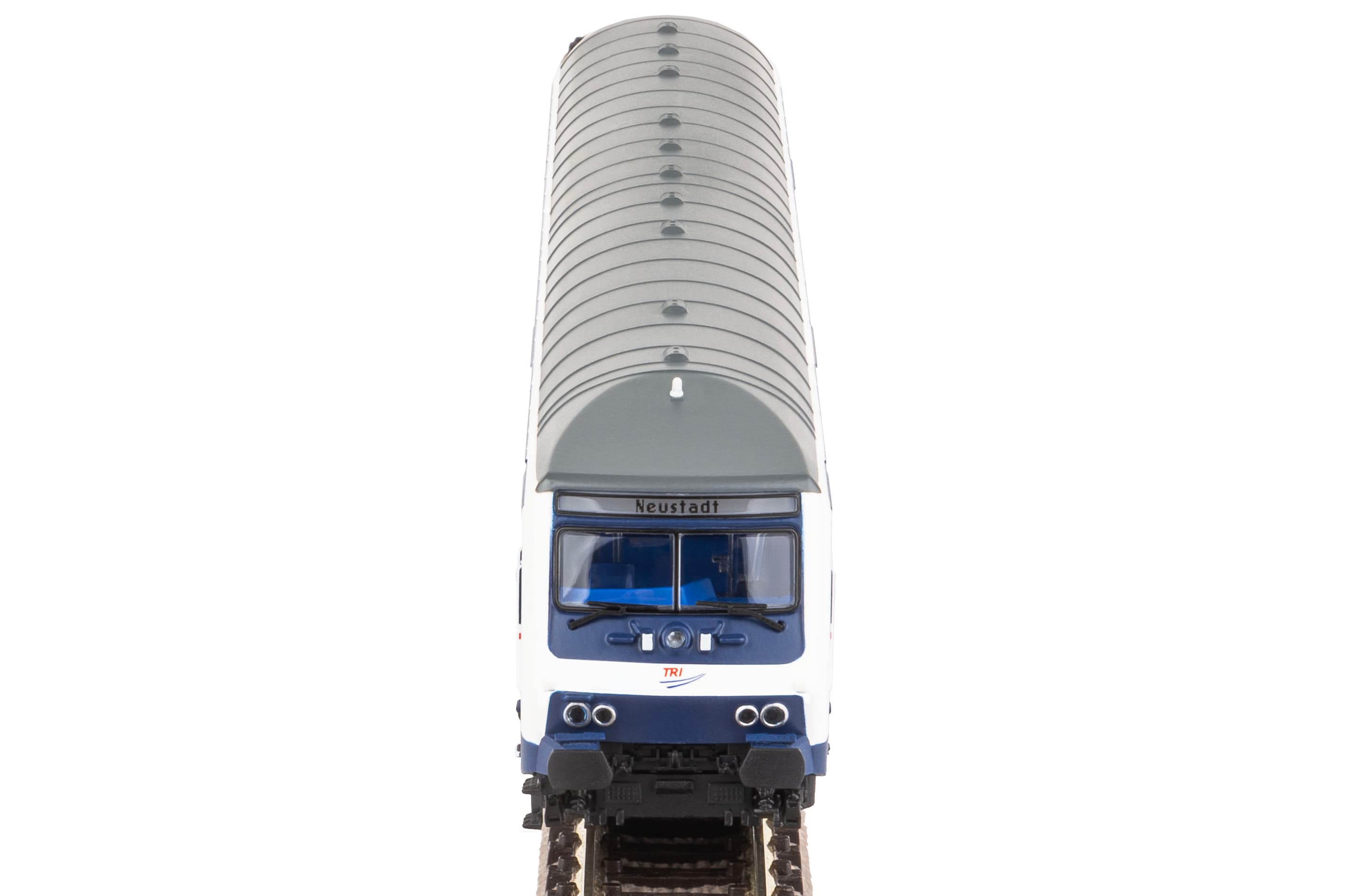 Neuheit 2024: Steuerwagen mit Wittenberger Kopf im Design der TRI in Epoche VI. Die TRI Train Rental GmbH ist ein deutsches Eisenbahnverkehrsunternehmen, das sich auf den Erhalt von historischen Fahrzeugen spezialisiert hat. Darüber hinaus hat sich das Unternehmen zu einem Dienstleister für Sonder-, Ersatz- und Notfalldienste entwickelt. Die aufgearbeiteten Fahrzeuge werden für den regulären Personenverkehr zur Verfügung gestellt. Neben der Optik überzeugen das Modell auch durch die hervorragenden Laufeigenschaften und ist für die unkomplizierte Nachrüstung einer Innenbeleuchtung vorbereitet.