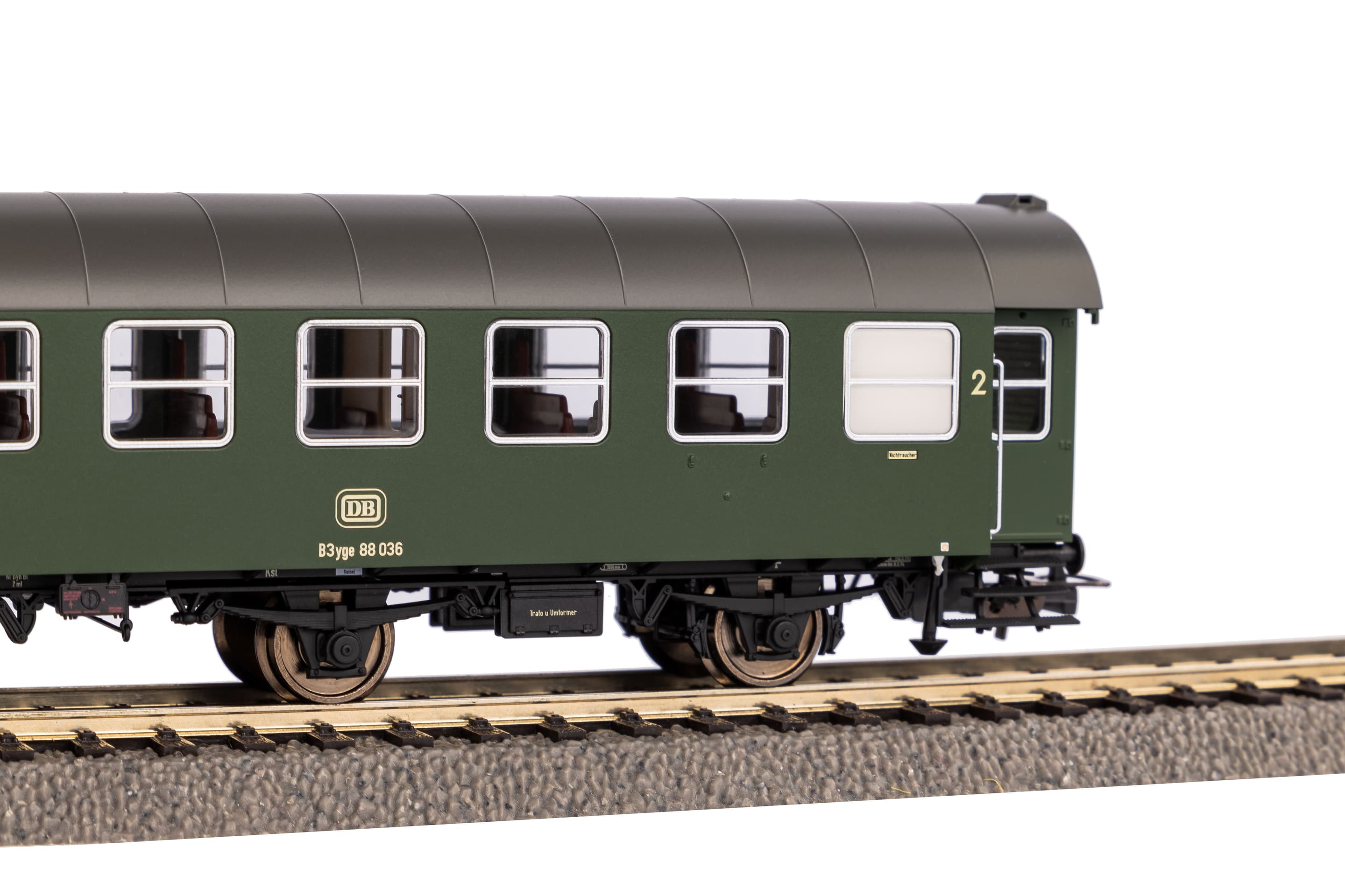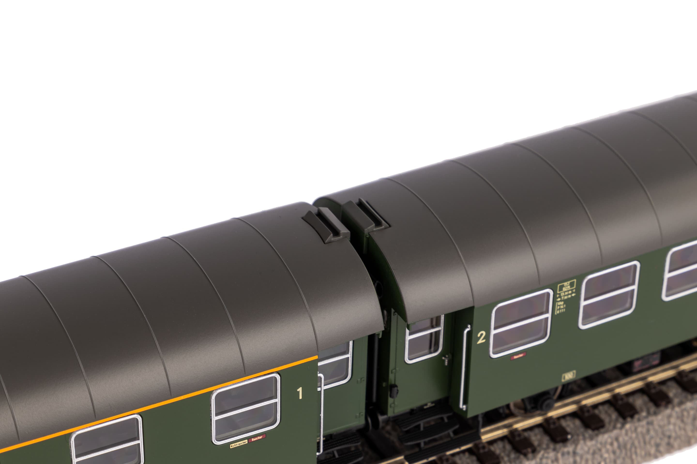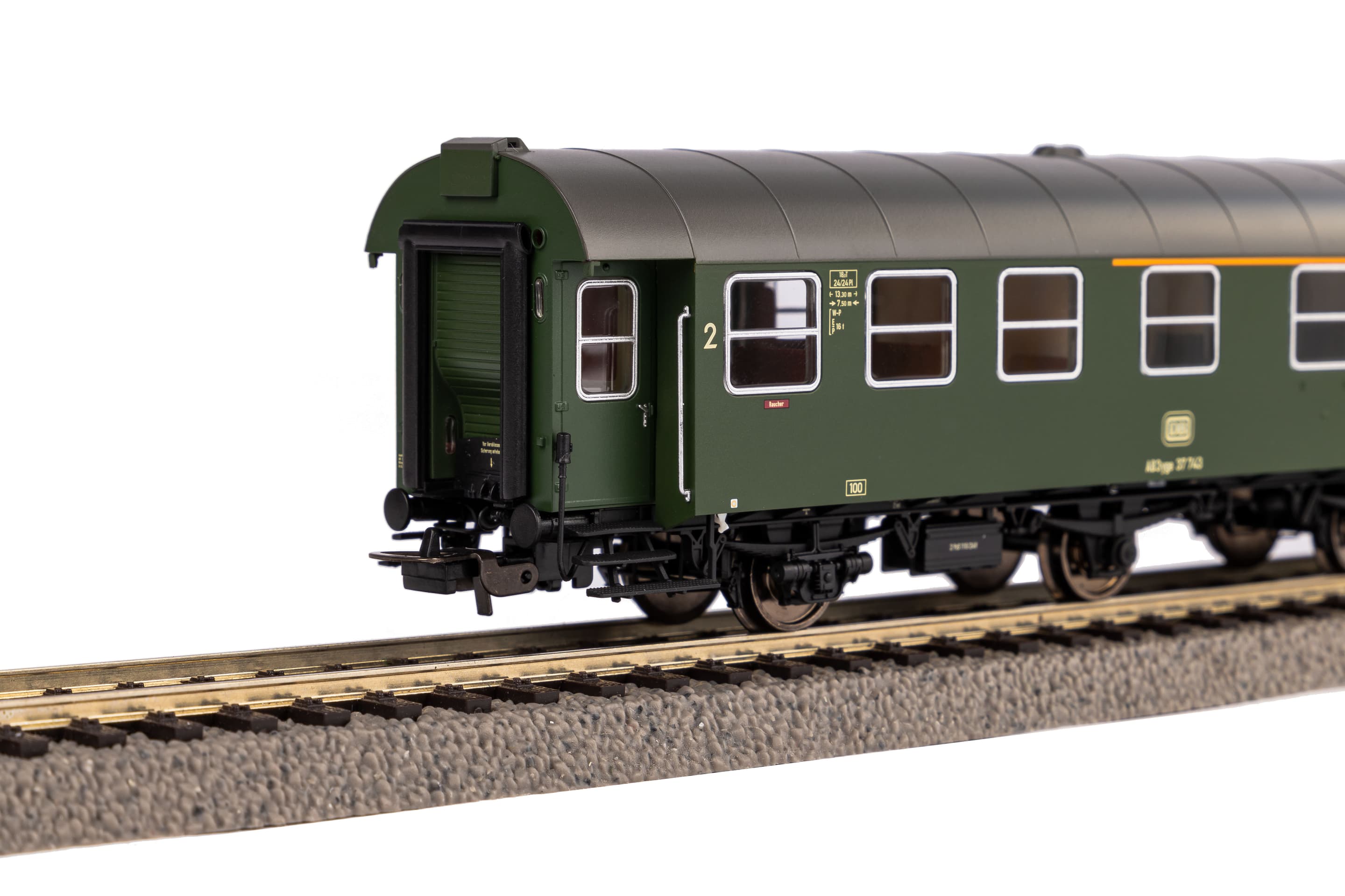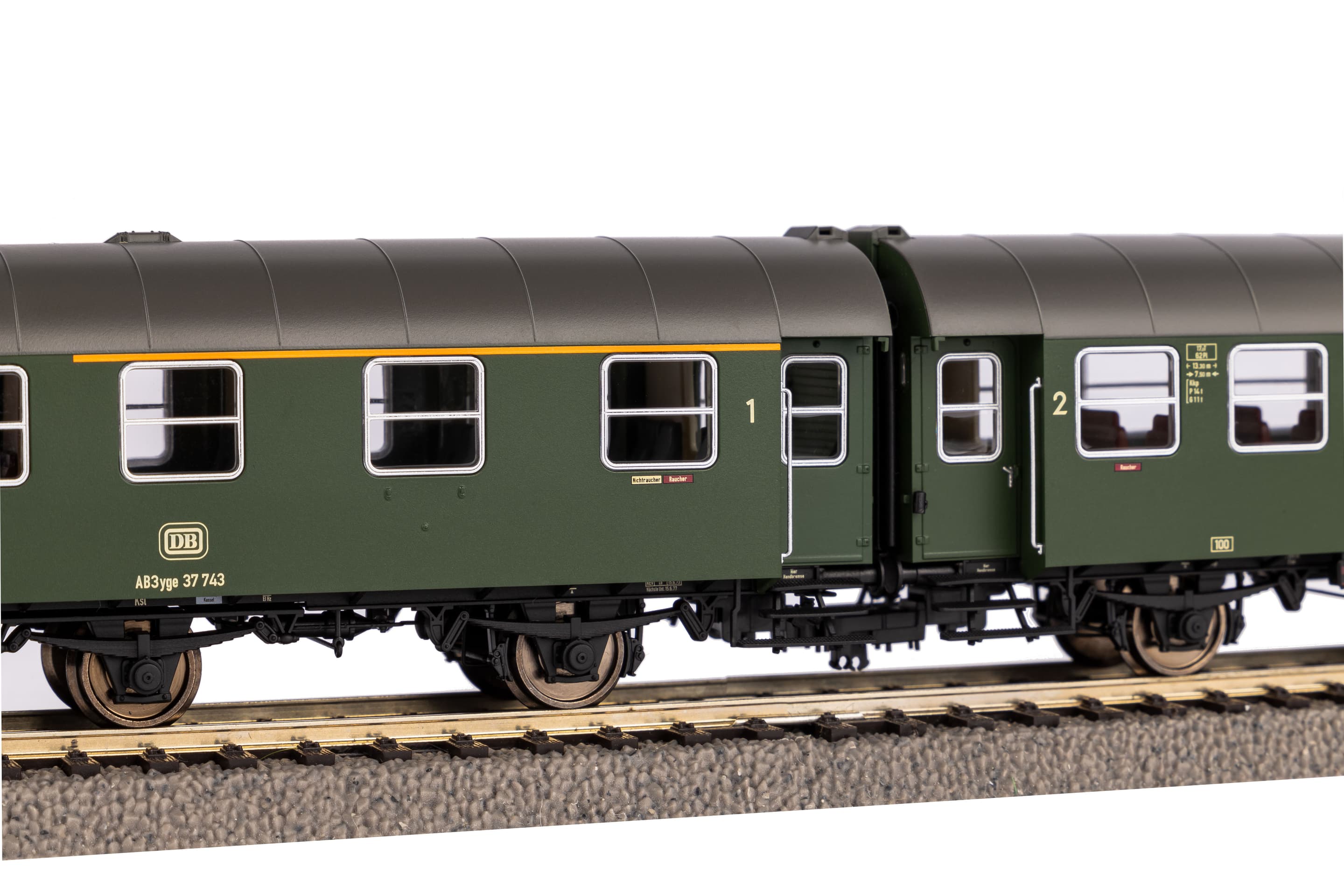 Neuheit 2023: Zweierset der kurzgekuppelten Umbauwagen mit einem 1. und einem 2. Klasse Wagen der DB in Epoche IV. Anders als beim Vorbild wurde für die PIKO Modelle der dreiachsigen Umbauwagen nicht auf vorhandene Teile zurückgegriffen, sondern ein Expert-Modell komplett neu konstruiert. Die maßstäblichen Fahrzeuge geben das Original bis ins kleinste Detail exakt wieder. Einzeln angesetzte Griffstangen gehören genauso zur zeitgemäßen Konstruktion wie bündig abschließende, glasklare Fenster und eine detaillierte Inneneinrichtung. Die liebevolle Gestaltung setzt sich auch am Wagenboden fort. Er überzeugt durch freistehende Leitungen, ein filigranes Bremsgestänge sowie Rangiergriffe und Fangeisen aus Metall. Wie das Vorbild kommen die PIKO Umbauwagen als kurzgekuppelte Pärchen in den Handel und verfügen, dank der präzise geführten Kurzkupplungskinematik, über einen vorbildnahen Abstand zwischen den Wagen. Abgerundet werden die Wagen durch die optional erhältliche Innenbeleuchtung.Stromsystem: GleichstromBahnverwaltung: DBEpoche: IVMaßbezeichnung: LüP / Länge über PufferMaß [mm]: 153Mindestradius [mm]: 358(Innen-)Beleuchtung: Innenbeleuchtung nachrüstbar mit 2x #56297Kupplung: NEM Schacht + Kurzkupplungskulisse