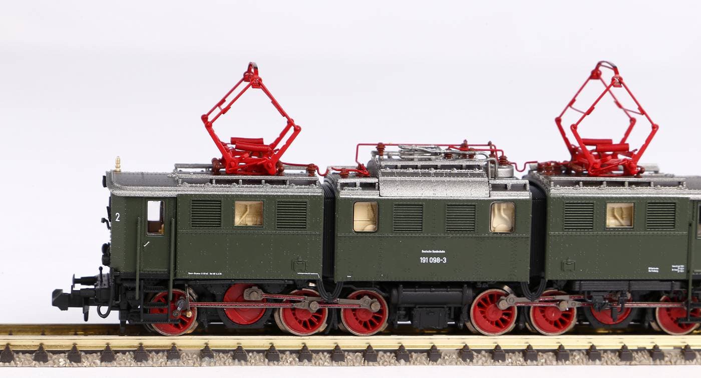 Neuheit 2022: PIKO hat die E91 perfekt eingefangen und in den Maßstab 1:160 transferiert. Die konstruktive Symbiose aus hervorragender Modellumsetzung und ausgezeichneten Fahreigenschaften zeichnen die Neuentwicklung aus. Die scharfen Gravuren des Gehäuses, gepaart mit einer hochfeinen Bedruckung und garniert mit äußerst filigranen Stromabnehmern machen die Lok zu einem Schmuckstück. Selbstverständlich verfügt das Modell über einen Lichtwechsel in LED-Technik mit roter Schlussbeleuchtung. Zusätzliche Beleuchtungsfunktionen können mittels Digitaldecoder gesteuert werden. In der Soundausführung besitzt die BR 191 ab Werk einen PSD XP 5.1 S SoundDecoder der neuesten Generation und hat PIKO TrainSound® onboard.Eigenschaften:Artikelnummer: 40541Sound ja/nein: 1Bahnverwaltung: DBEpoche: IVMaßbezeichnung: LüP / Länge über PufferMaß [mm]: 104Mindestradius [mm]: 192Digitale Schnittstelle: NEM 662 Next18Verbauter Decoder: Next18 SounddecoderAnzahl Haftreifen: 2Kupplung: NEM Schacht + KurzkupplungskulisseSound: PIKO Sound-Decoder werkseitig ausgerüstetLichtwechsel: Fahrtrichtungsabhängiger Lichtwechsel weiß / rot
