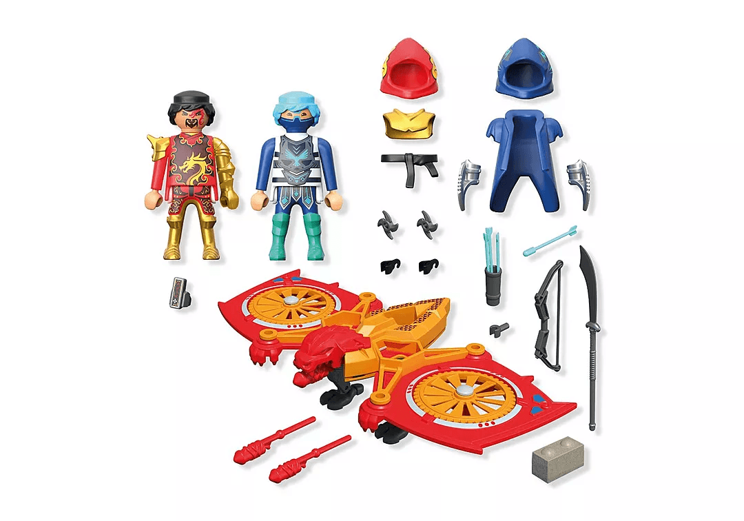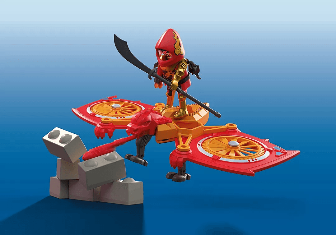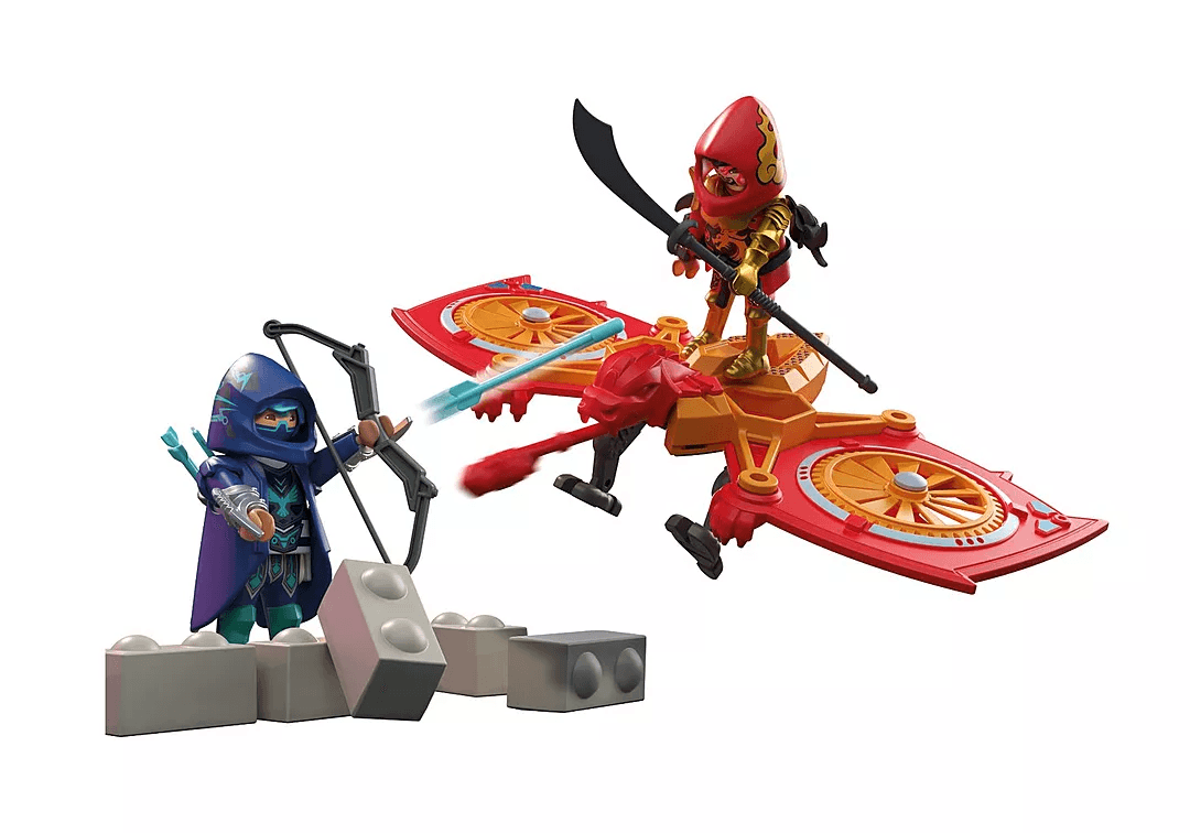 Bereit für den ultimativen Ninja-Showdown? Mit dem Playmobil Heroes Set "Helden-Drohne gegen bösen Ninja" erleben Kinder ab 4 Jahren packende Action in luftiger Höhe und am Boden! Der mutige Red Dragon steuert seine bewegliche Drachen-Drohne mit rotierenden Flügeln und abschießbaren Projektilen, während Shadow Raven sich mit Pfeil, Bogen und Shuriken hinter einer zerstörbaren Mauer verteidigt.
