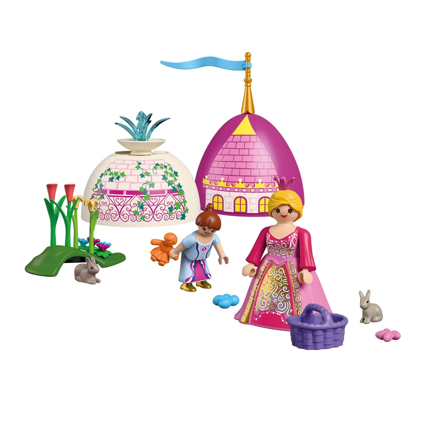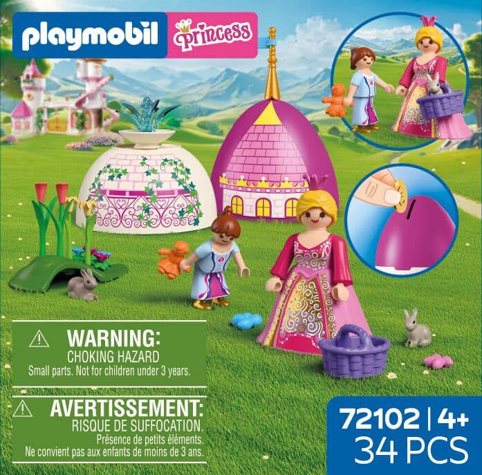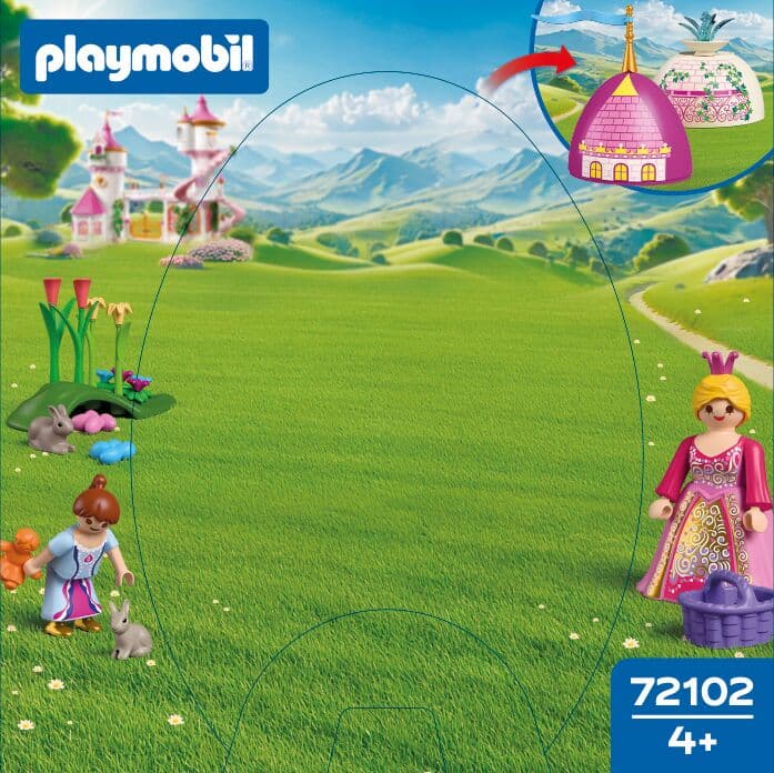 Die neuen PLAYMOBIL-Spiel-Eier– jetzt mit noch mehr Spielspaß! Jedes bunte Ei steckt voller Überraschungen: Zwei Figuren, jede Menge Zubehör und eine kleine Spielszene, die sich direkt aus den beiden Eihälften zusammensetzen lässt. Auspacken, aufbauen, losspielen! Osterzauber im Schlossgarten: Die große und kleine Prinzessin suchen zwischen einem prächtigen Schlossturm und einem plätschernden Springbrunnen nach bunten Ostereiern – und entdecken dabei zwei süße Osterhasen. Nach Ostern lässt sich das Ei wieder zusammenbauen und als Spardose verwenden – perfekt, um für das nächste Abenteuer zu sparen! Figuren: 1 Prinzessin, 1 Kind Tiere: 2 Hasen Zubehör: 2 Ei-Hälften, 1 Fahne, 1 kleiner Springbrunnen, 1 Krone, 1 Rock, 1 Grashügel, 2 Blütenstiele hellgrün, 2 Blütenstiele dunkelgrün, 2 Blüten gelb, 2 Blüten pink, 1 Ranke, 2 Blüten-Sterne purpur, 2 Blüten-Sterne blau, 1 Körbchen, 1 Ostereier-Set blau, 1 Ostereier-Set pink