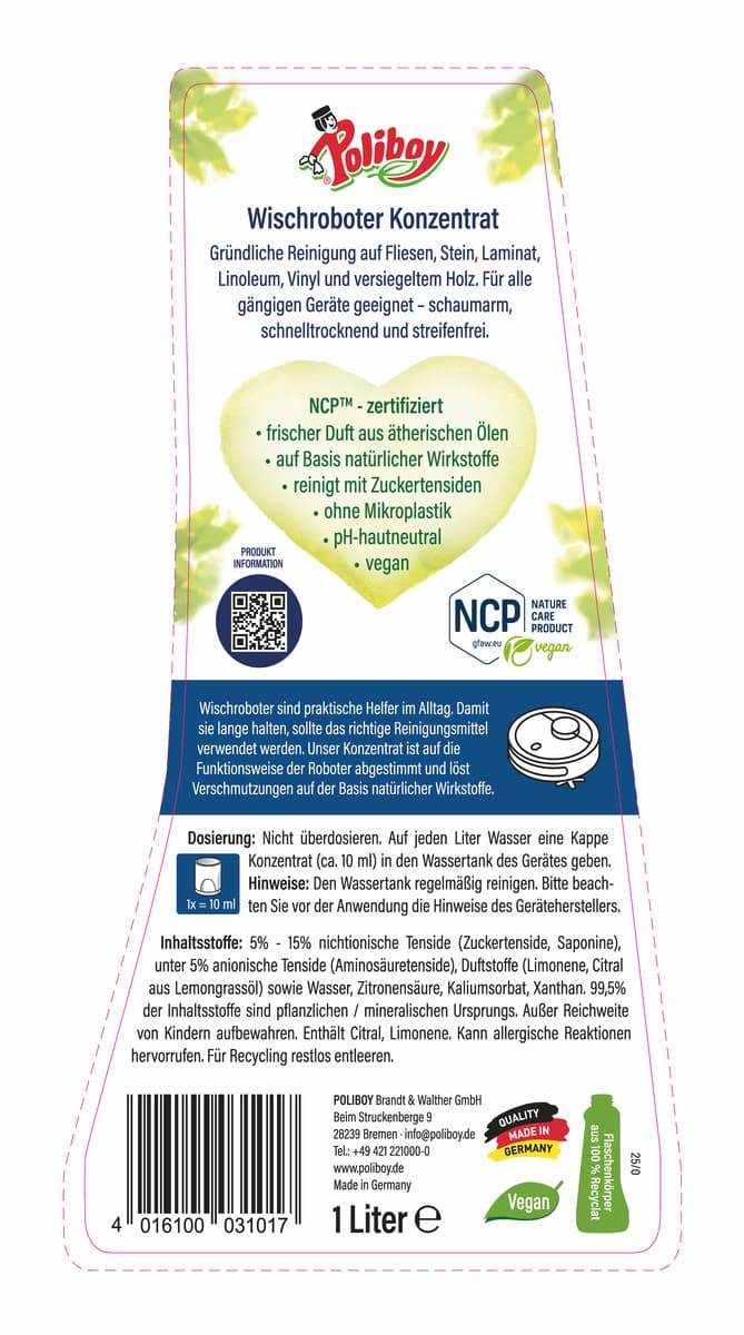 Die Rezeptur des Reinigungskonzentrats basiert auf natürlichen Inhaltsstoffen und ist vollständig biologisch abbaubar. Dank der ausgewählten Tenside auf Basis von Aminosäuren werden Oberflächen schonend und gründlich gereinigt, ohne Schlieren zu hinterlassen. Die Anwendung ist unkompliziert: Einfach die empfohlene Menge des Konzentrats in den Wassertank des Roboters geben und das gewünschte Reinigungsprogramm starten. Das Ergebnis sind saubere Böden und ein frisches Gefühl im ganzen Raum.