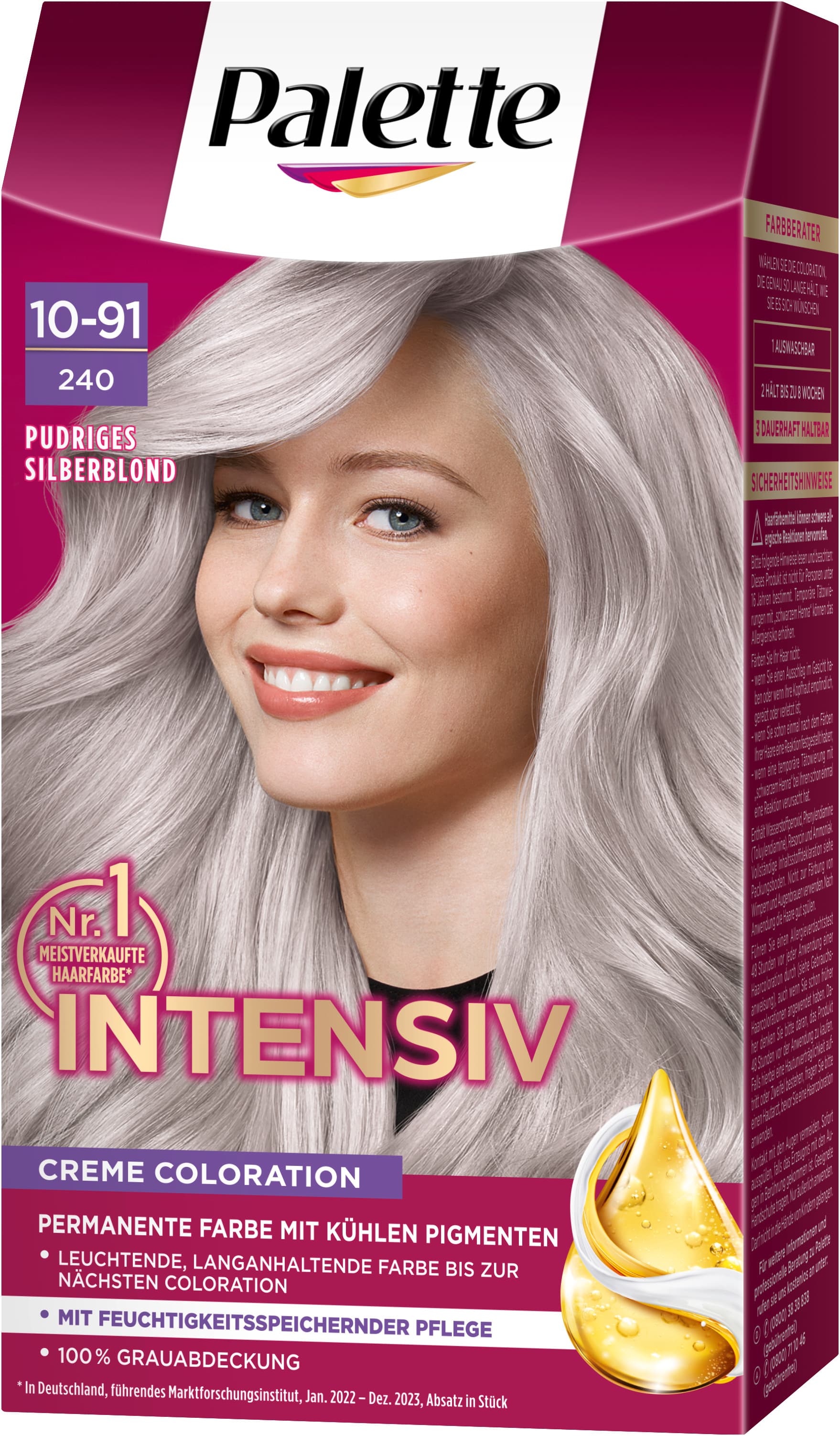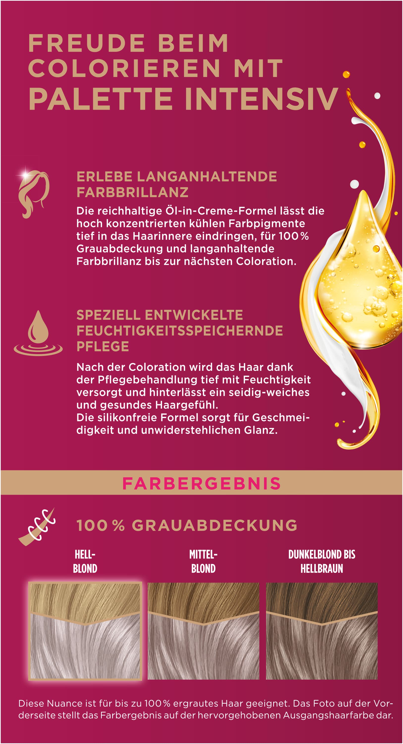 Palette Intensiv Creme Coloration – Color-Creme für leuchtende und langanhaltende FarbergebnisseDie Palette Intensiv Creme Coloration sorgt für leuchtende, langanhaltende Farbergebnisse, intensiven Farbglanz sowie perfekte Grauabdeckung. Die Color-Creme mit reichhaltiger Öl-in-Creme-Formel lässt die hoch konzentrierten Farbpigmente tief in das Haarinnere eindringen, für 100 % Grauabdeckung und eine langanhaltende Farbbrillanz bis zur nächsten Coloration.Zusätzlich ist die speziell entwickelte, feuchtigkeitsspendende Pflege der Haarfarbe silikonfrei und sorgt für Geschmeidigkeit und unwiderstehlichen Glanz. Das Haar wird dank der Pflegebehandlung tief mit Feuchtigkeit versorgt und hinterlässt ein seidig-weiches und gesundes Haargefühl.Die Produktvorteile im Detail:Leuchtende, langanhaltende FarbeAusdrucksstarkes Farbergebnis bis zur nächsten Coloration100 % GrauabdeckungFeuchtigkeitsspeichernde Pflege für Geschmeidigkeit&GlanzAnwendung:1. Den Inhalt der Palette Color-Creme in die Applikatorflasche mit Entwicklerlotion geben und gut mischen.2. Trage die Mischung mit der Applikatorflasche auf das trockene Haar auf und lasse das Produkt 30 Minuten einwirken (für die Farbtöne 11-11, 10-91, 10-1, 10-0: 35-45 Minuten)3. Mit lauwarmem Wasser gut ausspülen, bis das Wasser klar ist. Anschließend die in der Packung enthaltene Pflegebehandlung verwenden.