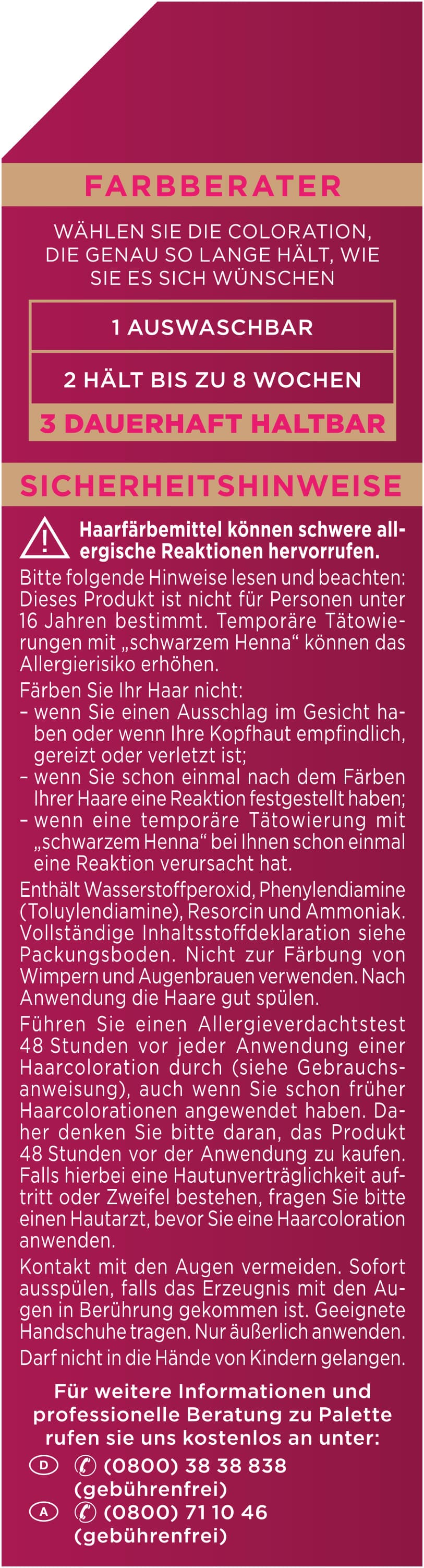 Haarfärbemittel können schwere allergische Reaktionen hervorrufen. Bitte folgende Hinweise lesen und beachten: Dieses Produkt ist nicht für Personen unter 16 Jahren bestimmt. Temporäre Tätowierungen mit „schwarzem Henna“ können das Allergierisiko erhöhen. Färben Sie Ihr Haar nicht: – wenn Sie einen Ausschlag im Gesicht haben oder wenn Ihre Kopfhaut empfindlich, gereizt oder verletzt ist; – wenn Sie schon einmal nach dem Färben Ihrer Haare eine Reaktion festgestellt haben; – wenn eine temporäre Tätowierung mit „schwarzem Henna“ bei Ihnen schon einmal eine Reaktion verursacht hat. Enthält Wasserstoffperoxid, Phenylendiamine (Toluylendiamine) und Resorcin. Vollständige Inhaltsstoffdeklaration siehe Packungsboden. Nicht zur Färbung von Wimpern und Augenbrauen verwenden. Nach Anwendung die Haare gut spülen. Führen Sie einen Allergieverdachtstest 48 Stunden vor jeder Anwendung einer Haarcoloration durch (siehe Gebrauchsanweisung), auch wenn Sie schon früher Haarcolorationen angewend