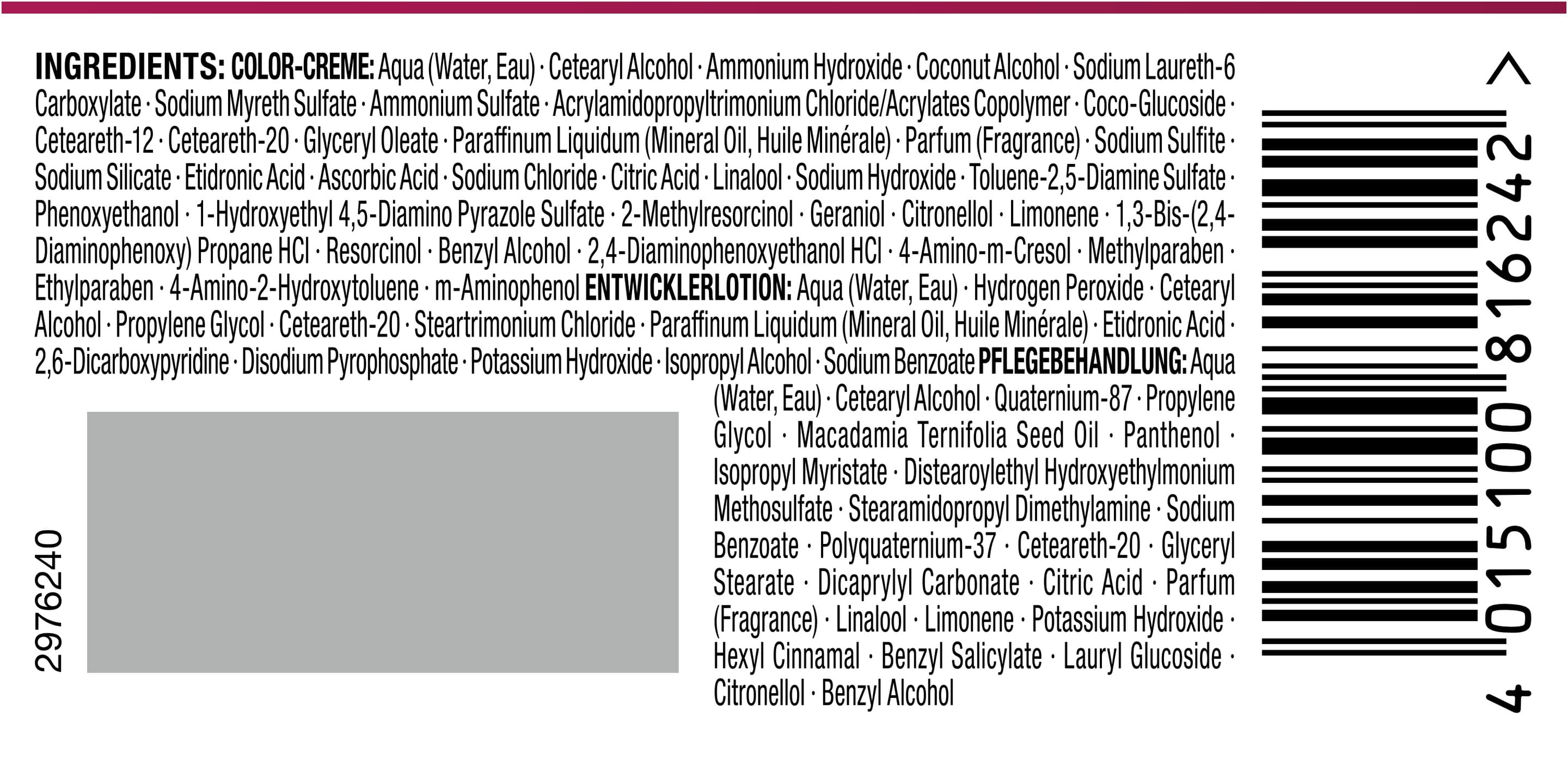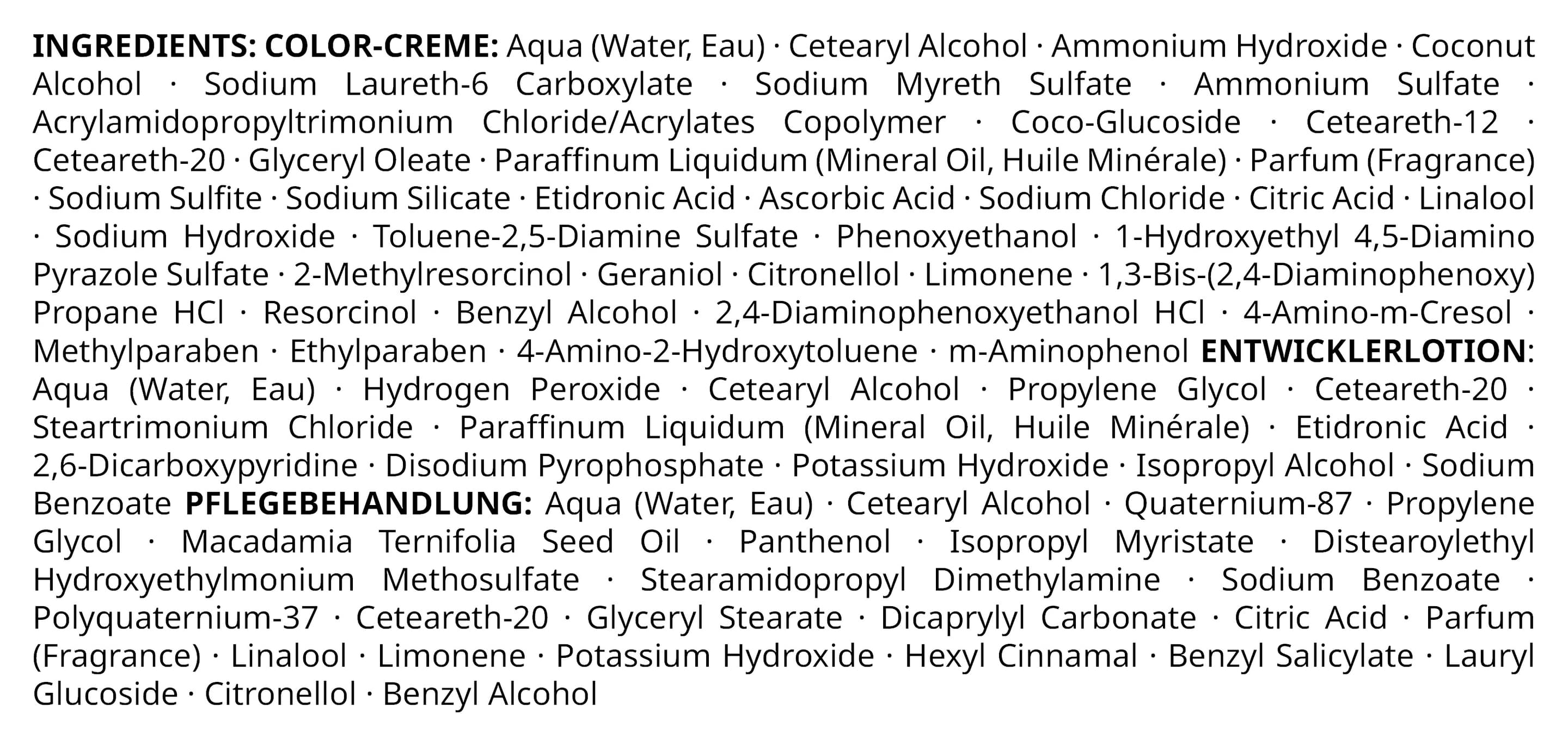 Inhaltsstoffe Color-Creme: Aqua (Water, Eau), Cetearyl Alcohol, Ammonium Hydroxide, Coconut Alcohol, Sodium Laureth-6 Carboxylate, Sodium Myreth Sulfate, Ammonium Sulfate, Acrylamidopropyltrimonium Chloride/Acrylates Copolymer, Coco-Glucoside, Ceteareth-12, Ceteareth-20, Glyceryl Oleate, Paraffinum Liquidum (Mineral Oil, Huile Minérale), Parfum (Fragrance), Sodium Sulfite, Sodium Silicate, Etidronic Acid, Ascorbic Acid, Sodium Chloride, Citric Acid, Linalool, Sodium Hydroxide, Toluene-2,5-Diamine Sulfate, Phenoxyethanol, 1-Hydroxyethyl 4,5-Diamino Pyrazole Sulfate, 2-Methylresorcinol, Geraniol, Citronellol, Limonene, 1,3-Bis-(2,4-Diaminophenoxy) Propane HCl, Resorcinol, Benzyl Alcohol, 2,4-Diaminophenoxyethanol HCl, 4-Amino-m-Cresol, Methylparaben, Ethylparaben, 4-Amino-2-Hydroxytoluene, m-Aminophenol|Entwicklerlotion: Aqua (Water, Eau), Hydrogen Peroxide, Cetearyl Alcohol, Propylene Glycol, Ceteareth-20, Steartrimonium Chloride, Paraffinum Liquidum (Mineral Oil, Huile Minérale), Etidronic Acid, 2,