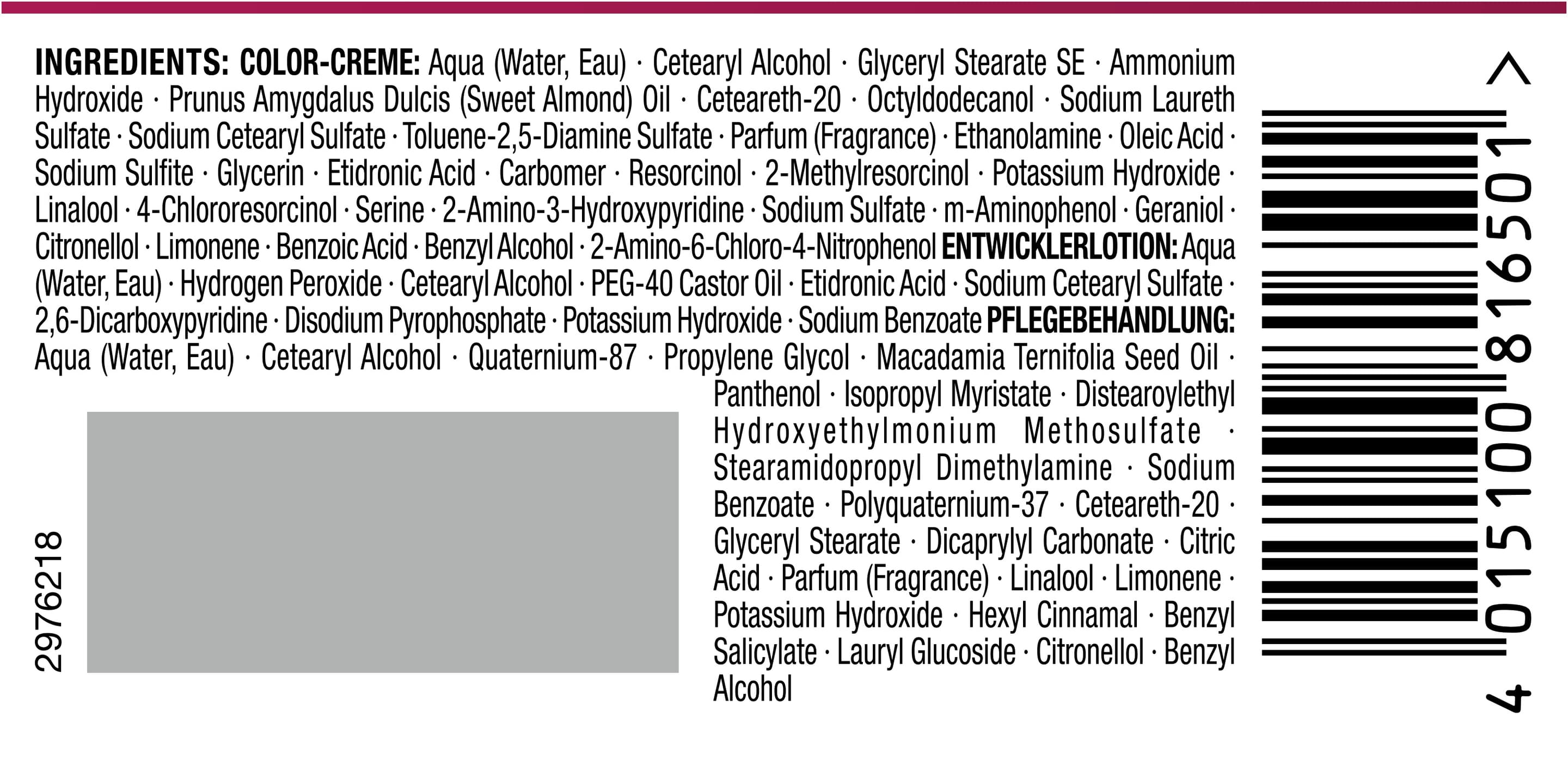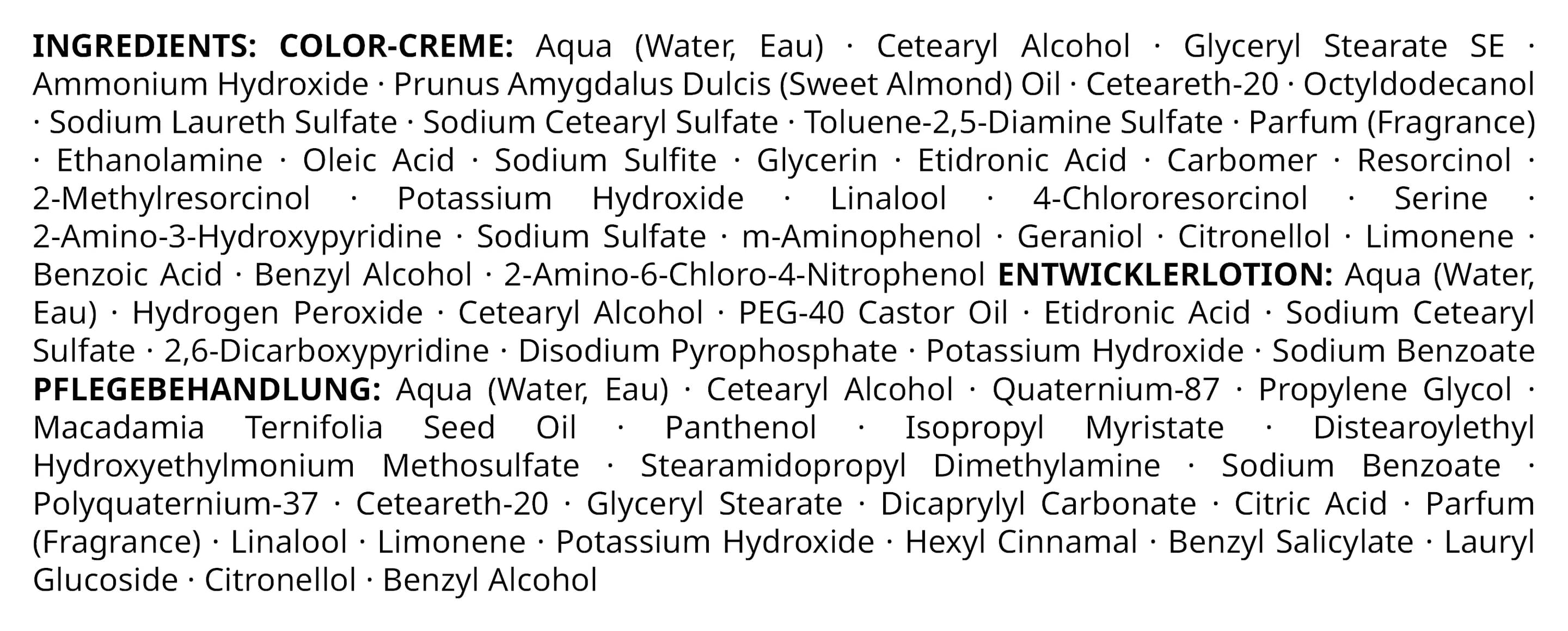 Inhaltsstoffe Color-Creme: Aqua (Water, Eau), Cetearyl Alcohol, Glyceryl Stearate SE, Ammonium Hydroxide, Prunus Amygdalus Dulcis (Sweet Almond) Oil, Ceteareth-20, Octyldodecanol, Sodium Laureth Sulfate, Sodium Cetearyl Sulfate, Toluene-2,5-Diamine Sulfate, Parfum (Fragrance), Ethanolamine, Oleic Acid, Sodium Sulfite, Glycerin, Etidronic Acid, Carbomer, Resorcinol, 2-Methylresorcinol, Potassium Hydroxide, Linalool, 4-Chlororesorcinol, Serine, 2-Amino-3-Hydroxypyridine, Sodium Sulfate, m-Aminophenol, Geraniol, Citronellol, Limonene, Benzoic Acid, Benzyl Alcohol, 2-Amino-6-Chloro-4-Nitrophenol|Entwicklerlotion: Aqua (Water, Eau), Hydrogen Peroxide, Cetearyl Alcohol, PEG-40 Castor Oil, Etidronic Acid, Sodium Cetearyl Sulfate, 2,6-Dicarboxypyridine, Disodium Pyrophosphate, Potassium Hydroxide, Sodium Benzoate|Pflegebehandlung: Aqua (Water, Eau), Cetearyl Alcohol, Quaternium-87, Propylene Glycol, Macadamia Ternifolia Seed Oil, Panthenol, Isopropyl Myristate, Distearoylethyl Hydroxyethylmonium Methosulfa