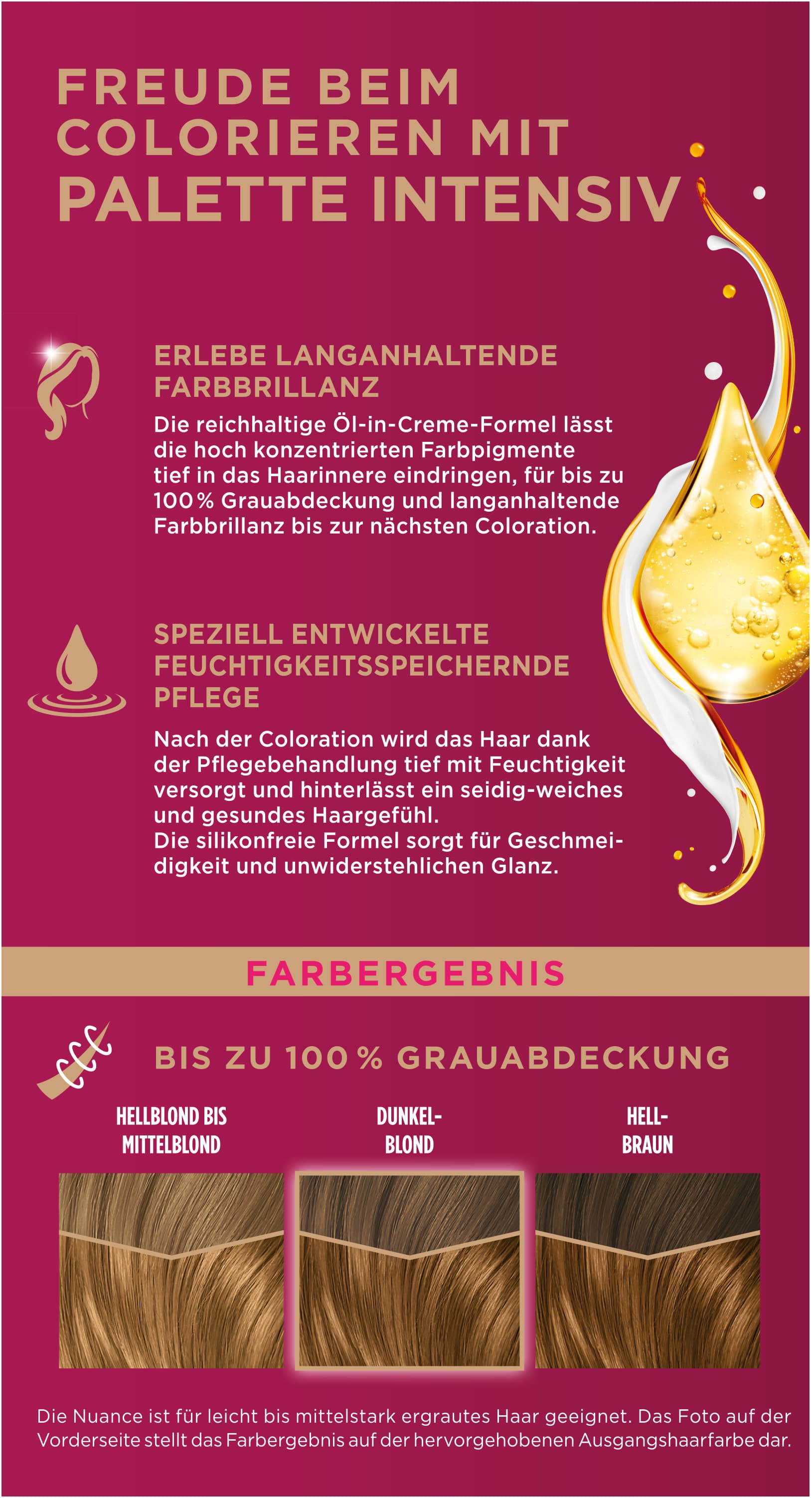 Palette Intensiv Creme Coloration – Color-Creme für leuchtende und langanhaltende FarbergebnisseDie Palette Intensiv Creme Coloration sorgt für leuchtende, langanhaltende Farbergebnisse, intensiven Farbglanz sowie perfekte Grauabdeckung. Die Color-Creme mit reichhaltiger Öl-in-Creme-Formel lässt die hoch konzentrierten Farbpigmente tief in das Haarinnere eindringen, für 100 % Grauabdeckung und eine langanhaltende Farbbrillanz bis zur nächsten Coloration.Zusätzlich ist die speziell entwickelte, feuchtigkeitsspendende Pflege der Haarfarbe silikonfrei und sorgt für Geschmeidigkeit und unwiderstehlichen Glanz. Das Haar wird dank der Pflegebehandlung tief mit Feuchtigkeit versorgt und hinterlässt ein seidig-weiches und gesundes Haargefühl.Die Produktvorteile im Detail:Leuchtende, langanhaltende FarbeAusdrucksstarkes Farbergebnis bis zur nächsten Coloration100 % GrauabdeckungFeuchtigkeitsspeichernde Pflege für Geschmeidigkeit&GlanzAnwendung:1. Den Inhalt der Palette Color-Creme in die Applikatorflasche mit Entwicklerlotion geben und gut mischen.2. Trage die Mischung mit der Applikatorflasche auf das trockene Haar auf und lasse das Produkt 30 Minuten einwirken (für die Farbtöne 11-11, 10-91, 10-1, 10-0: 35-45 Minuten)3. Mit lauwarmem Wasser gut ausspülen, bis das Wasser klar ist. Anschließend die in der Packung enthaltene Pflegebehandlung verwenden.