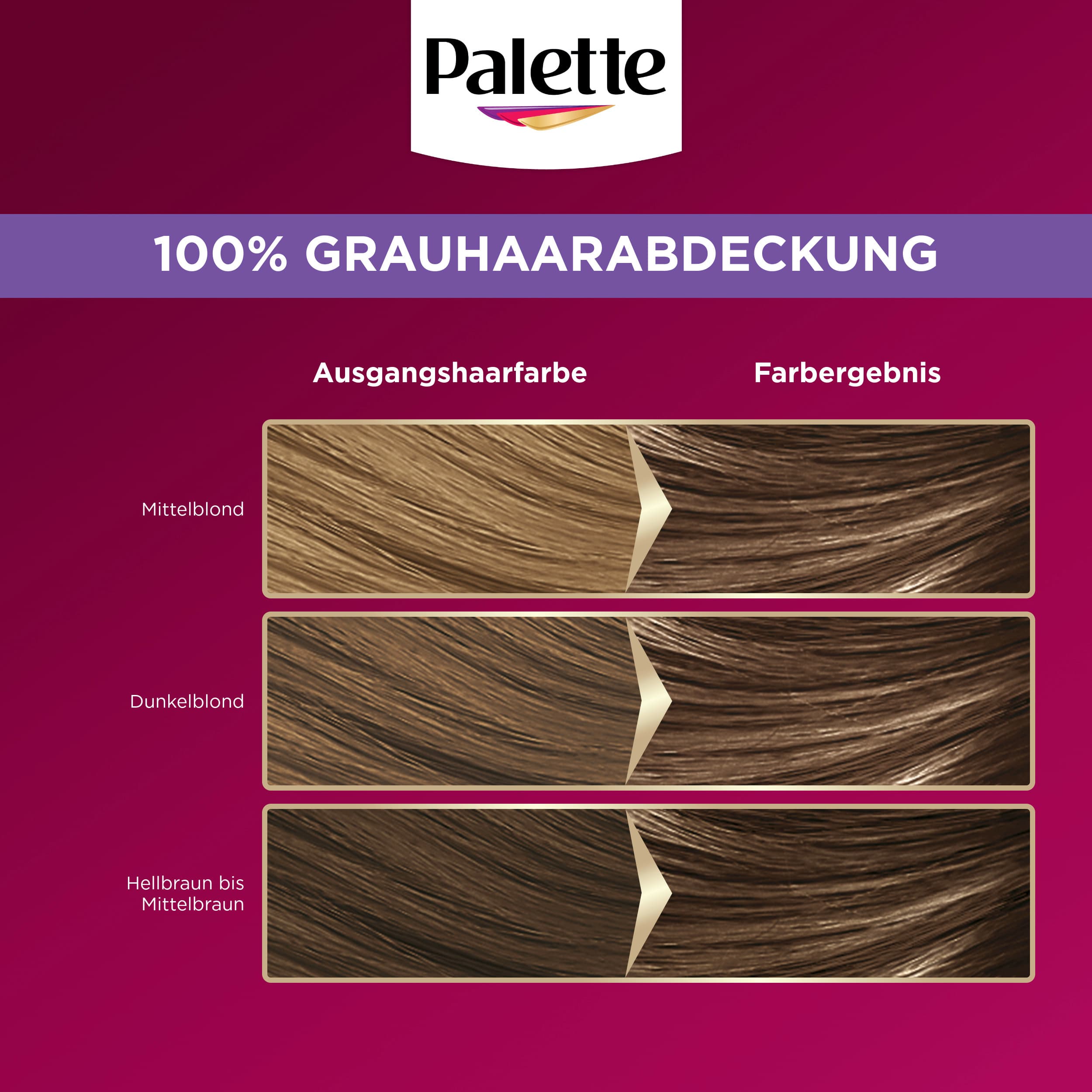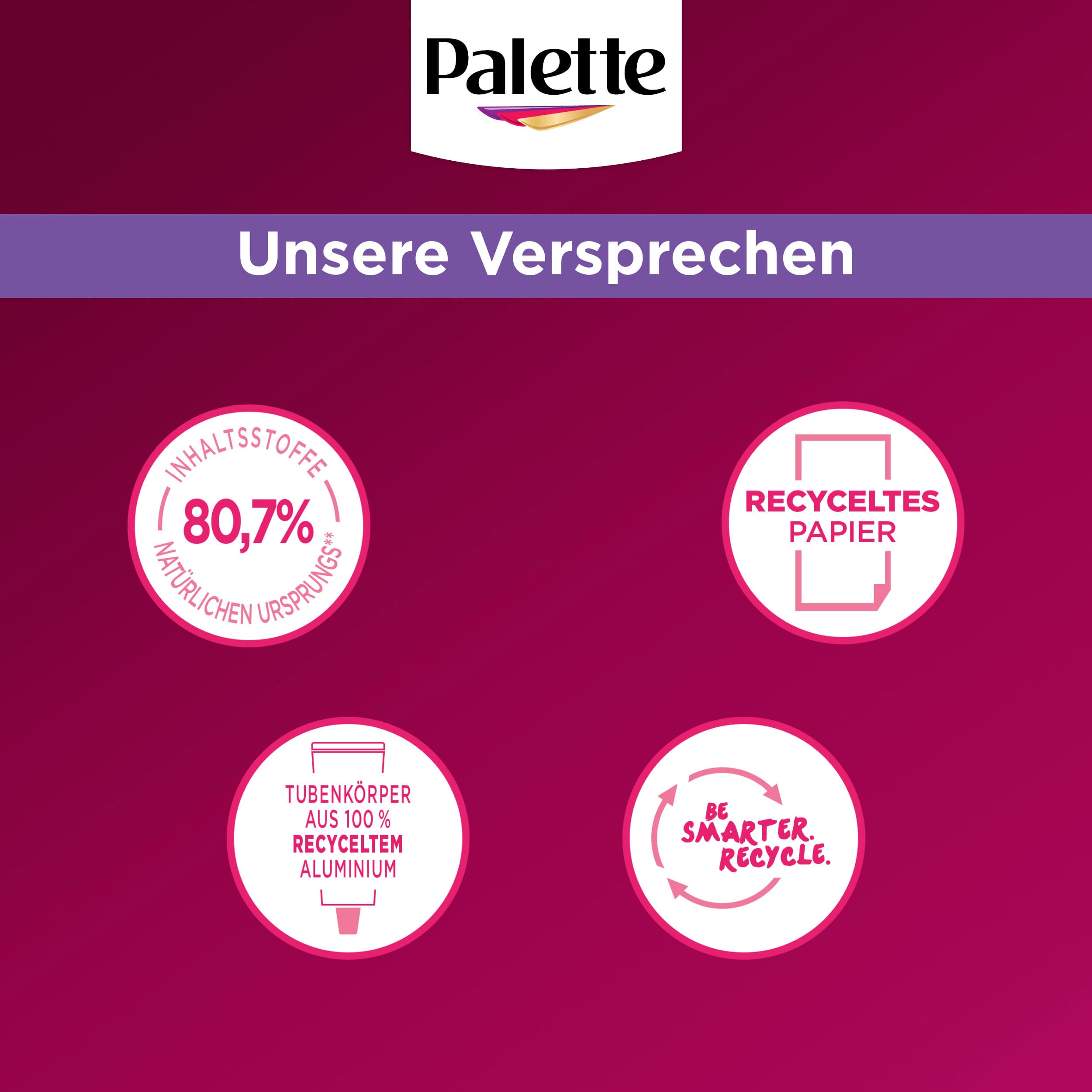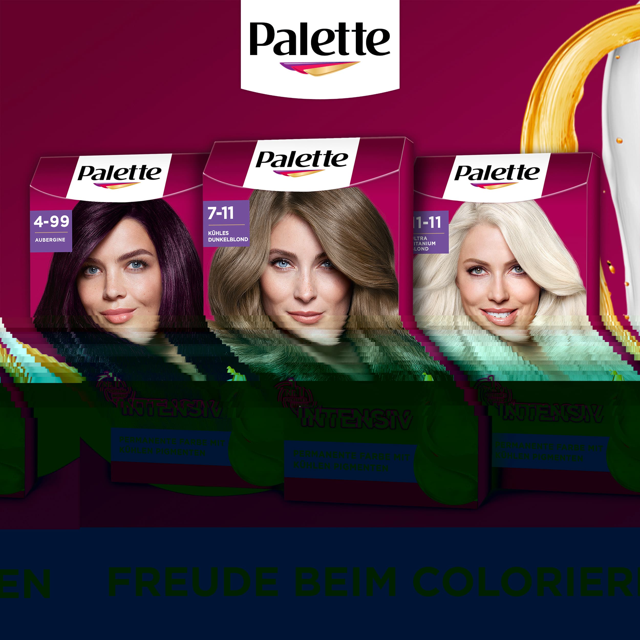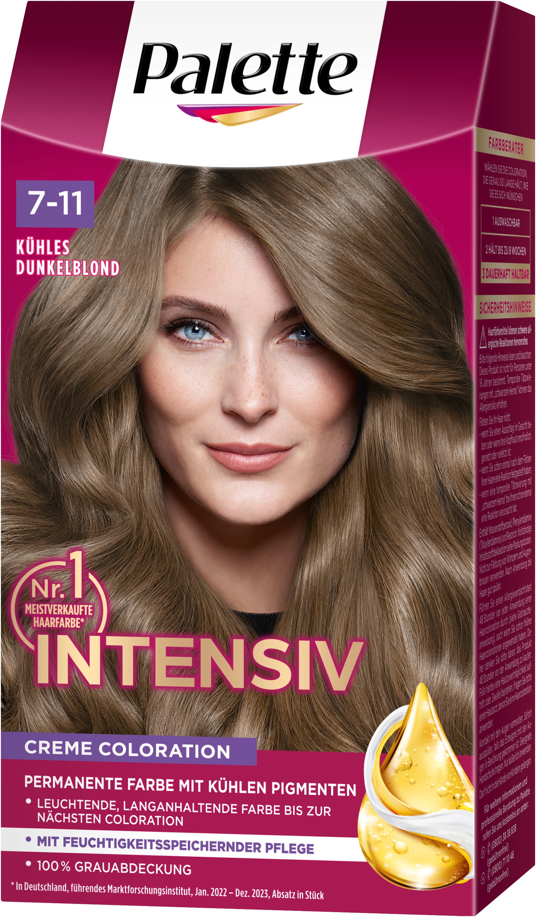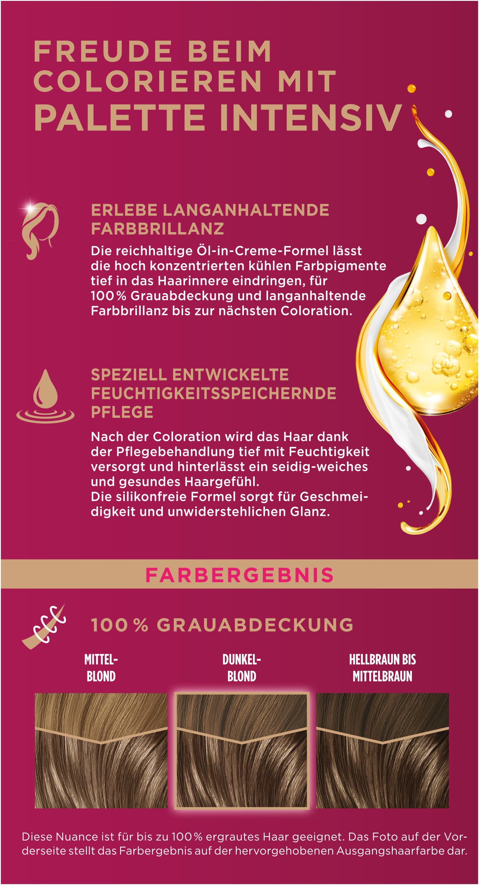 Palette Intensiv Creme Coloration – Color-Creme für leuchtende und langanhaltende FarbergebnisseDie Palette Intensiv Creme Coloration sorgt für leuchtende, langanhaltende Farbergebnisse, intensiven Farbglanz sowie perfekte Grauabdeckung. Die Color-Creme mit reichhaltiger Öl-in-Creme-Formel lässt die hoch konzentrierten Farbpigmente tief in das Haarinnere eindringen, für 100 % Grauabdeckung und eine langanhaltende Farbbrillanz bis zur nächsten Coloration.Zusätzlich ist die speziell entwickelte, feuchtigkeitsspendende Pflege der Haarfarbe silikonfrei und sorgt für Geschmeidigkeit und unwiderstehlichen Glanz. Das Haar wird dank der Pflegebehandlung tief mit Feuchtigkeit versorgt und hinterlässt ein seidig-weiches und gesundes Haargefühl.Die Produktvorteile im Detail:Leuchtende, langanhaltende FarbeAusdrucksstarkes Farbergebnis bis zur nächsten Coloration100 % GrauabdeckungFeuchtigkeitsspeichernde Pflege für Geschmeidigkeit&GlanzAnwendung:1. Den Inhalt der Palette Color-Creme in die Applikatorflasche mit Entwicklerlotion geben und gut mischen.2. Trage die Mischung mit der Applikatorflasche auf das trockene Haar auf und lasse das Produkt 30 Minuten einwirken (für die Farbtöne 11-11, 10-91, 10-1, 10-0: 35-45 Minuten)3. Mit lauwarmem Wasser gut ausspülen, bis das Wasser klar ist. Anschließend die in der Packung enthaltene Pflegebehandlung verwenden.