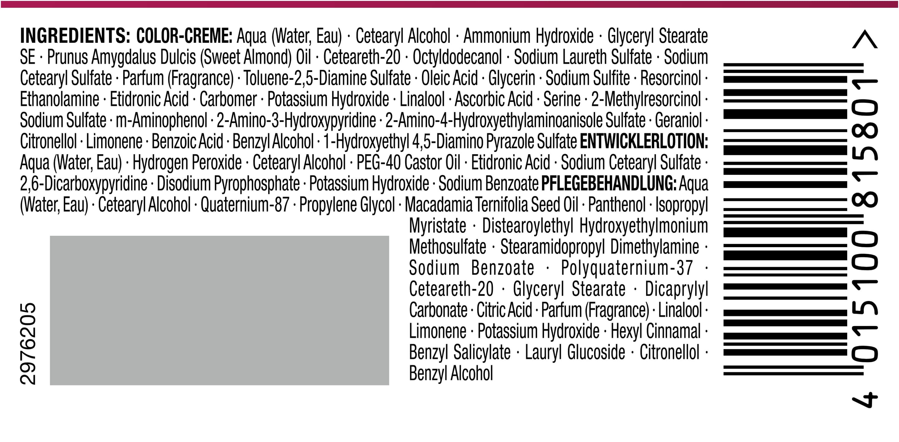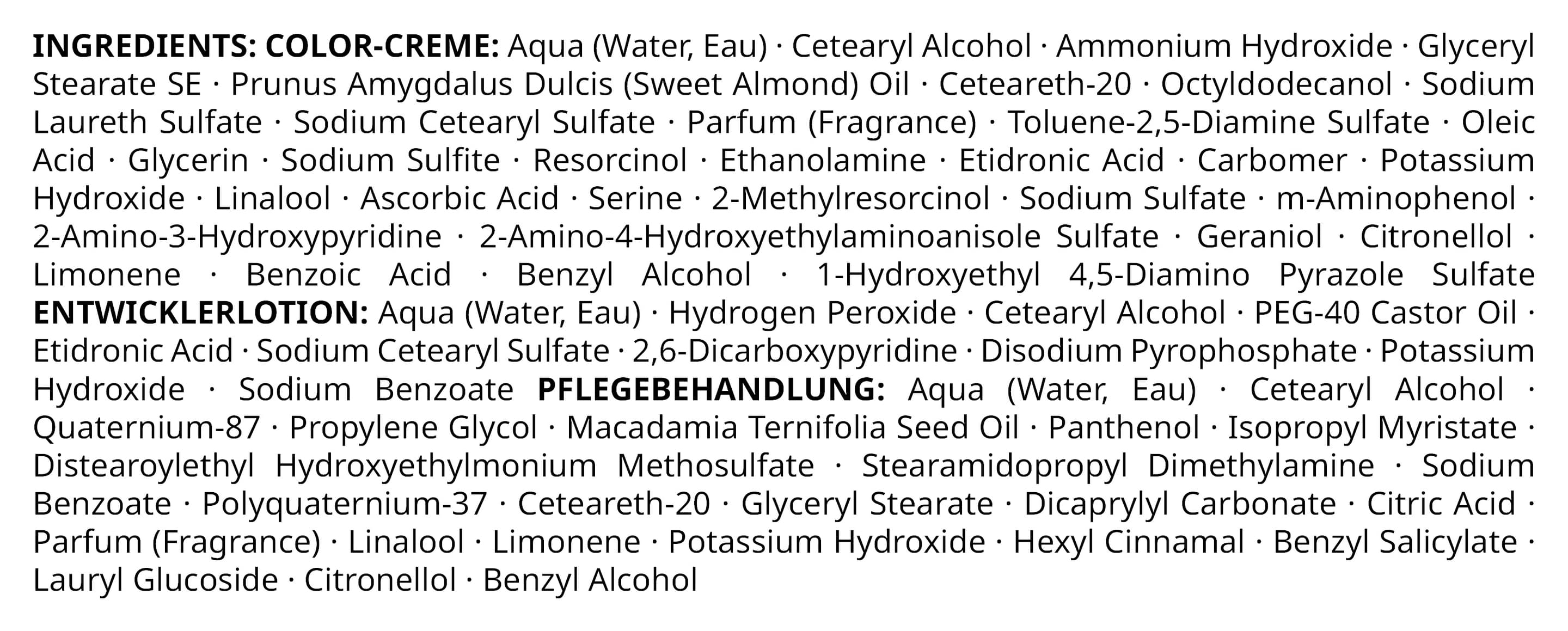 Inhaltsstoffe Color-Creme: Aqua (Water, Eau), Cetearyl Alcohol, Ammonium Hydroxide, Glyceryl Stearate SE, Prunus Amygdalus Dulcis (Sweet Almond) Oil, Ceteareth-20, Octyldodecanol, Sodium Laureth Sulfate, Sodium Cetearyl Sulfate, Parfum (Fragrance), Toluene-2,5-Diamine Sulfate, Oleic Acid, Glycerin, Sodium Sulfite, Resorcinol, Ethanolamine, Etidronic Acid, Carbomer, Potassium Hydroxide, Linalool, Ascorbic Acid, Serine, 2-Methylresorcinol, Sodium Sulfate, m-Aminophenol, 2-Amino-3-Hydroxypyridine, 2-Amino-4-Hydroxyethylaminoanisole Sulfate, Geraniol, Citronellol, Limonene, Benzoic Acid, Benzyl Alcohol, 1-Hydroxyethyl 4,5-Diamino Pyrazole Sulfate|Entwicklerlotion: Aqua (Water, Eau), Hydrogen Peroxide, Cetearyl Alcohol, PEG-40 Castor Oil, Etidronic Acid, Sodium Cetearyl Sulfate, 2,6-Dicarboxypyridine, Disodium Pyrophosphate, Potassium Hydroxide, Sodium Benzoate|Pflegebehandlung: Aqua (Water, Eau), Cetearyl Alcohol, Quaternium-87, Propylene Glycol, Macadamia Ternifolia Seed Oil, Panthenol, Isopropyl Myri