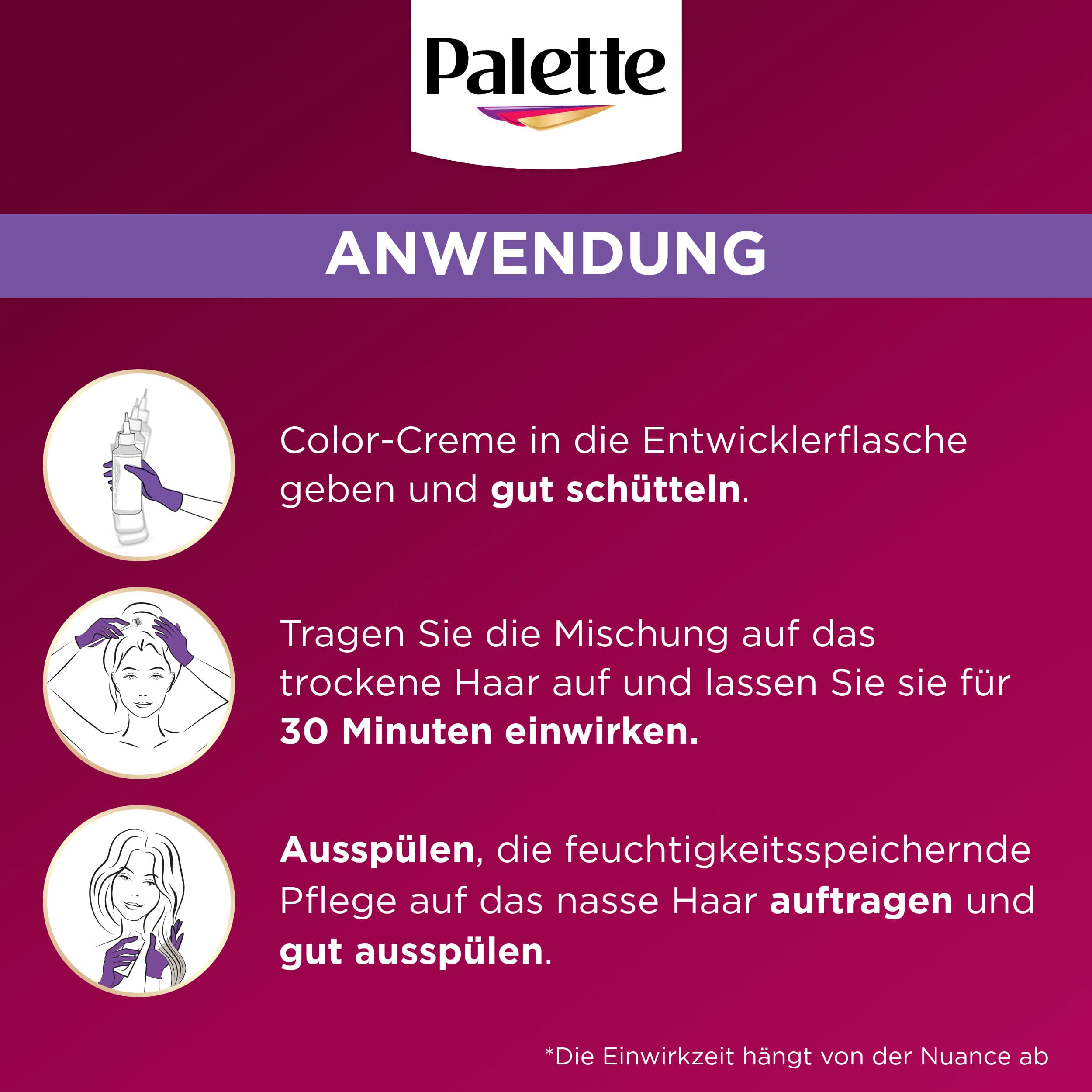 Anwendungshinweis1. Geben Sie den Inhalt der PALETTE Intensiv Creme Coloration in die Anwendungsflasche mit Entwicklerlotion und mischen Sie sie gut. 2. Tragen Sie die Mischung mit der Anwendungsflasche auf das trockene Haar auf und lassen Sie das Produkt 30 Minuten einwirken. Für die Nuancen 11-11, 10-91, 10-1, 10-0: Lassen Sie die Colorationsmischung 35–45 Minuten einwirken. 3. Mit lauwarmem Wasser gut ausspülen, bis das Wasser klar ist. Danach die Pflegebehandlung mit feuchtigkeitsspeichernder Pflege in das nasse Haar einarbeiten. 2 Minuten einwirken lassen und anschließend gründlich ausspülen.