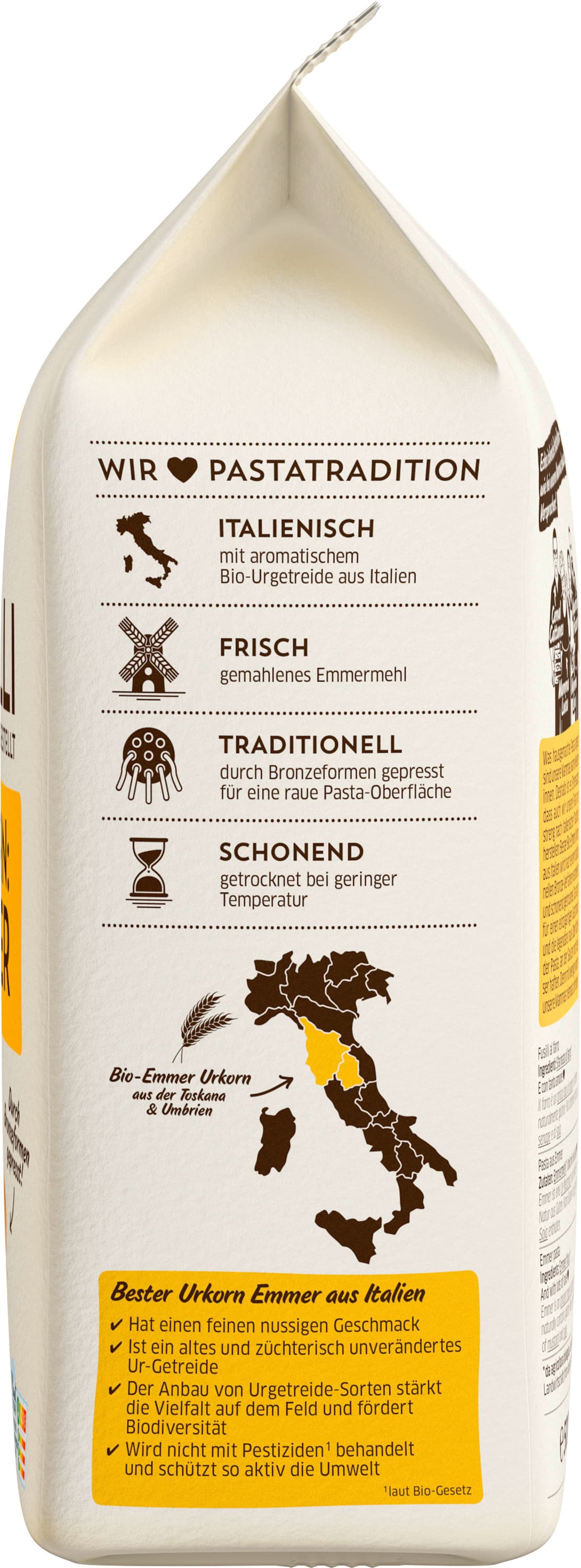 Die weltweit erste klimapositive Pasta! Hergestellt mit aromatischem Bio Urkorn Emmer aus der Toskana&Umbrien und traditionell durch Bronzeformen gepresst. Emmer ist eines der ältesten Getreidesorten der Welt, hat einen feinen nussigen Geschmack und stärkt die biologische Vielfalt.