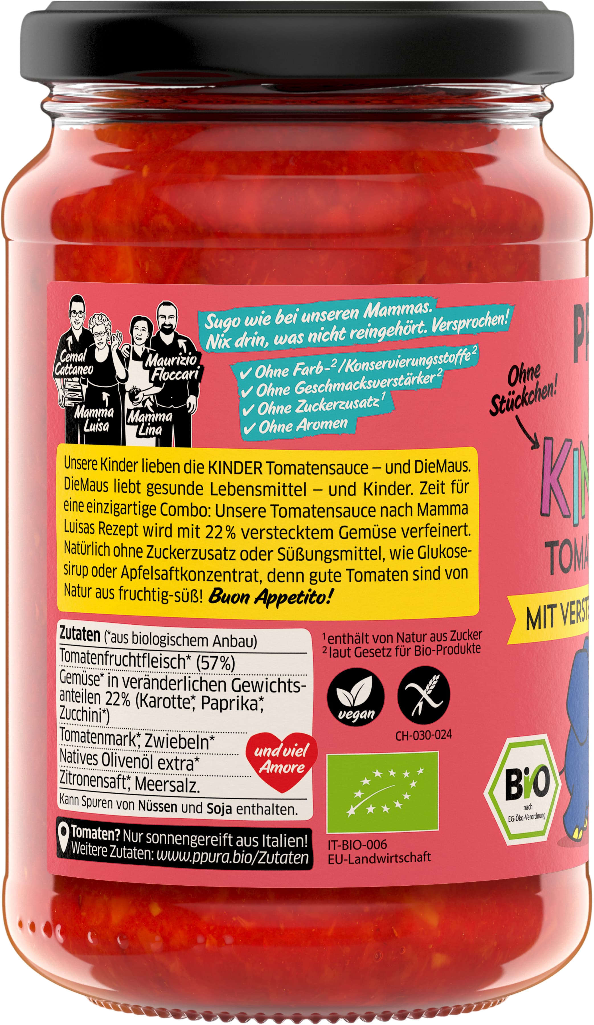 Unsere Kinder lieben die KINDER Tomatensauce - und DieMaus. DieMaus liebt gesunde Lebensmittel - und Kinder. Zeit für eine einzigartige Kombo: Die PPURA Tomatensauce nach Mamma Luisas Rezept wird mit 22% verstecktem Gemüse verfeinert. Natürlich ohne Zuckerzusatz oder Süßungsmittel, wie Glukosesirup oder Apfelsaftkonzentrat, denn gute Tomaten sind von Natur aus fruchtig-süß! Und natürlich ohne Stückchen und sichtbares Grünzeug.