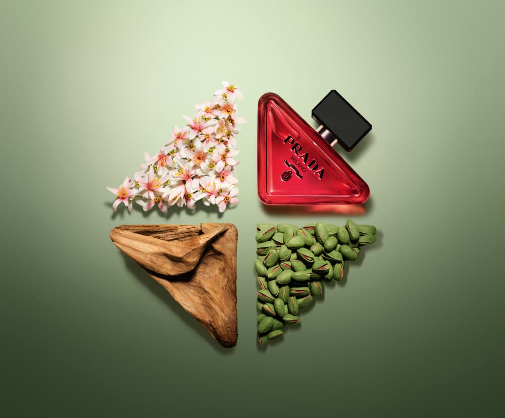 Paradoxe Radical Essence, der neue feminine Duft von Prada, überdenkt Gourmand-Düfte mit einer süchtig machenden Konzentration unerwarteter Noten. Die sinnliche, blumige Signatur wird neu interpretiert als süße, essbare Blume dank Neroliöl und Orangenblüten-Herz-Absolut. Die Herznote enthüllt einen unerwarteten gesalzenen Pistazienakkord mit süchtig machenden, gerösteten und salzigen Noten. In der Basisnote bringt ein kräftiger, cremiger Sandelholzakkord Raffinesse in diesen Gourmand-Duft und sorgt für eine sinnliche und moderne Note. Der minimalistische Flakon, inspiriert von Pradas ikonischem Dreieckslogo, wurde mit einer raffinierten tiefrosa Lackierung neu erfunden und spiegelt die maximale Intensität dieser Radical Essence wider. Er ist disruptiv so konzipiert, dass er auf der Seite liegt. Das Prada-Wappenlogo kontrastiert mit der Lackierung.