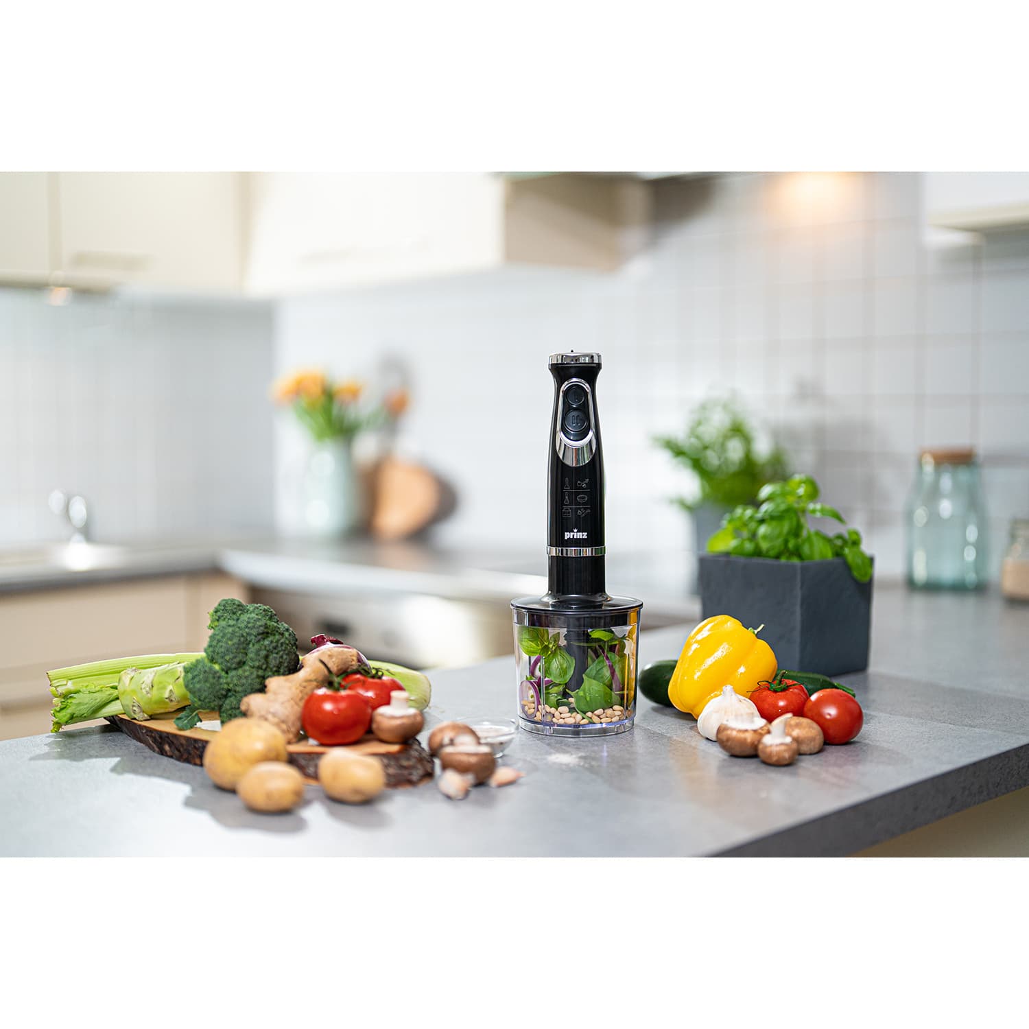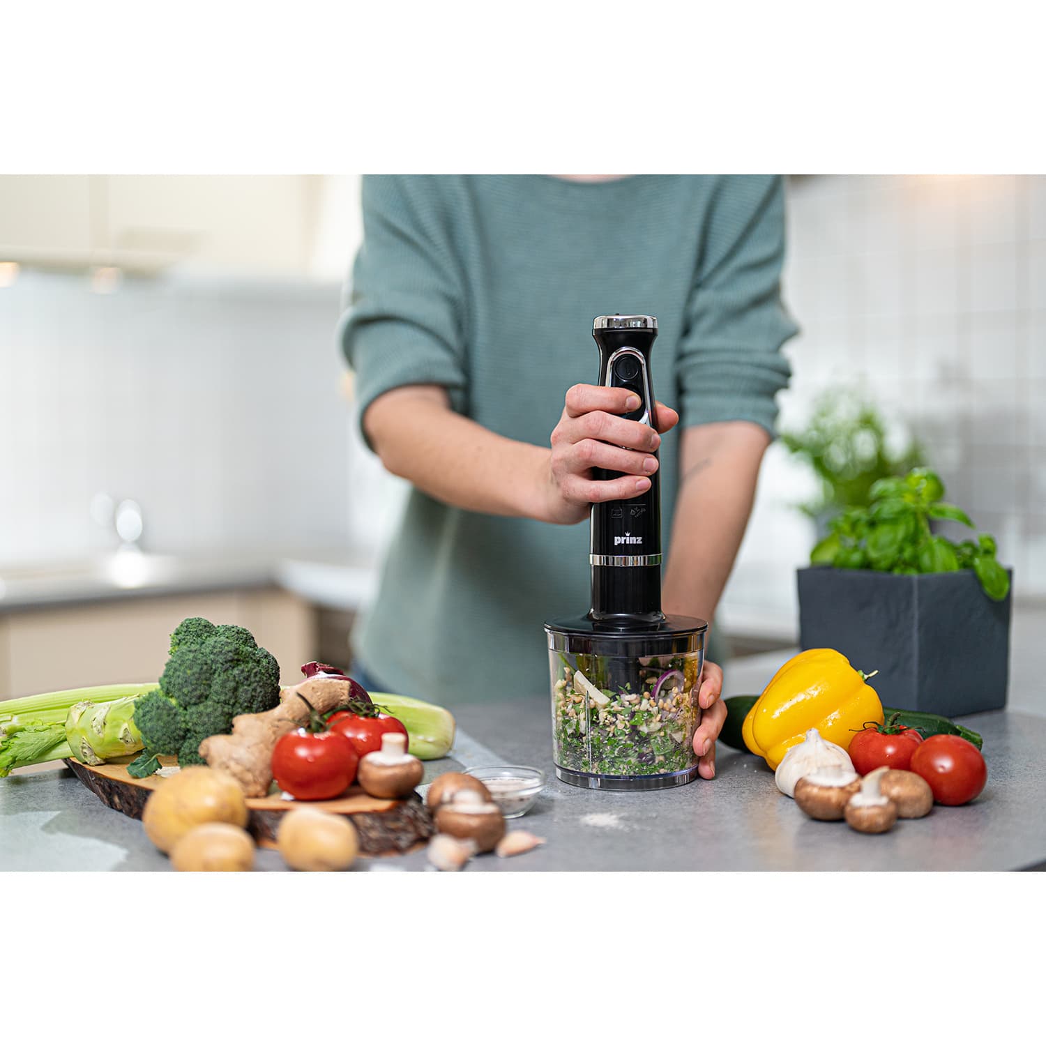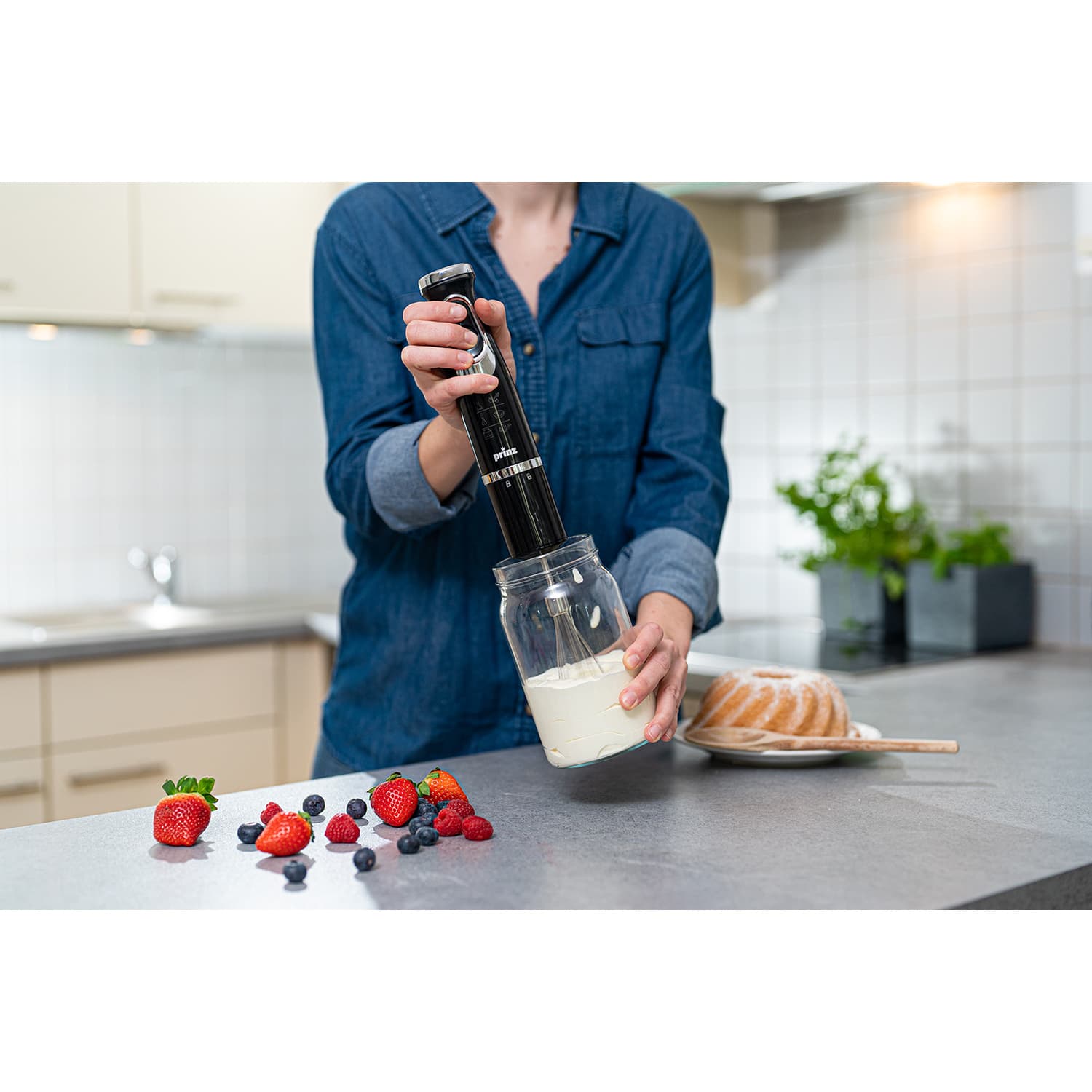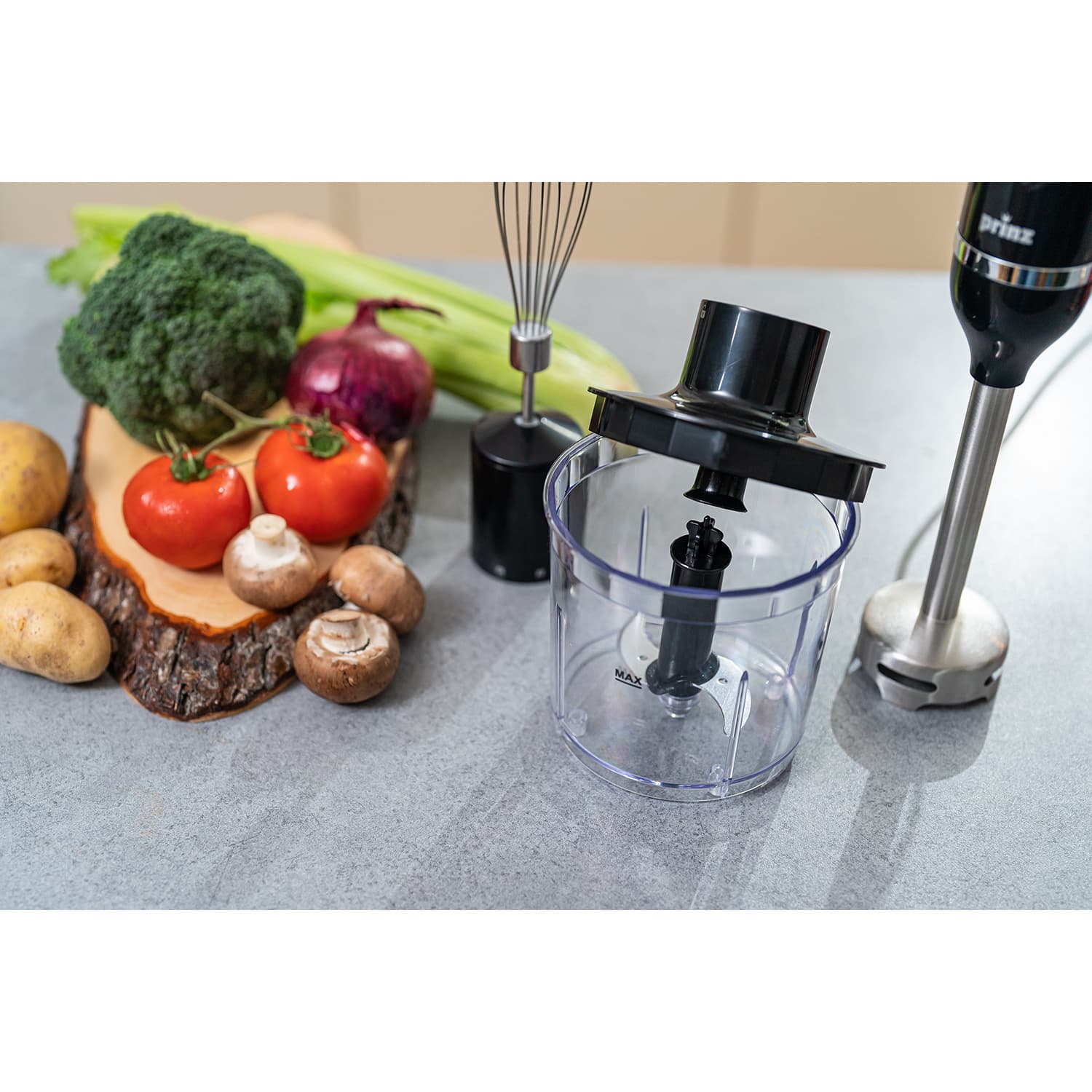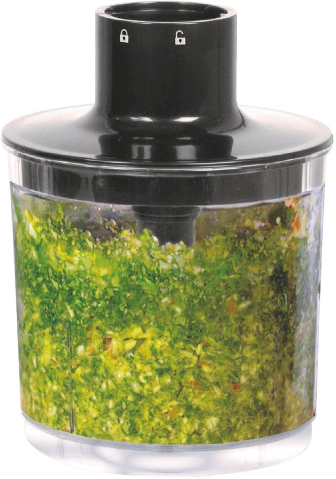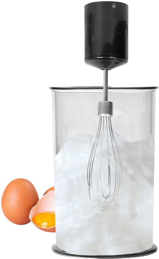 - Umfangreiches Zubehör: 400 ml Multizerkleinerer-Aufsatz, Schneebesenaufsatz