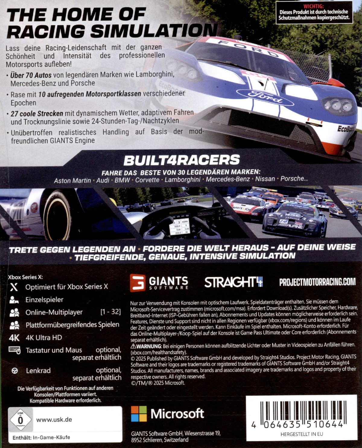 THE HOME OF RACING SIMULATON Project Motor Racing entfacht die ganze Leidenschaft, Schönheit und Intensität des professionellen Motorsports. Mit den kultigsten Autos, Klassen und Strecken, spannendem Gameplay und neuen Maßstäben in Sachen Steuerkontrolle, die auf der mod-freundlichen GIANTS Engine basiert, ist dies die neue Heimat der Rennsimulation. Rase mit 72 akribisch nachgebauten Autos über 10 ikonische Klassen und 29 globale Strecken durch die Epochen. • Autos: Von den radikalen LMDh-Hypercars von heute bis zu den kultigsten Legenden der Geschichte: jedes Fahrzeug ist ein lizenziertes Meisterwerk • Strecken: Gescannt für ultimative Präzision und Authentizität Rennsport für alle, von Sim-Rennfahrern bis hin zu Renneinsteigern bietet Project Motor Racing: • Einzelspieler-Karriere • Online-Rennmodi • Ingame-Events • Vollgepackte 4-Klassen-Rennerfahrung Simulation mit Finesse • First Principle Physics: Die neue Physik-Engine sorgt für unübertroffen realistische Steuerkontrolle und originalgetreue FFB • Physik-Engine die Maßstäbe setzt, auf Basis der mod-freundlichen GIANTS Engine 10 • Factory-Driver-Programm: Die Steuerkontrolle jedes Fahrzeugs wird von Markenpartnern und Hunderten von Top-Rennfahrern aus aller Welt sorgfältig getestet und freigegeben, um eine authentische Fahrpräzision zu gewährleisten • Immersives Sound-Design: Die Wildheit des Motorsports wird wie nie zuvor eingefangen Spüre jede Sekunde • „Lebendige“ Cockpits mit sichtbaren G-Kräften, Hitzeschleier, etc. • True2Track • Dynamische Wetterbedingungen • Adaptives Fahren & Trocknungslinie • 24-Stunden Tag/Nacht-Zyklus