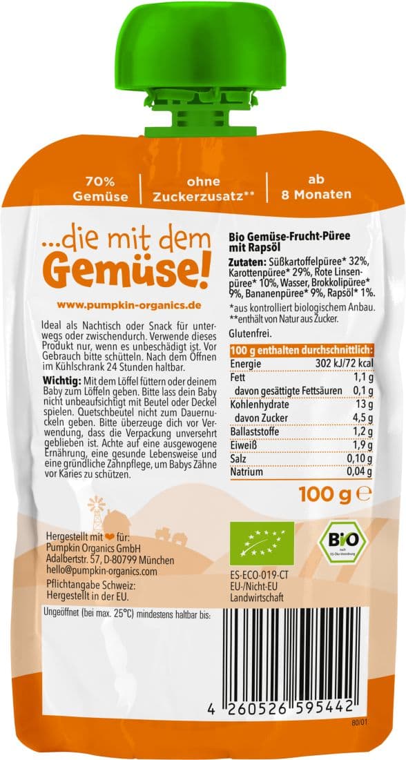 pumpkin organics Bio Quetschie Süßkartoffel, Karotte, Linsen, Brokkoli, Banane