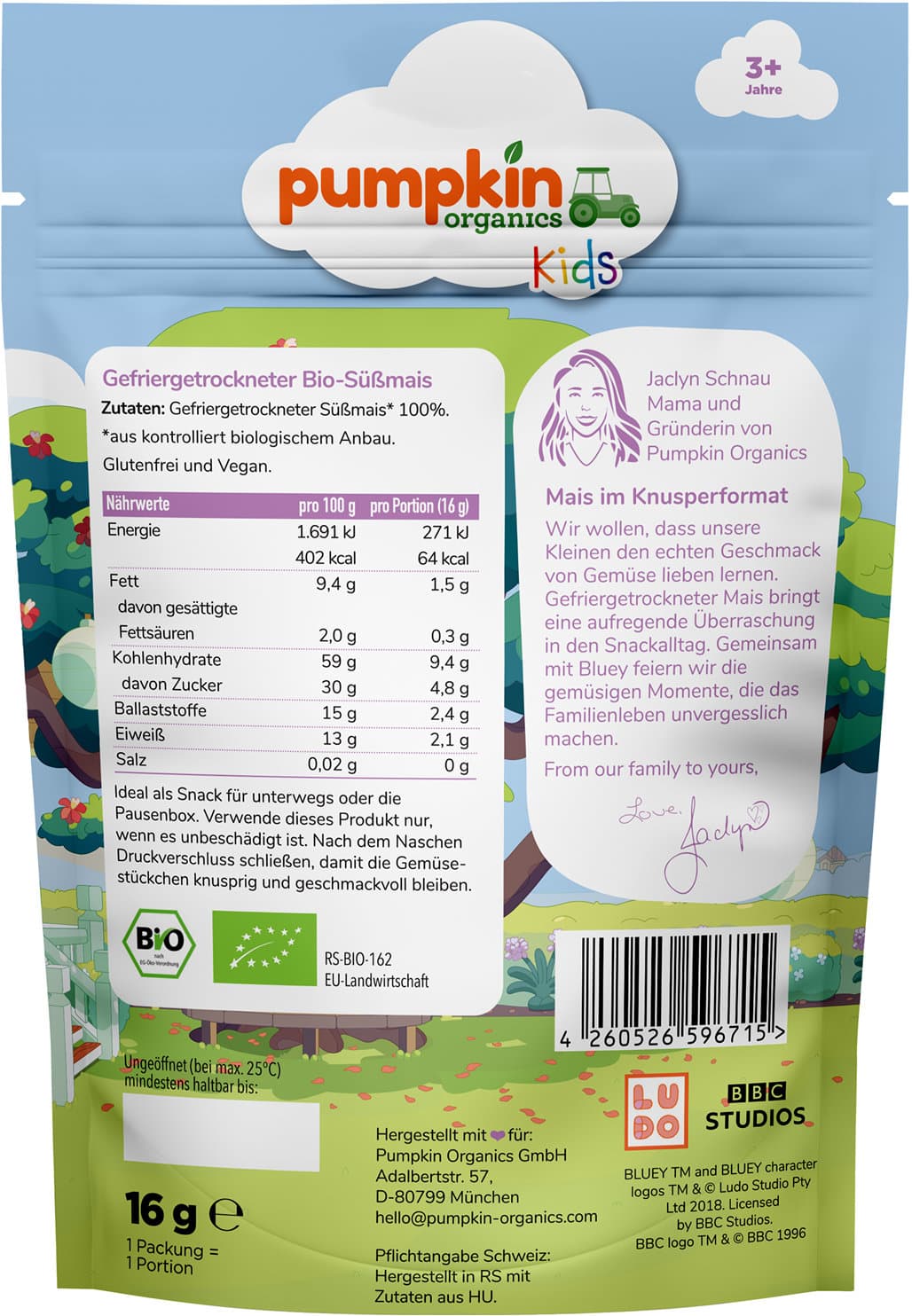 | Zutaten | Gefriergetrockneter Süßmais* 100%. * aus kontrolliert biologischem Anbau. **enthält von Natur aus Zucker Glutenfrei und Vegan |