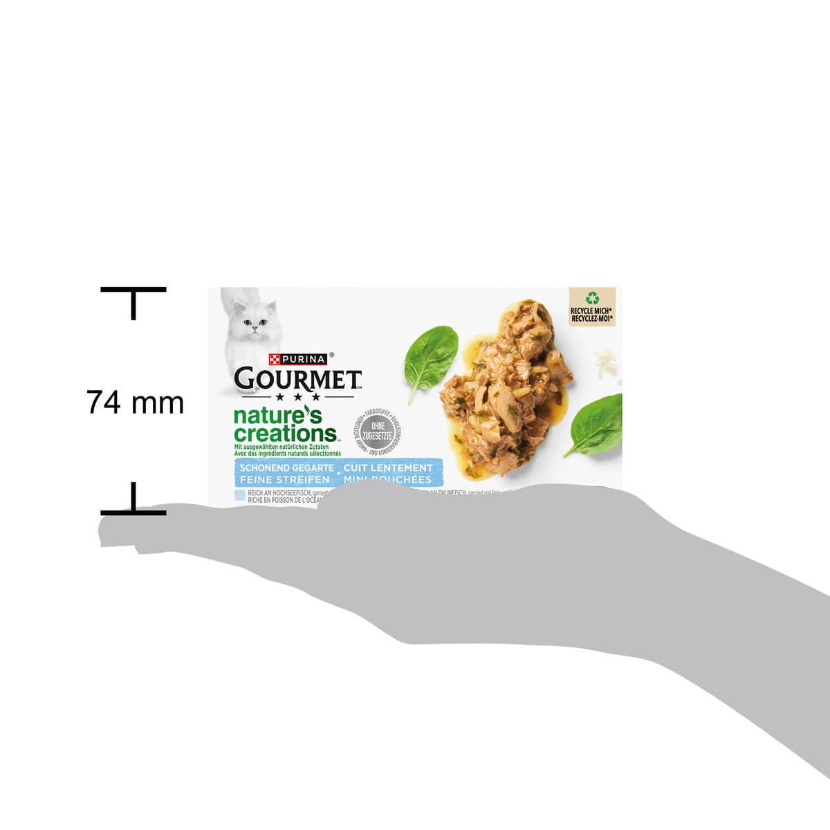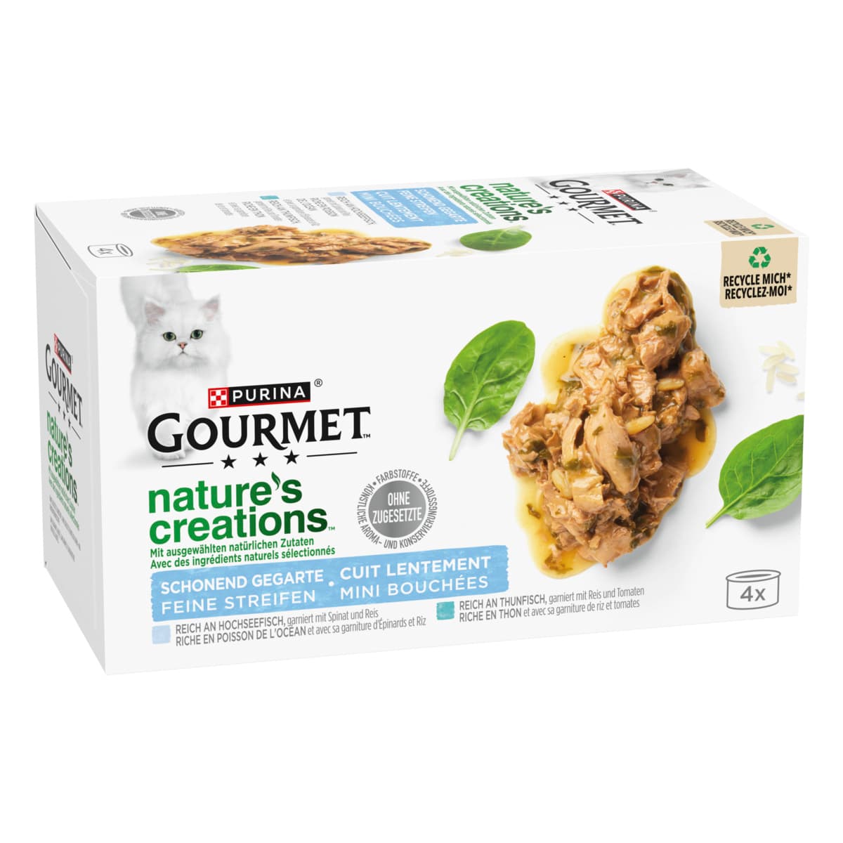 GOURMET™ Natures Creations bietet eine Auswahl köstlicher, von der Natur inspirierter Rezepte. Jedes Menü wurde sorgfältig mit ausgewählten hochwertigen und natürlichen Zutaten hergestellt, fachmännisch gekocht und ist reich an Fisch und ganiert mit Gemüse. Die erlesenen Rezepturen lassen Ihre anspruchsvolle Katze jeden Bissen mit Freude und Begeisterung genießen. - Alleinfuttermittel für ausgewachsene Katzen - Schonend gegarte Feine Streifen - Reich an Hochseefisch, garniert mit Spinat und Reis bzw. Reich an Thunfisch, garniert mit Reis und Tomaten - Mit ausgewählten natürlichen Zutaten - Erste Zutat: Hochseefisch bzw. Thunfisch - Ohne zugesetzte Farbstoffe. Ohne zugesetzte künstliche Aroma- und Konservierungsstoffe.