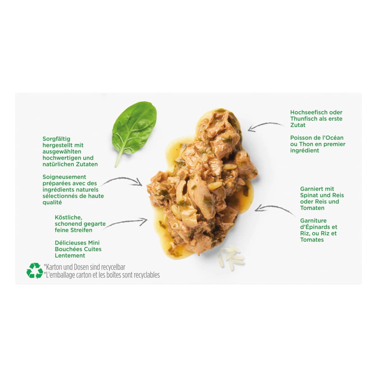 | Zusammensetzung (Futter) | Hochseefisch: Fisch und Fischnebenerzeugnisse* (14% Hochseefisch), Fleisch und tierische Nebenerzeugnisse*, Pflanzliche Eiweißextrakte, Mineralstoffe, Getreide* (0,5% Reis), Pflanzliche Nebenerzeugnisse, Gemüse* (0,3% dehydrierter Spinat, entspricht 2,7% Spinat), Zucker. *Natürliche Zutaten. Thunfisch: Fisch und Fischnebenerzeugnisse* (14% Thunfisch), Fleisch und tierische Nebenerzeugnisse*, Pflanzliche Eiweißextrakte, Gemüse* (0,7% dehydrierte Tomaten, entspricht 6,3% Tomaten), Mineralstoffe, Getreide* (0,5% Reis), Pflanzliche Nebenerzeugnisse, Zucker.*Natürliche Zutaten. |