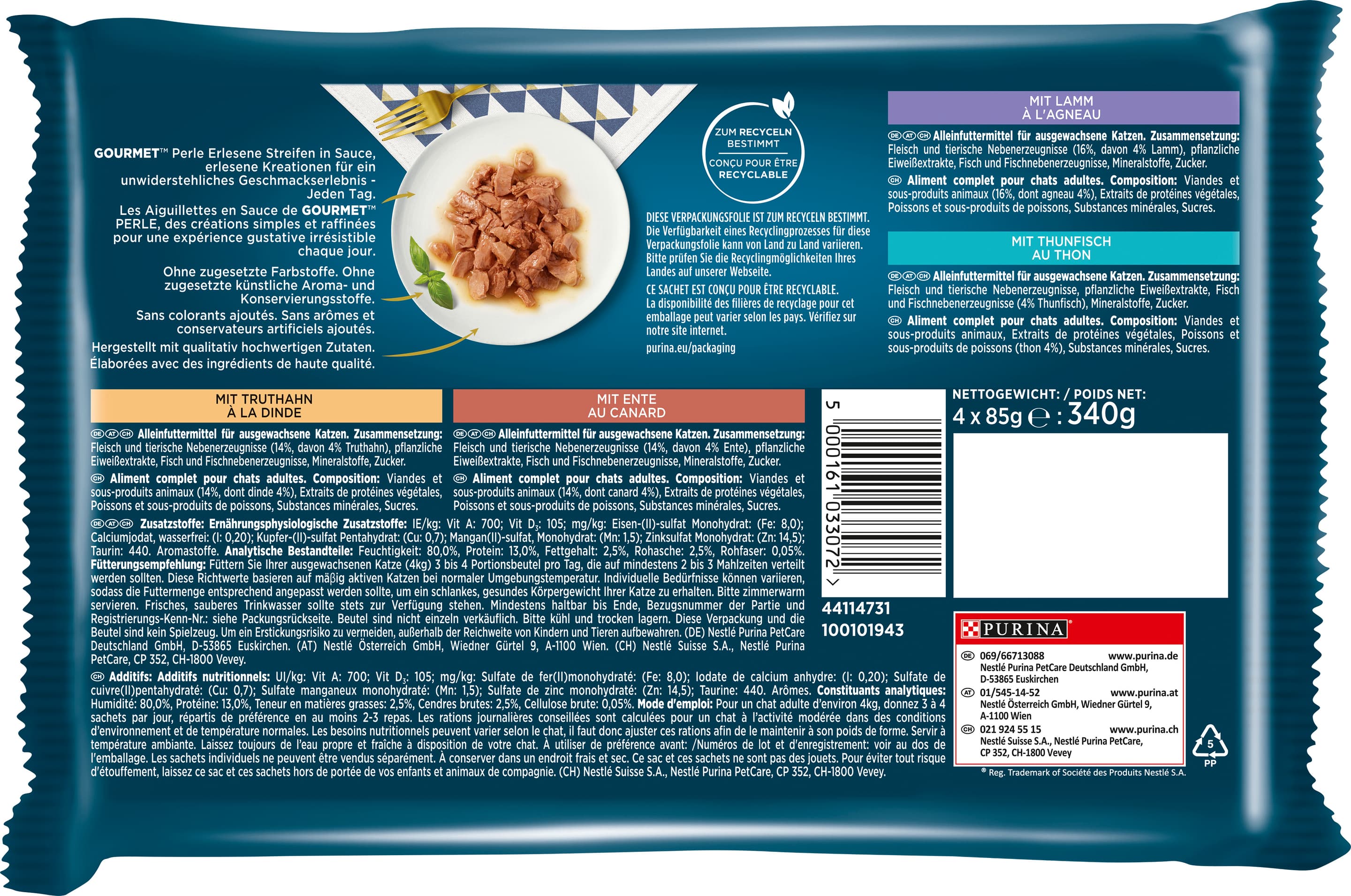 PURINA GOURMET Perle Erlesene Streifen in Sauce mit Truthahn/Lamm/Ente/Thunfisch