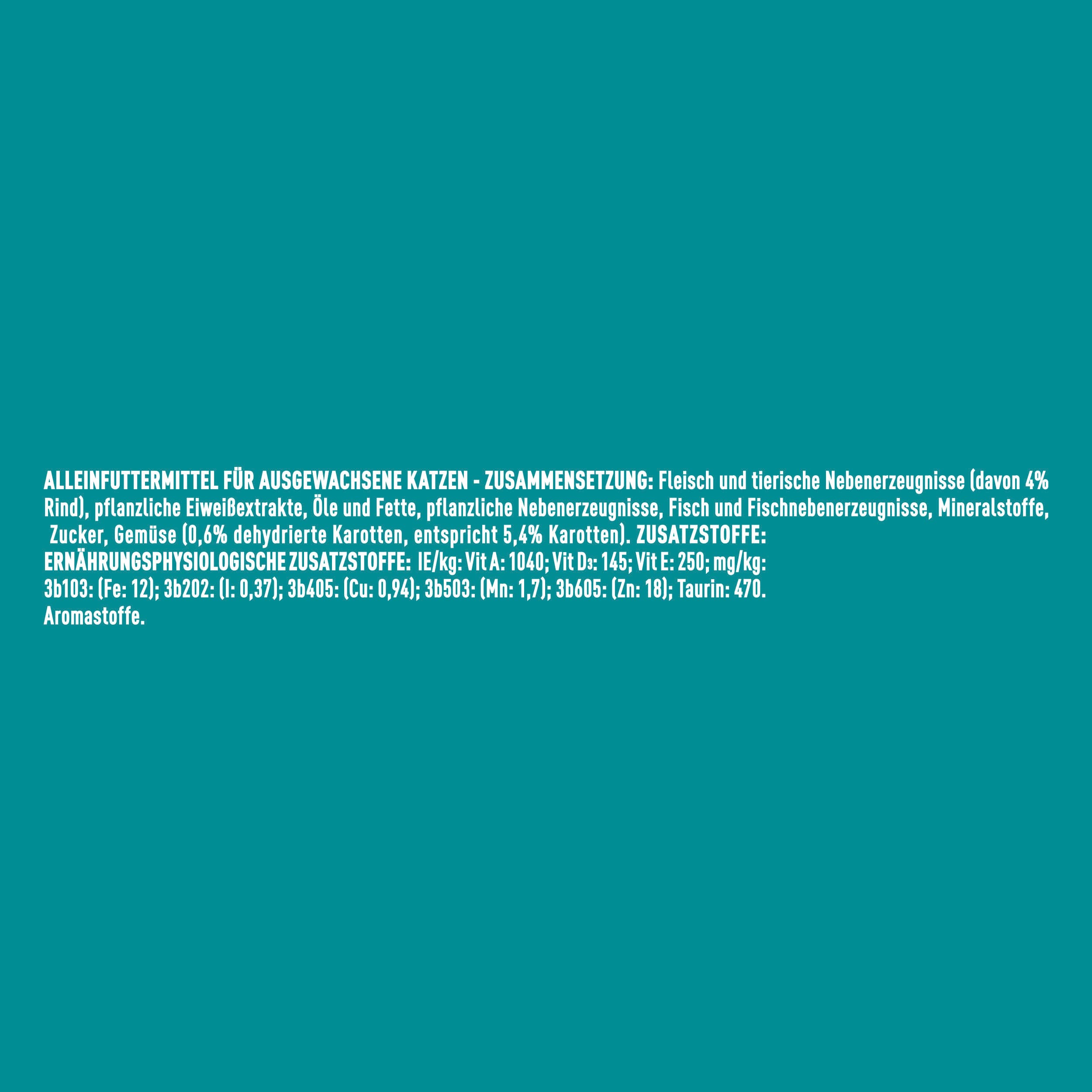 Zusammensetzung (Futter)Zusammensetzung: Fleisch und tierische Nebenerzeugnisse (davon 4% Rind), pflanzliche Eiweissextrakte, Fisch und Fischnebenerzeugnisse, Mineralstoffe, pflanzliche Nebenerzeugnisse, Öle und Fette, Gemüse (0,6% getrocknete Karotten, entspricht 5,4% Karotten), Zucker.