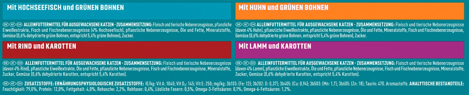 Zusammensetzung (Futter)mit Lamm und Karotten: Fleisch und tierische Nebenerzeugnisse (davon 4% Lamm), pflanzliche Eiweißextrakte, pflanzliche Nebenerzeugnisse (0,55% Inulin), Öle und Fette, Fisch und Fischnebenerzeugnisse, Mineralstoffe, Zucker, Gemüse (0.6% dehydrierte Karotten, entspricht 5,4% Karotten). mit Rind und Karotten: Fleisch und tierische Nebenerzeugnisse (davon 5% Rind), pflanzliche Eiweißextrakte, pflanzliche Nebenerzeugnisse (0,55% Inulin), Öle und Fette, Fisch und Fischnebenerzeugnisse, Mineralstoffe, Zucker, Gemüse (0,6% dehydrierte Karotten, entspricht 5,4% Karotten). mit Hochseefisch und grünen Bohnen: Fleisch und tierische Nebenerzeugnisse, pflanzliche Eiweißextrakte, Fisch und Fischnebenerzeugnisse (Hochseefisch 4%), pflanzliche Nebenerzeugnisse (Inulin 0,55%), Öle und Fette, Mineralstoffe, Gemüse, (0,6% dehydrierte grüne Bohnen, entspricht 5,4% grüne Bohnen), Zucker. mit Huhn und grünen Bohnen: Zusammensetzung: Fleisch und tierische Nebenerzeugnisse (davon 4% Huhn), pflanzliche Eiweißextrakte, pflanzliche Nebenerzeugnisse (0,55% Inulin), Öle und Fette, Fisch und Fischnebenerzeugnisse, Mineralstoffe, Gemüse (0,6% dehydrierte grüne Bohnen, entspricht 5,4% grüne Bohnen), Zucker.